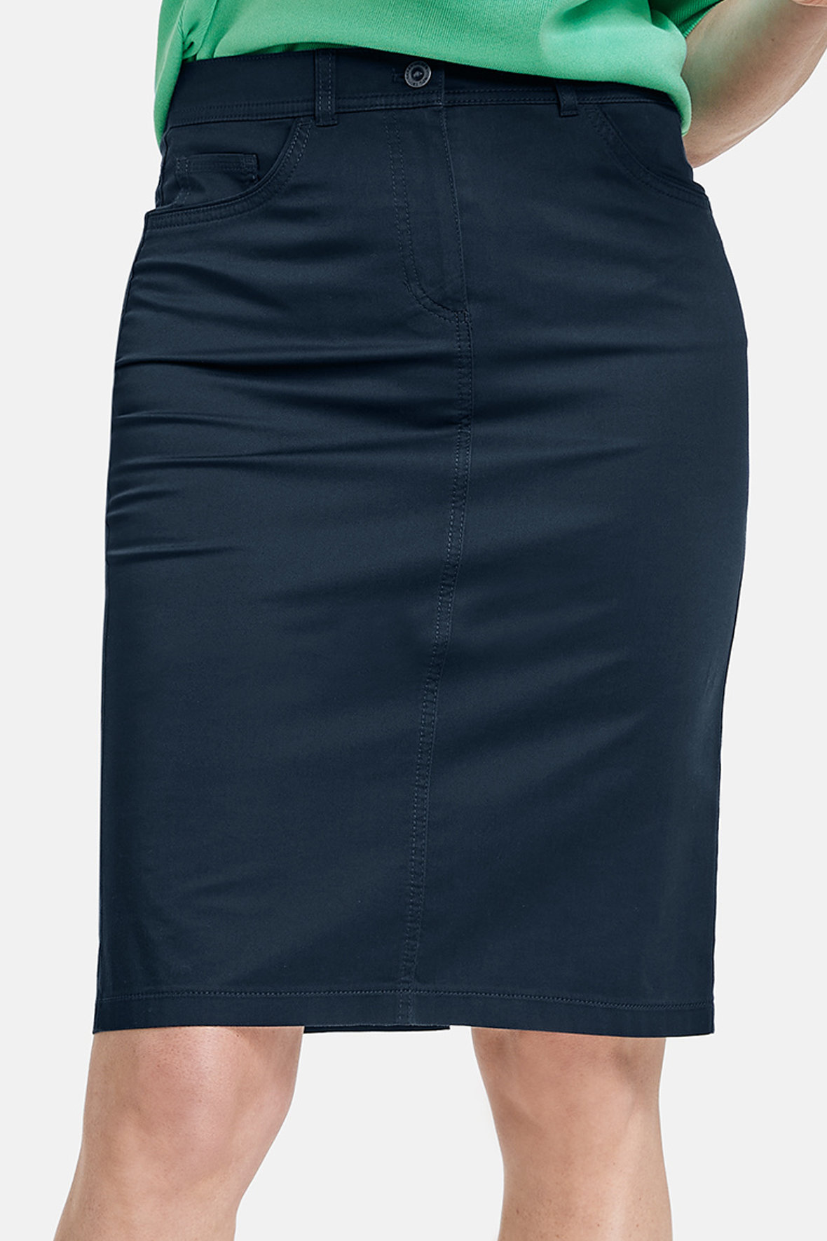 Sommer nederdel i meget strækbar tekstil som også er kuffert venlig. Med fast linning der dog giver sig en anelse ;-) den har bæltestropper samt lukkes med knap og lynlås. Med fem lommer og alle stikninger er tone i tone. Den er knælang, sidder fantastisk og giver altså en flot figur. Den vinder helt klart når den kommer på. Den er med skjult slids bagpå. Fra Edition serien i temaet Edition Undersea.
