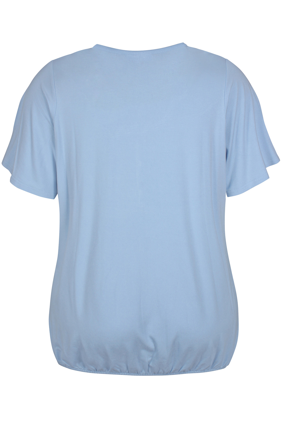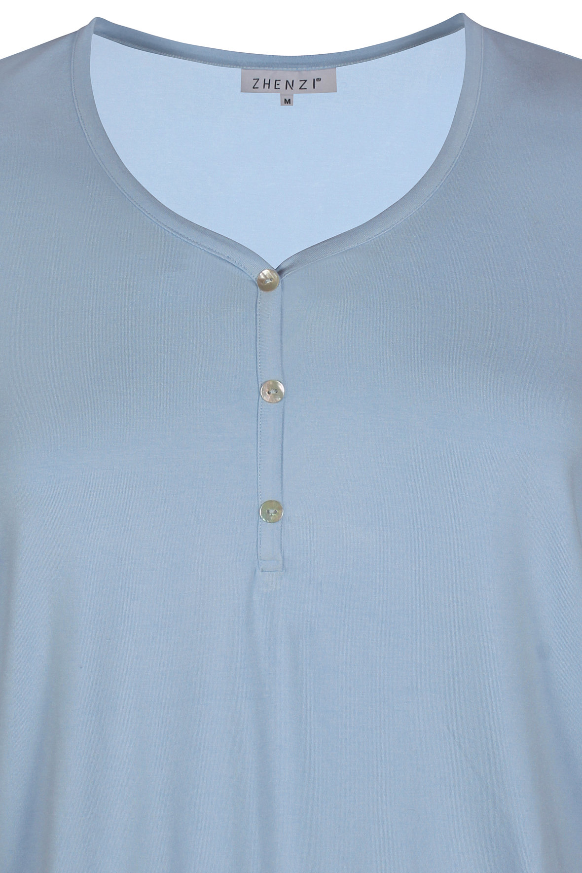 Rigtig dejlig bluse i t-shirt kvalitet. Ærmerne er korte og med god vidde i ærmegab. Halsudskæringen er rund og med knapstolpe. Pasformen er løs og afslappet samt med elastik nederst ved hoften. Billedet af den sorte er blot sat på her for at vise den på kroppen.