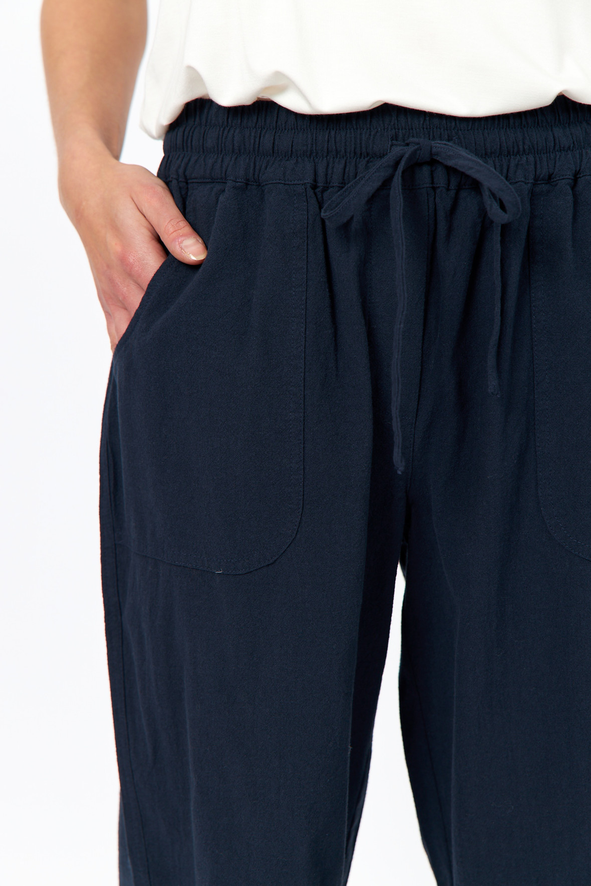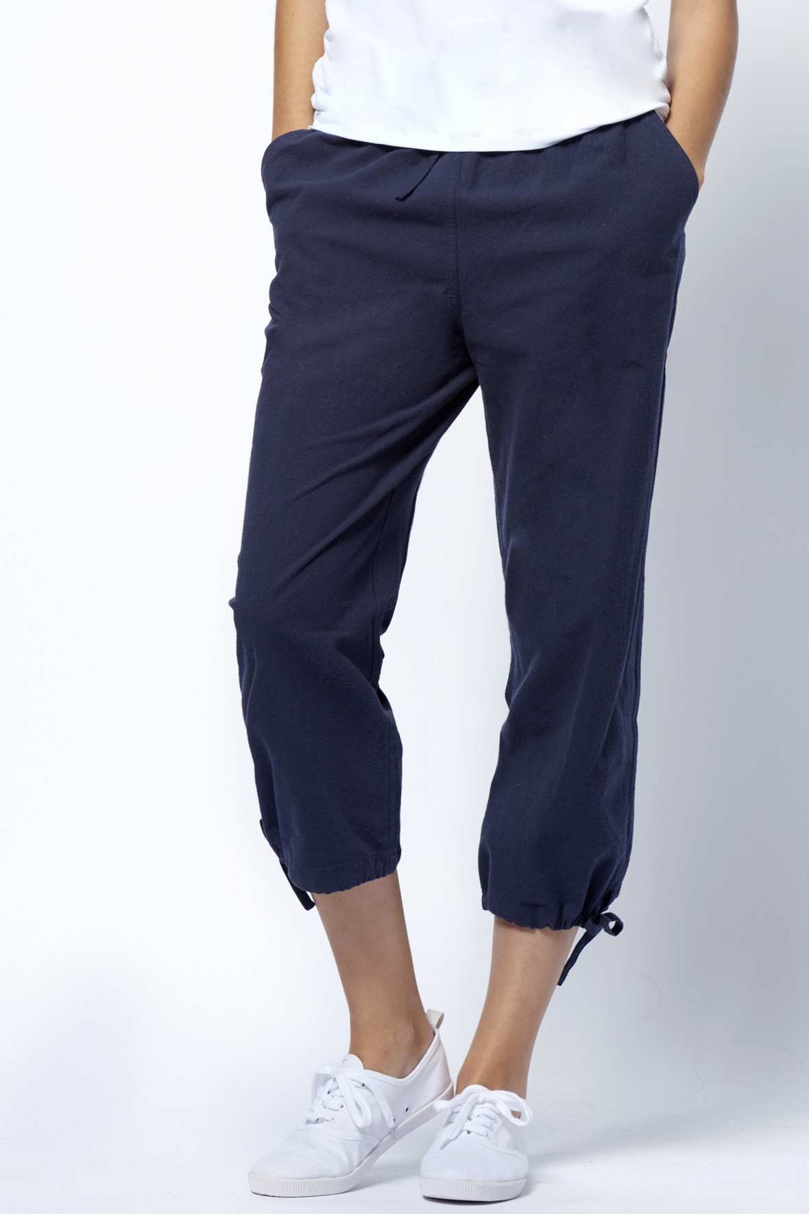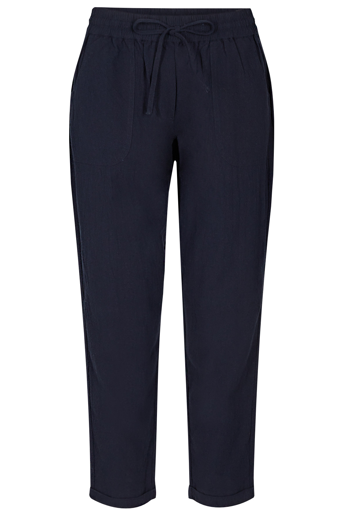 7/8 dels stumpebukser i den vanlige - og for mange højt elskede kvalitet. Med elastisk linning med snører. Der er påsyede lommer for og bag. Kvaliteten er let og sommerlig med ru overflade. Med fast op smøg på bukseben. Casual og løst snit.