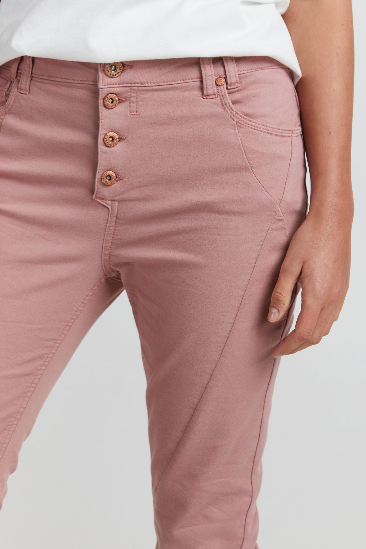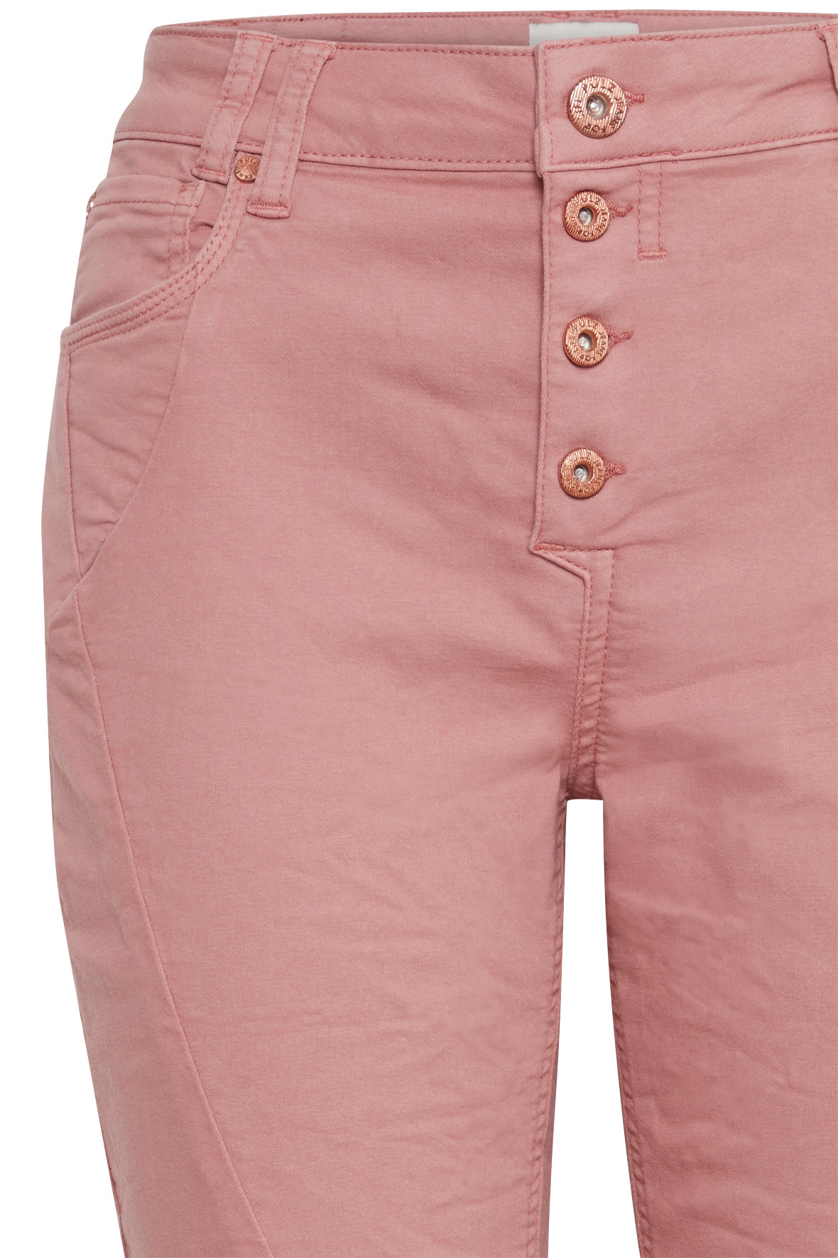 Uha de er fede de her Pulz jeans, pz Rosita Pant Skinny Leg hedder den så smukt og er dusch rosa. Den er så fed og kan en masse. Den er med skinny fit pasform der sidder til på ben og taljen er normal/middel høj. Den har 7/8 dels længde. Den har masser af stræk, også i linning hvor at den er med bæltestropper samt har knaplukke med 4 fede kobber logo knapper. Med five pockets med kobber nitter. Alle stikninger er tone i tone og der er krummelure syninger på lår/lommer foran og så har den lidt krøl tilføjet for og bag fra knæ og ned - det ser så cool ud. Den ligger i mange farver. BCI mærket bomuld.