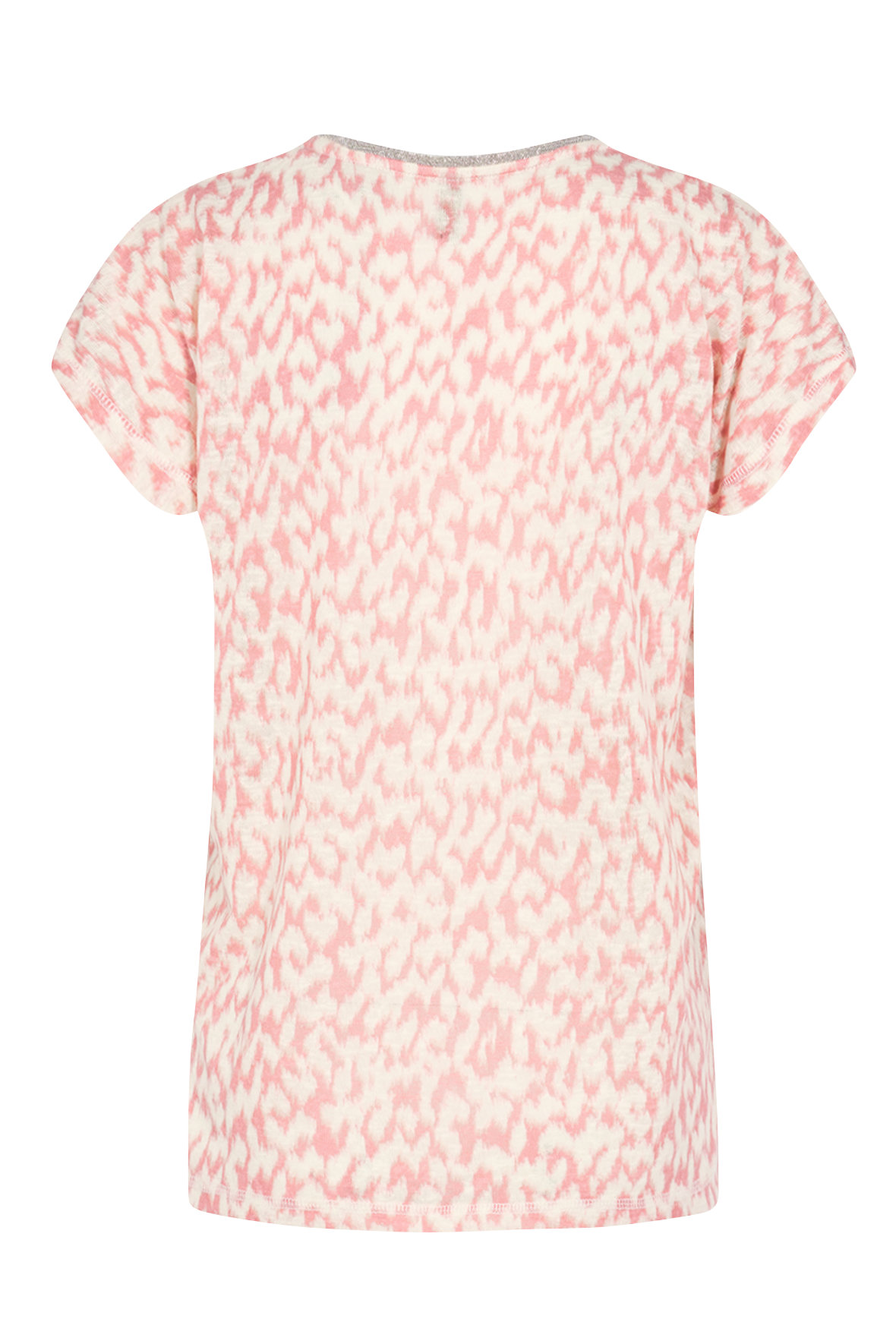 SoyaConcept sc-Aretha er en lækker style om end at den er meget svær at tage billeder af. Den er med løs pasform med flot sky lignende farvet mønster der er opkradset og blød. Ærmerne er helt korte med drop down skuldre samt feminin V-udskæring i hals med sølvkant. Det er en casual style der er så dejlig. Den er off white/beige i bunden der er svagt transparent og med rosa mønster.