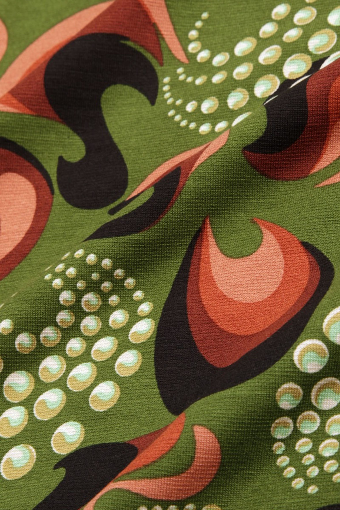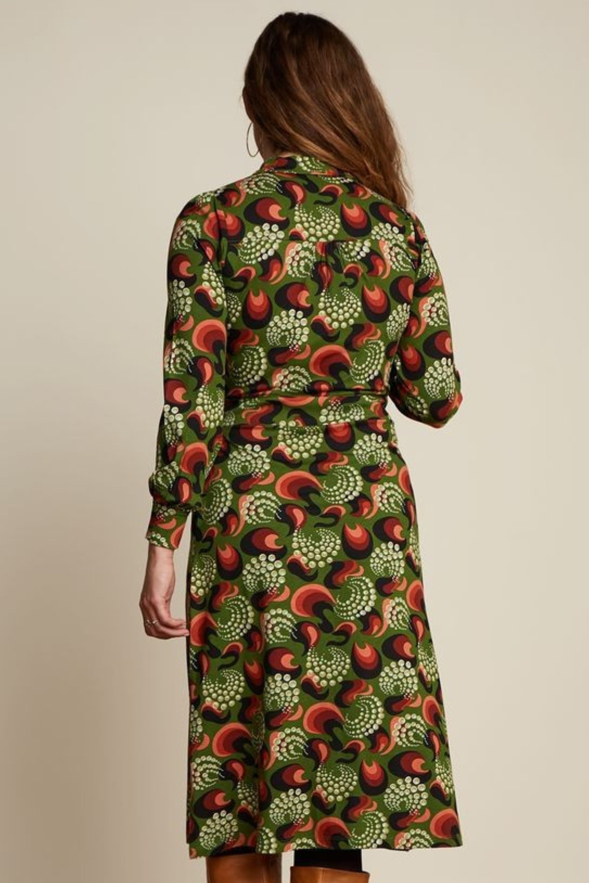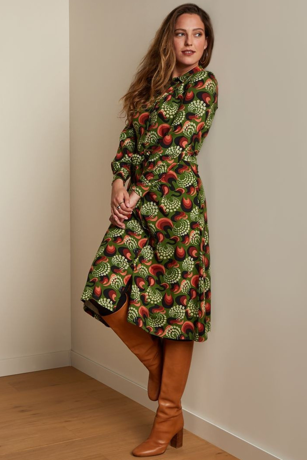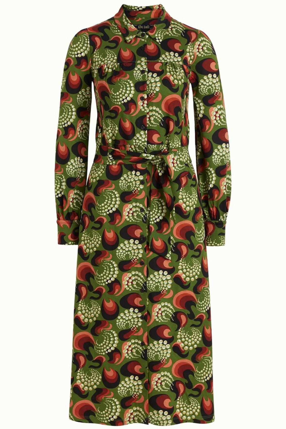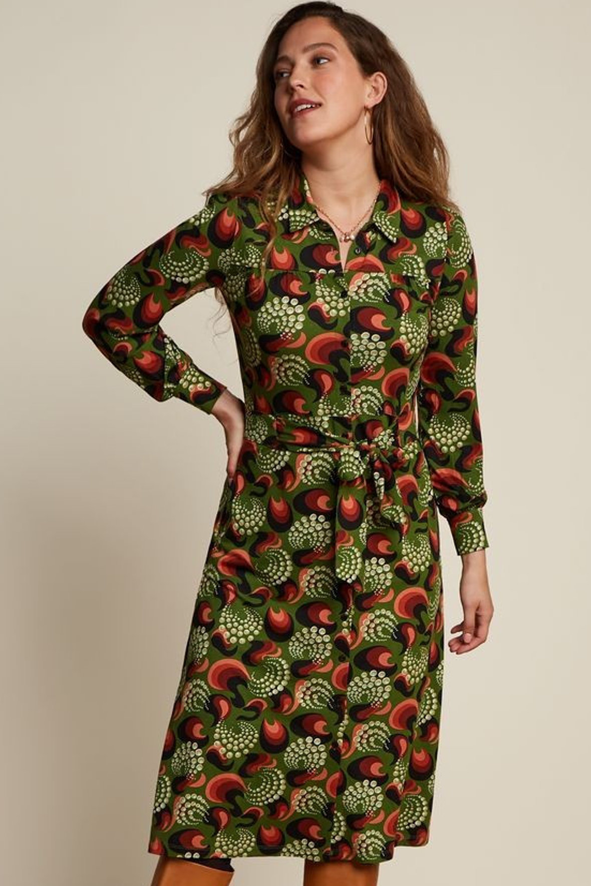 Laila Dress The Fuzz er den nye pige i klassen hos King Louie. Den er lavet som en skjorte-kjole med gennemgående knapstolpe og skjortekrave. Ærmer er i fuld længde med elastisk manchet. Den har skillesøm øverst på bryst samt på ryg med små læg. Den har fast bånd i taljen som er som en fast del af kjolen, foran ender det dog som løse snipper der kan bindes. Den har lommer i sidesømmen. Med god længde til under knæ. Kvaliteten er samme Jersey stræk som vi kender og med grafisk print med flotte farver i mønstret der gør det nemt at sammensætte det look som at Du lige vil fremhæve. Den er lavet i Eco Vero viskose. GOTS certificeret.