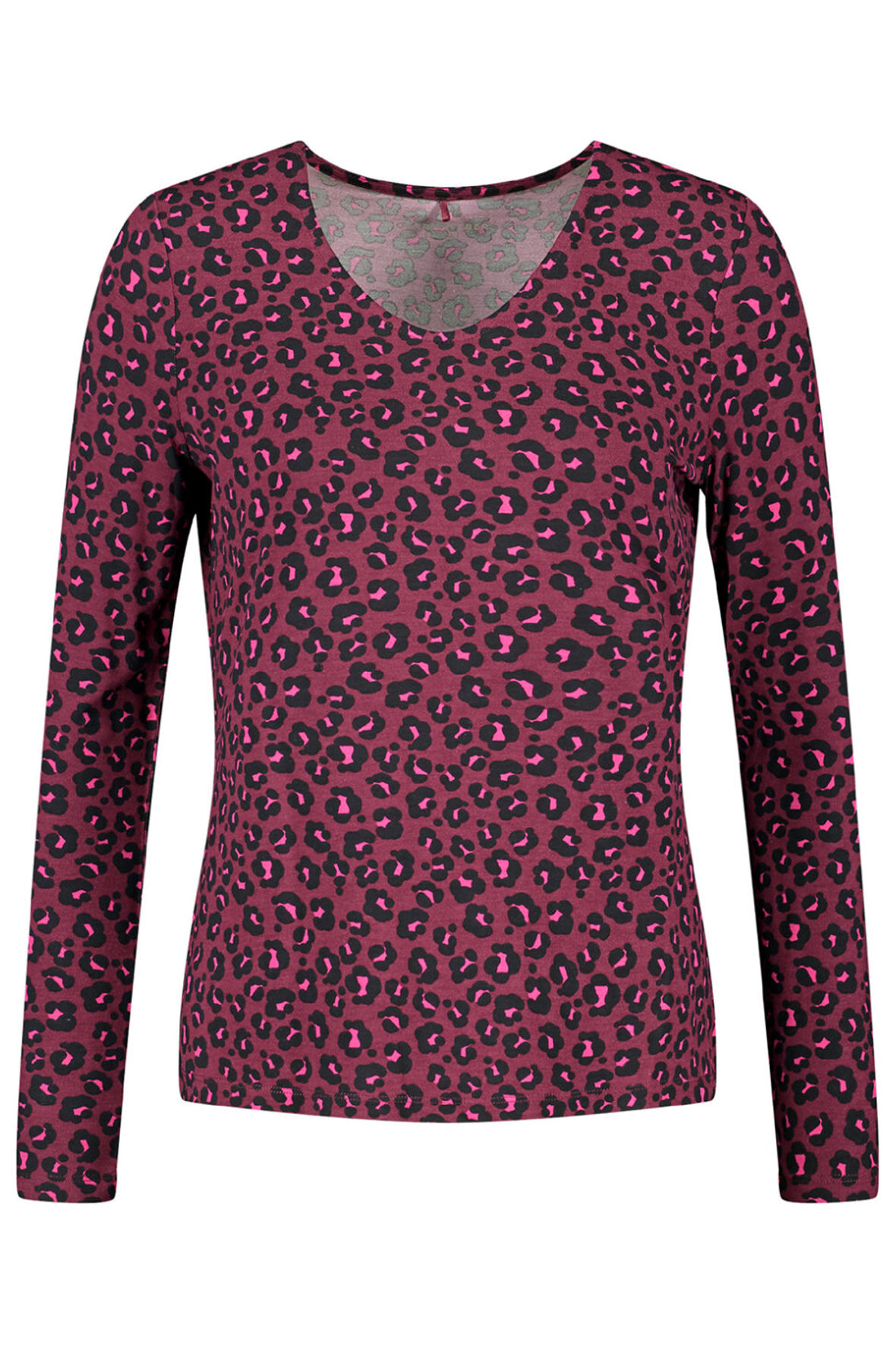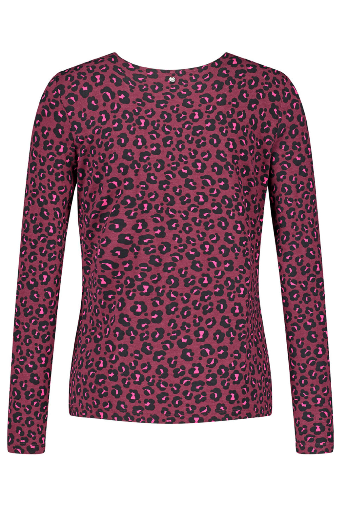 Endnu en fræk Gerry Weber sag. Er det ikke bare en vild farve kombination i bordeaux, pink og sort, vovet men den sidder lige i skabet. Kvaliteten er let luftig og så har den bådhalsudskæring samt lange ærmer. Der er logo i nakken. Printet ledertankerne hen på dyreprint. Den har masser af stræk. Snittet er løst komfortabelt.