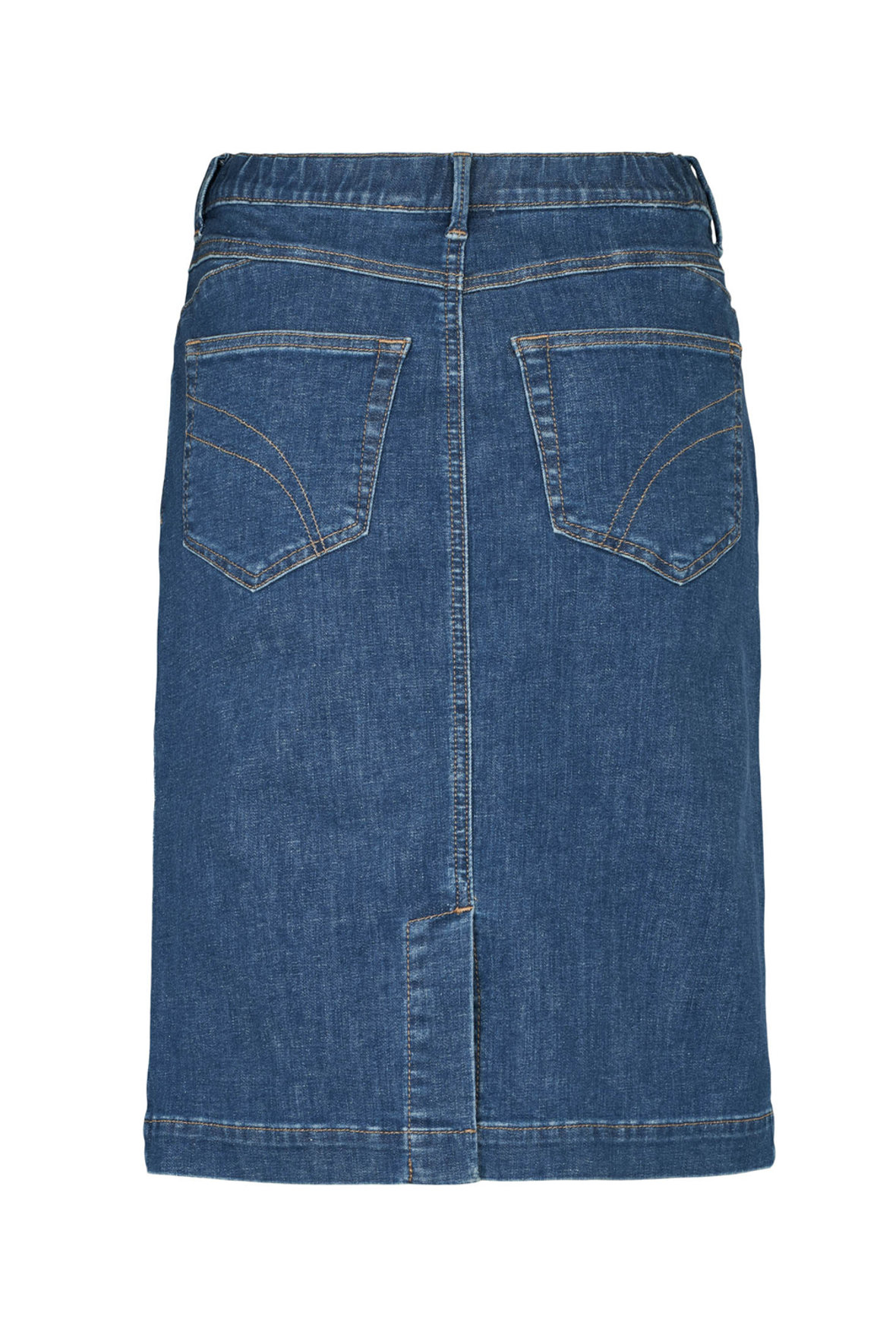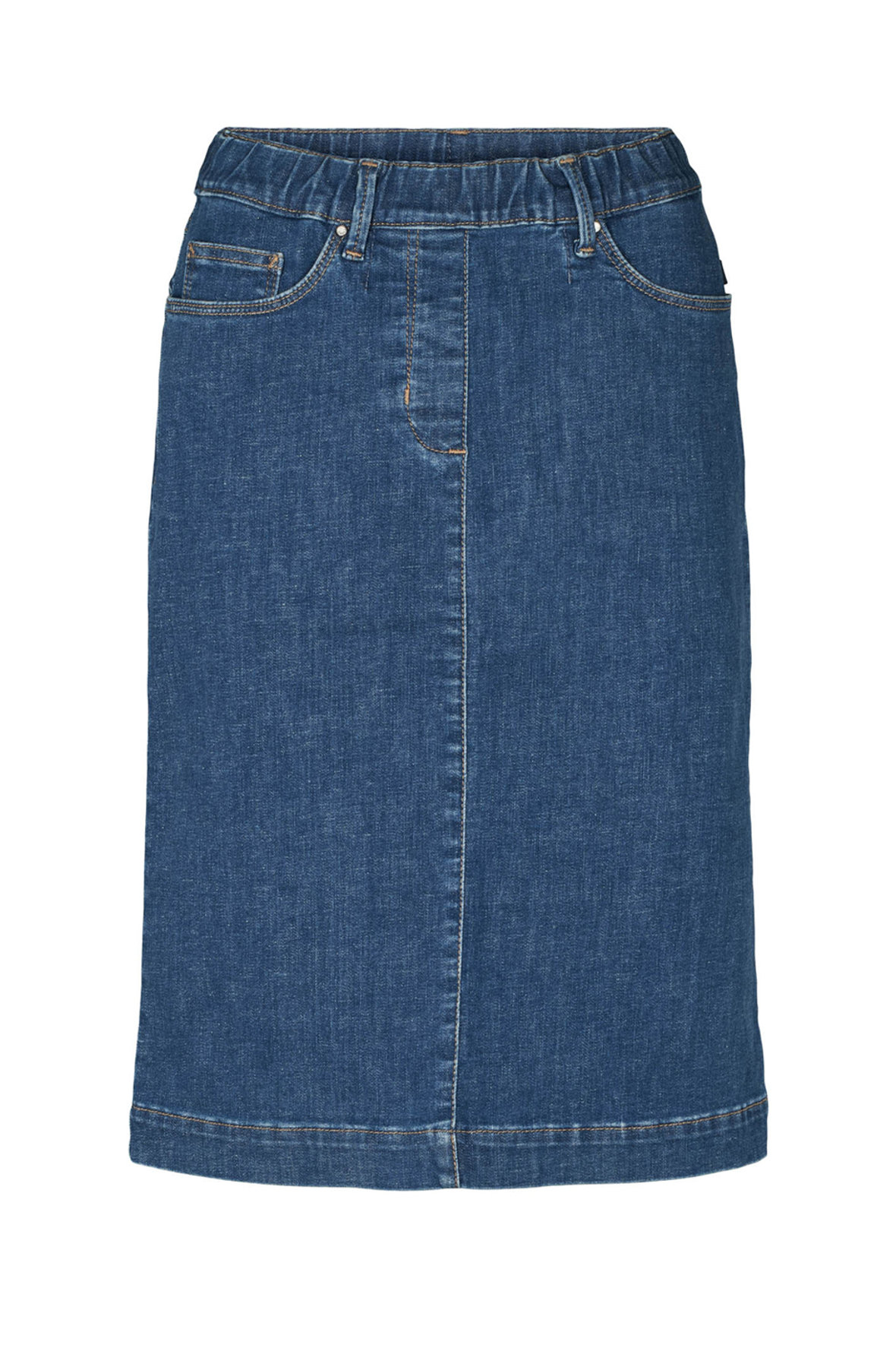 Susanna nederdel fra Laurie er designet med A-facon og er yderst komfortabel fordi den har buffet linning der er bred og elastisk men stadig har bæltestropper. Gylp er til pynt. Den har fem lommer, tre for og to bag. Den er med kontraststikninger i orange/army. Bagpå nederst har den slids. Der er godt med stræk i metervaren.