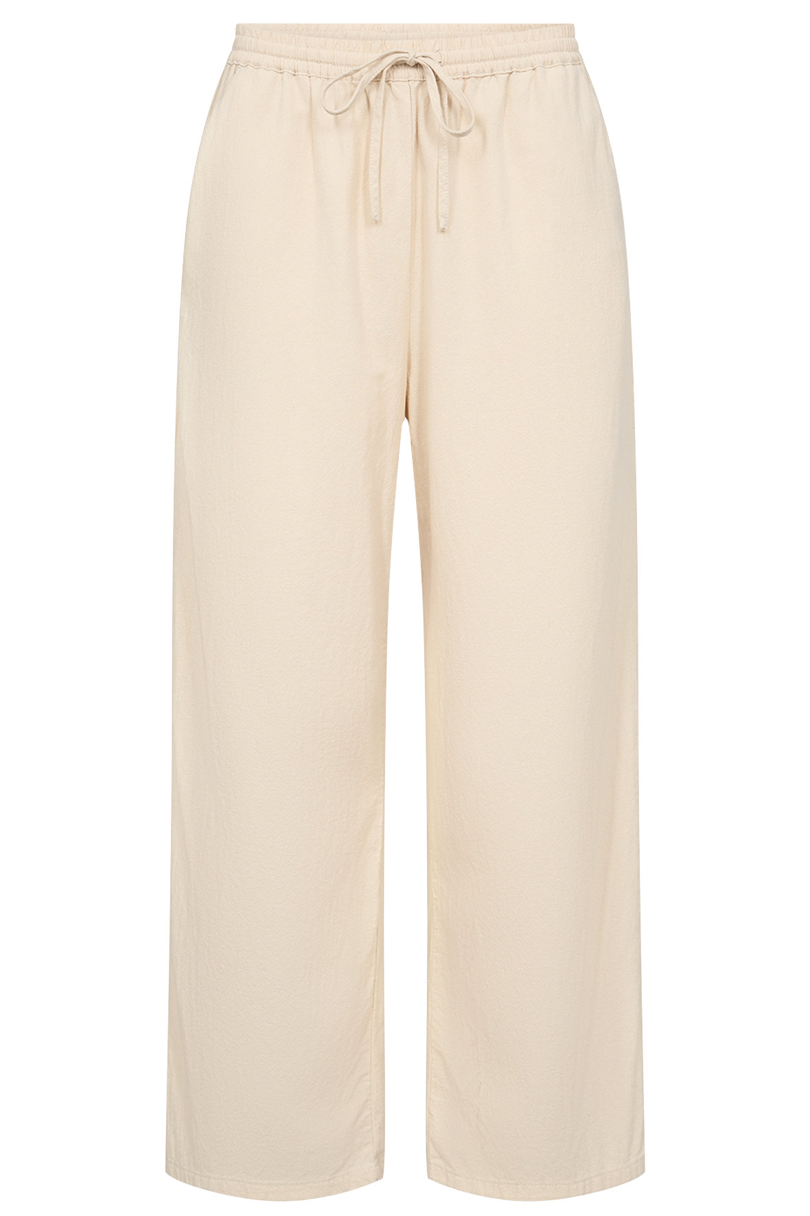 Løse bløde bukser med fuld længde i den vanlige - og for mange højt elskede bomulds kvalitet. Med bred elastisk linning med snører. De har skrålommer foran. Kvaliteten er let og sommerlig med ru overflade som også går for at være en "fattigmands hør". De har casual og løst snit. Sc-Cissie 49-c kommer jævnligt i flere farver - en gammel kending vi ved der sidder godt og falder i smag. Snittet er baggy hvis du trækker buksen ned, og det er der plads til for taljen er høj.