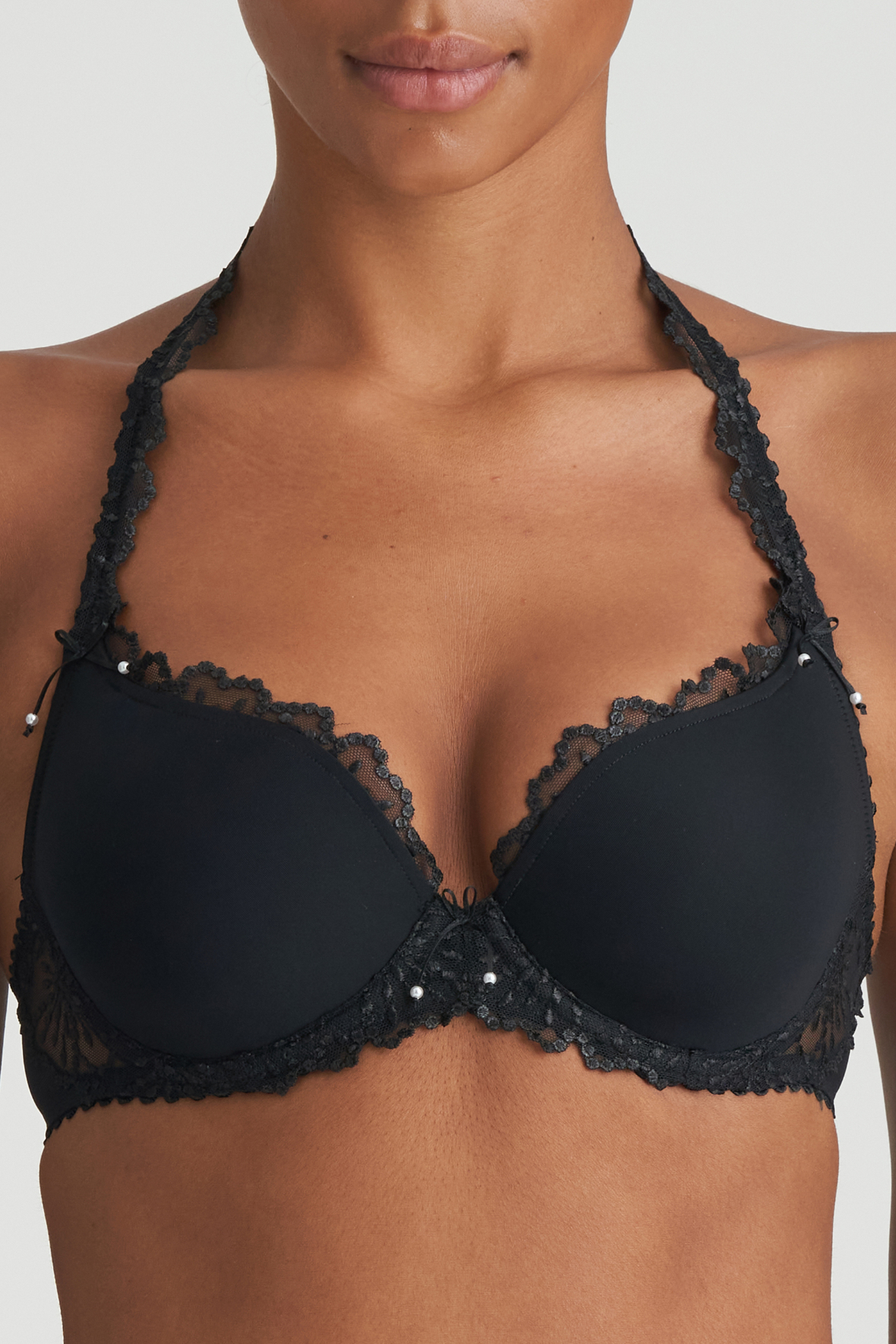 Så er Marie Jo Jane endelig landet som Padded Bra, altså en foret bh med bøjle og multiway stropper. Så kan den lavers til halterneck eller bæres med stropperne som oftest brugt. En genial feature som giver dig flere kort på hånden. Flot form med Heartshape der er så feminin fordi den præsenterer barmen sensuelt. Stilfuld med ikke transparent design og tofarvet blonde samt perleudsmykning. Den har bare noget elegance over sig og en masse for øjet. Stropper kan justeres til dit behov og den har eye og hook bagpå. Den tåler en tur i vaskemaskinen.