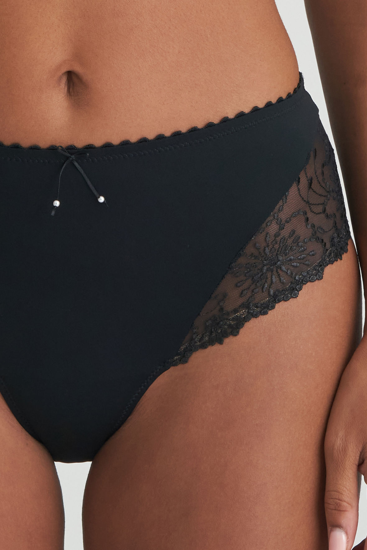 Marie Jo Jane Full Brief er lige landet - altså en maxi trusse. Den har lidt mere højde i taljen samt giver dig flotte visuelt længere ben og dækker numsen. Den har smuk shiny overflade, elastik i linning der ikke borer sig ind, smuk lille sløjfe med perler, på hofteben har den transparent blonde med flot mønster. Numsen er dækket med har fået de skønneste ben udskæringer med transparent bort. Bomulds kile i bunden. Den er mere end "ikke så ringe endda", faktisk en af mine favoritter.