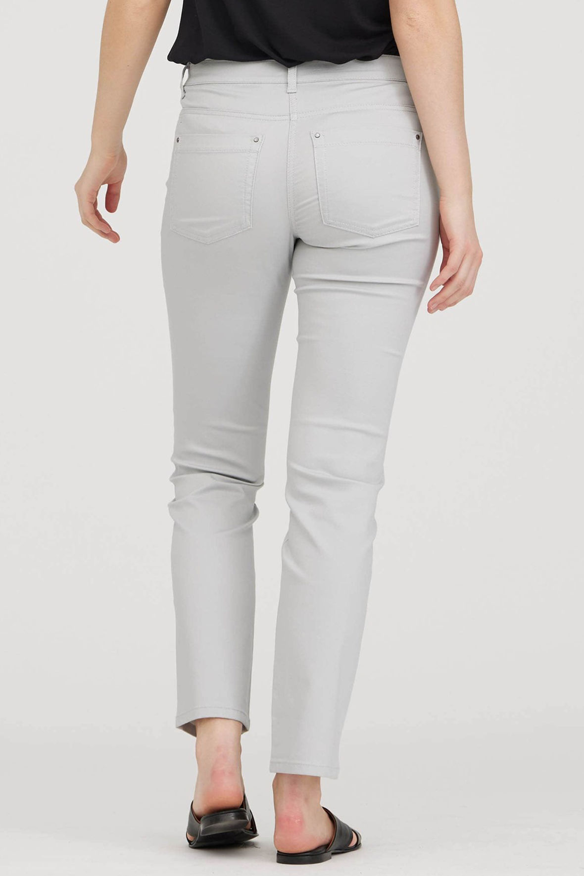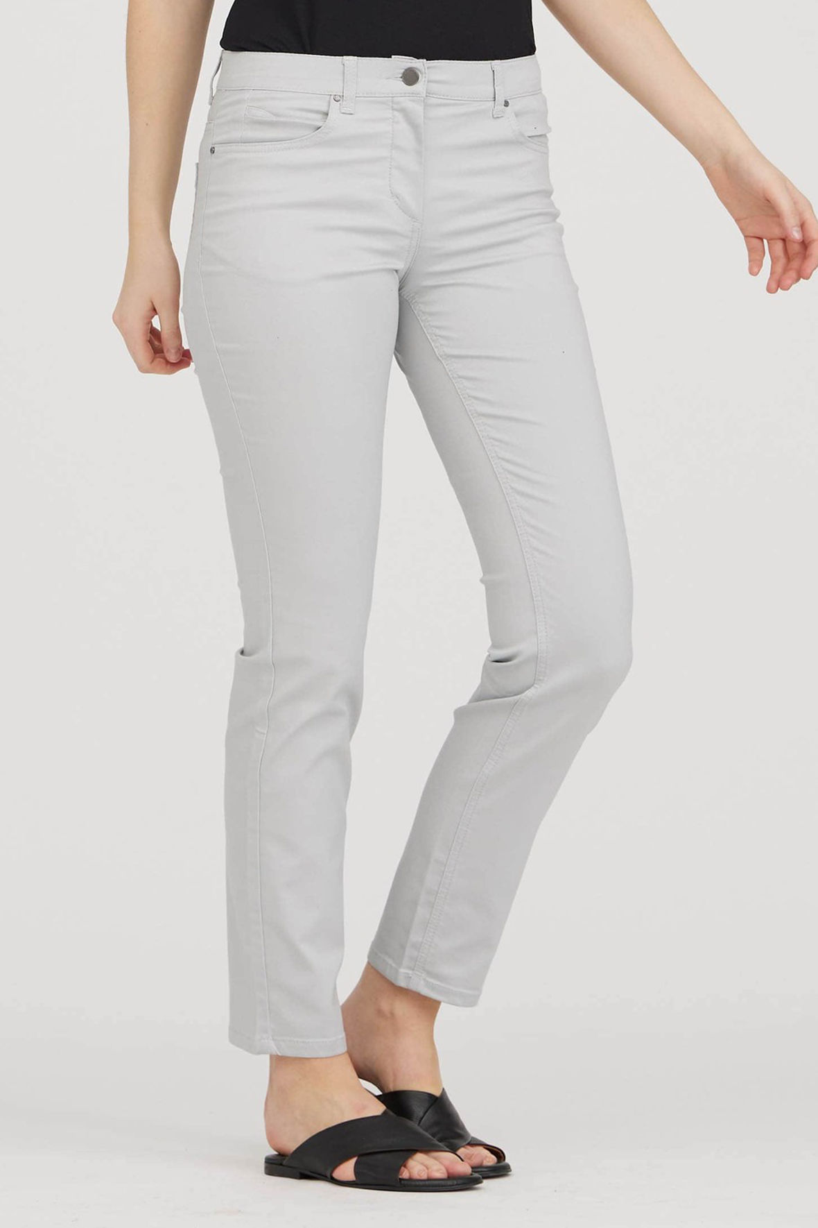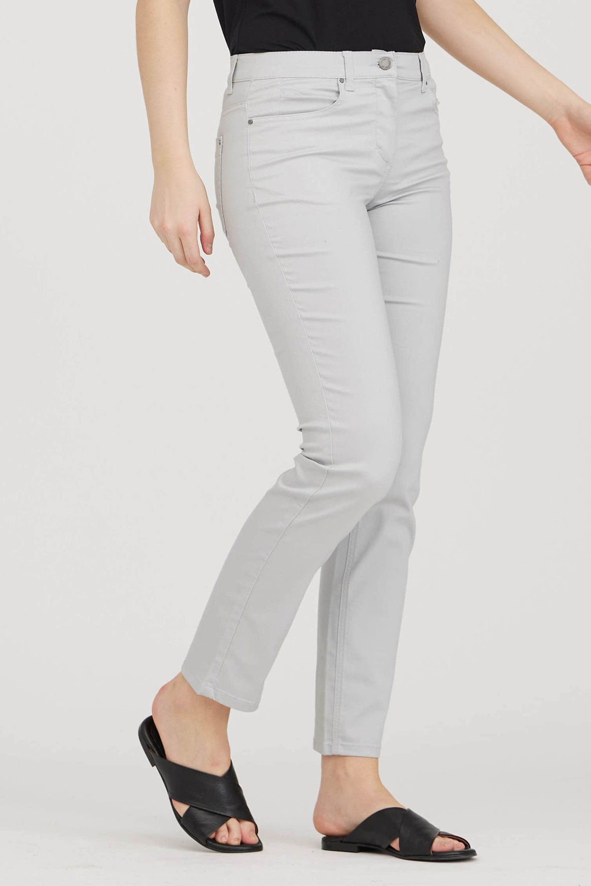 Laurie Charlotte regular i medium length og i sort. Et par bukser der har mere traditionel elastisk linning der er helt glat og er med bæltestropper, de er lavet med knap, gylp og lynlås så de sidder dejligt på kroppen - frihed uden gener kunne man fristes til at sige. Ensfarvet twill og med tone i tone stikninger. Let bomuldskvalitet med stræk - en rar oplevelse mod huden. De har tre forlommer og to baglommer så også her traditionel som five pocket. En jeans fremstillet uden skadelige kemikalier, indeholder økologisk bomuld samt er Øko-Tex certificeret og produceret i Europa. Samme pasform hver gang også plus size. Den sorte er der ikke taget billeder af på model, men der er af den lyse, så må de hjælpe dig på vej.