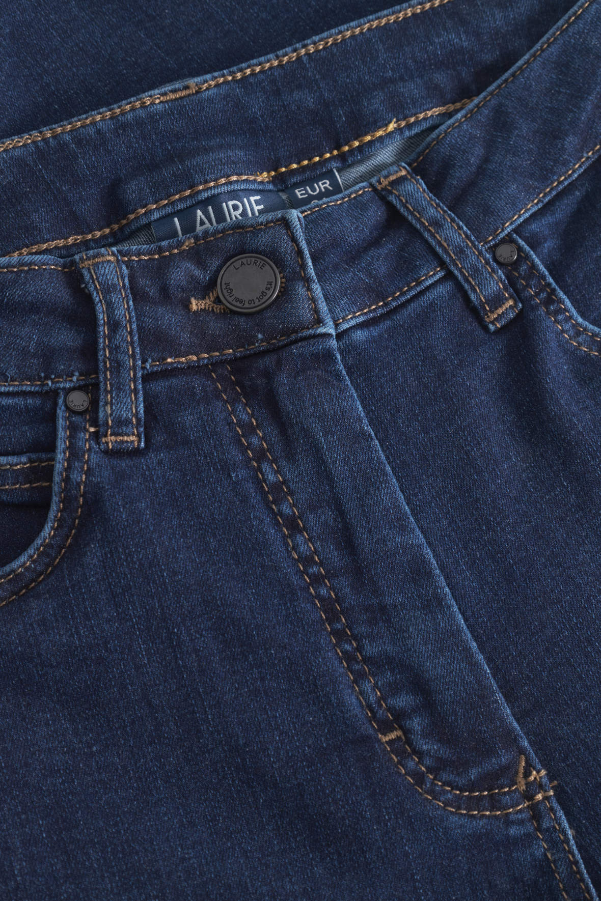 Laurie Charlotte regular i medium length og som alm denim buks. Et par bukser der har mere traditionel elastisk linning der er helt glat og er med bæltestropper, de er lavet med knap, gylp og lynlås så de sidder dejligt på kroppen - frihed uden gener kunne man fristes til at sige. Ensfarvet denim uden slid og med orange stikninger. Let bomuldskvalitet med stræk - en rar oplevelse mod huden. De har tre forlommer og to baglommer så også her traditionel som five pocket. En jeans fremstillet uden skadelige kemikalier, indeholder økologisk bomuld samt er Øko-Tex certificeret og produceret i Europa. Samme pasform hver gang også plus size.