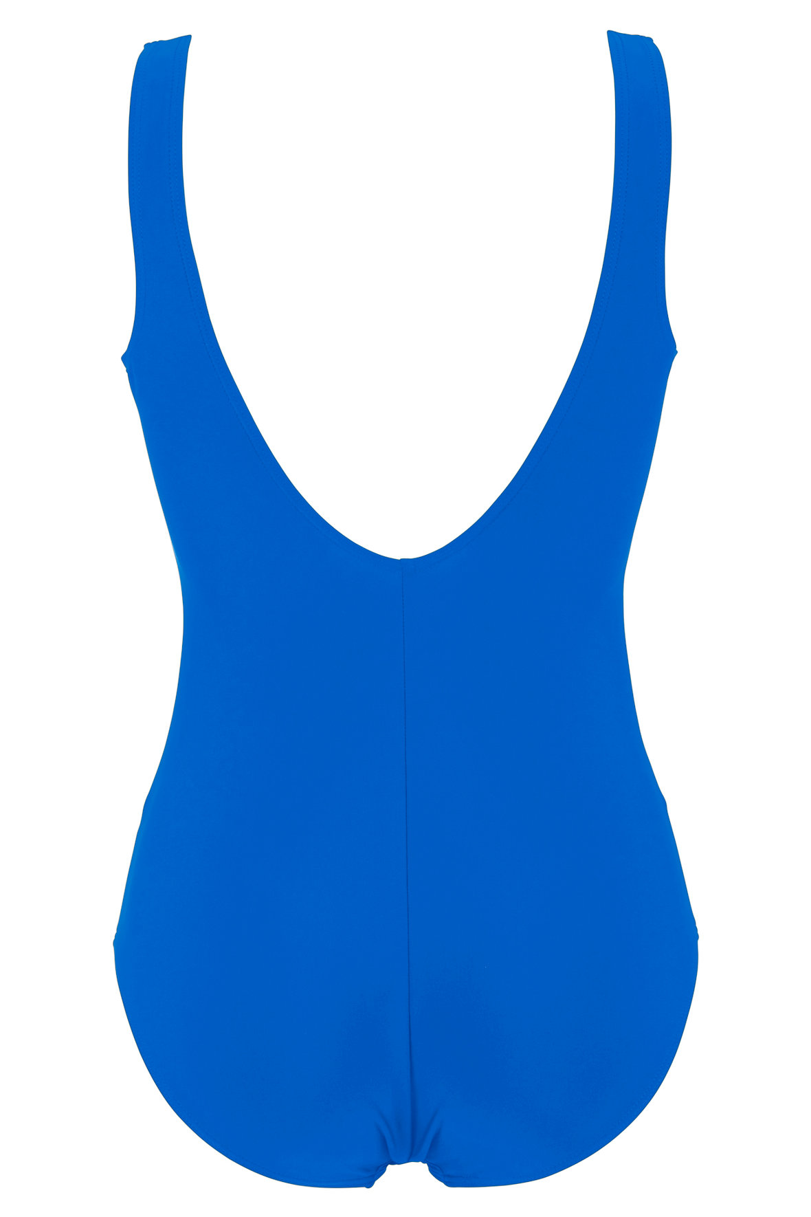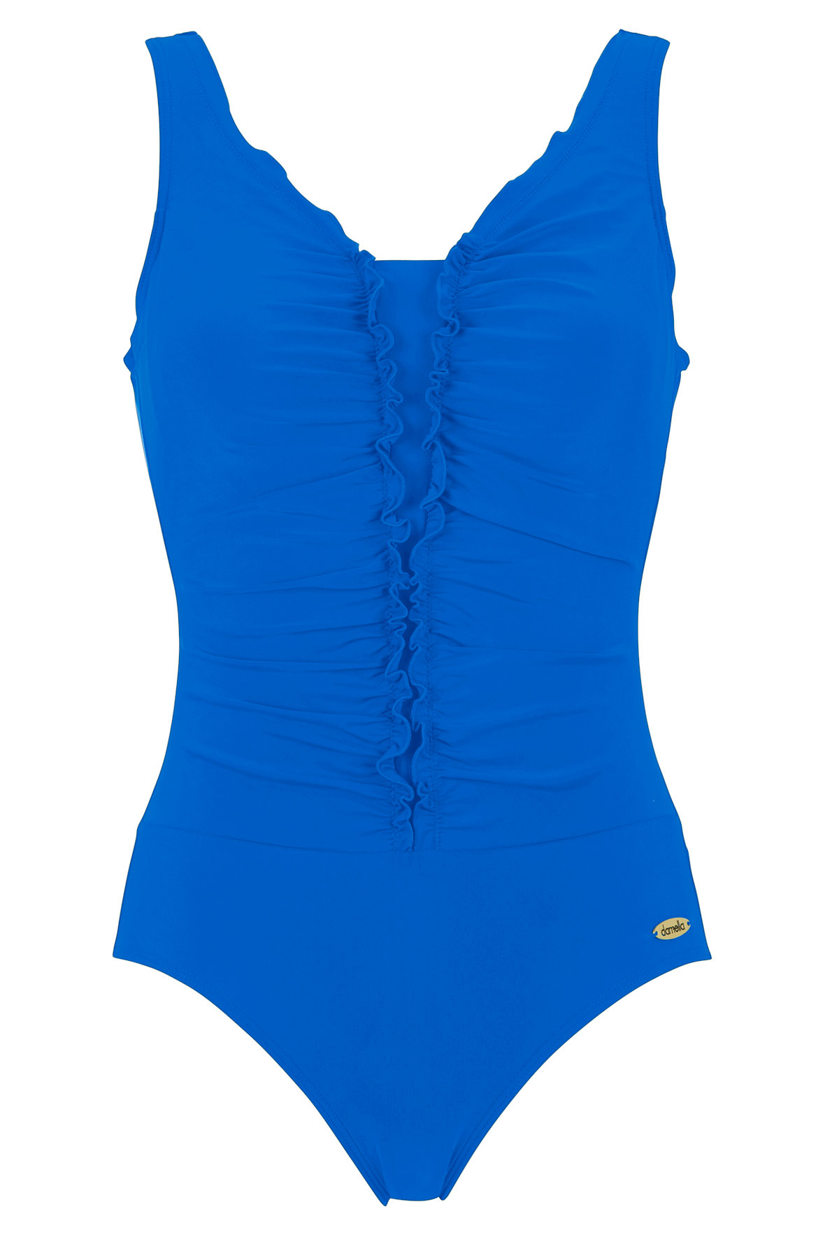 Jennifer er en helt klassisk ensfarvet flot badedragt med flotte detaljer. Smuk nærmest elektrisk stærk farve med skidende overflade. Meget sensuel løsning med to flæsekanter der smyger sig fra stropper og ned forbi kavalergangen, det giver en vis tryghed ved maven. Stropperne er brede, rygudskæringen er dyb og der er komfort kile i bunden der går op i forstykket. Der er vatterede skåle og elastik under som holder barmen på plads hvis du skal lave 10, 20, 30 ;-) Den har bare et design der får dig til at "shine". Stranden er din - hvad venter du på. Klor og UV resistent samt tåler saltvand. Den azurblå er der ikke taget billeder af på model, men der er af den sorte, og dem skal du selvfølgelig have glæde af her.