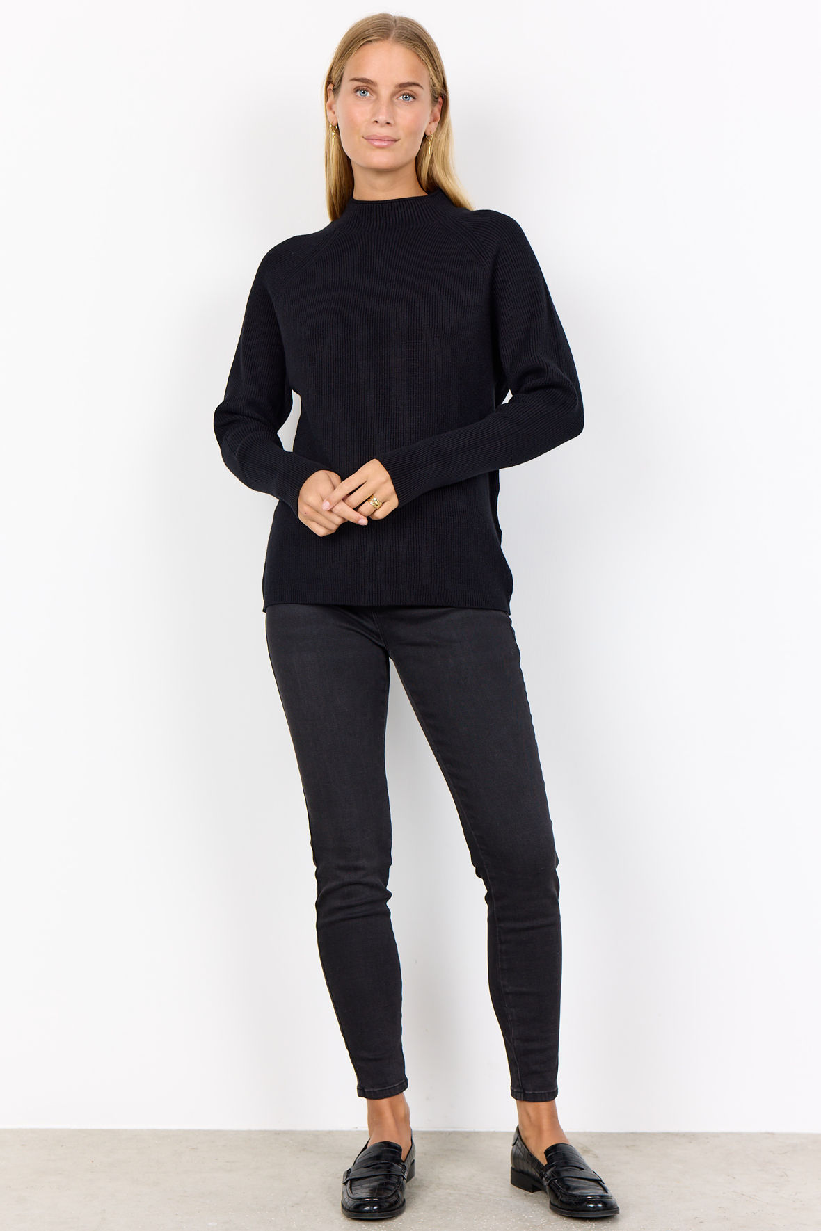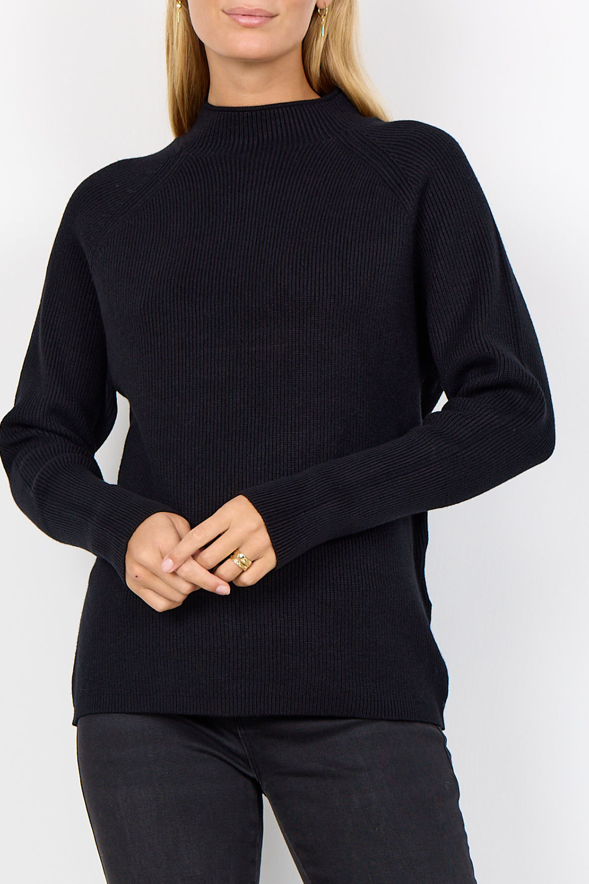 Så er du landet på en helt klassisk sort ribstrikket pullover. Men SoyaConcept har alligevel lavet den med fede detaljer så der er lidt for øjet. Den er højhalset/turtleneck med lille rul ved kant, ærmer er lavet som raglan der udgår fra halsudskæring. Kvaliteten er en lækker åndbar EcoVero viskose. Den holder farve, form og størrelse og er kuffert venlig.