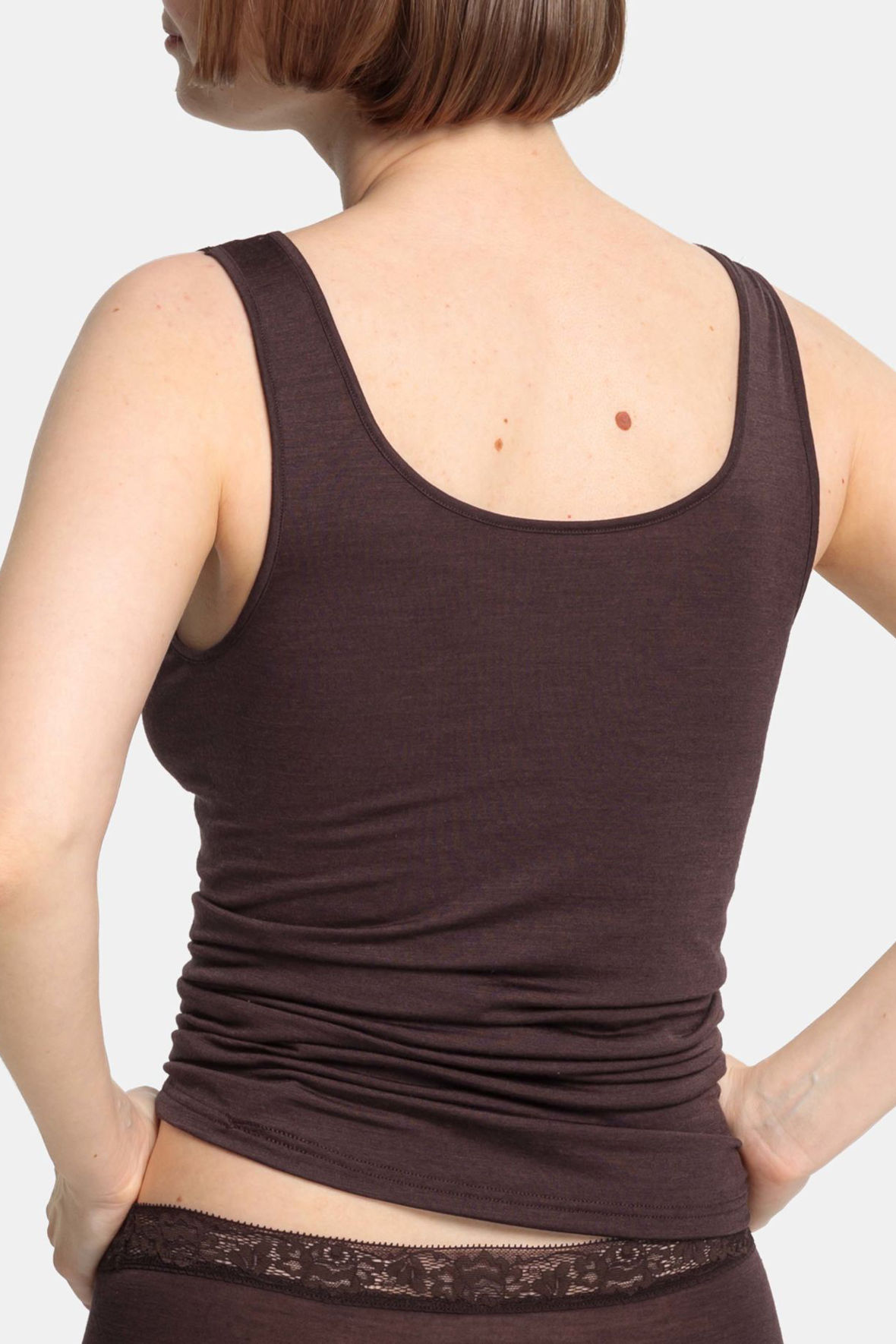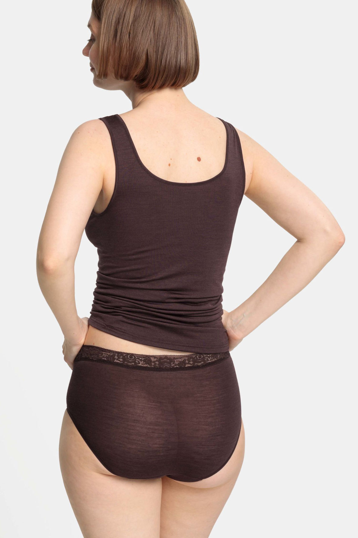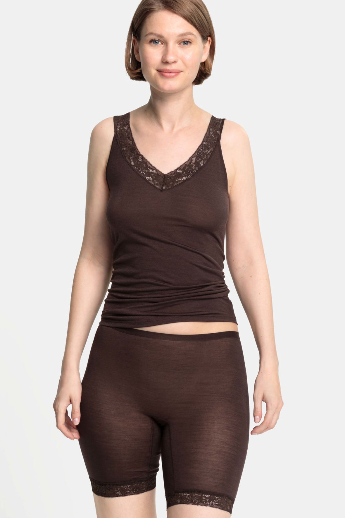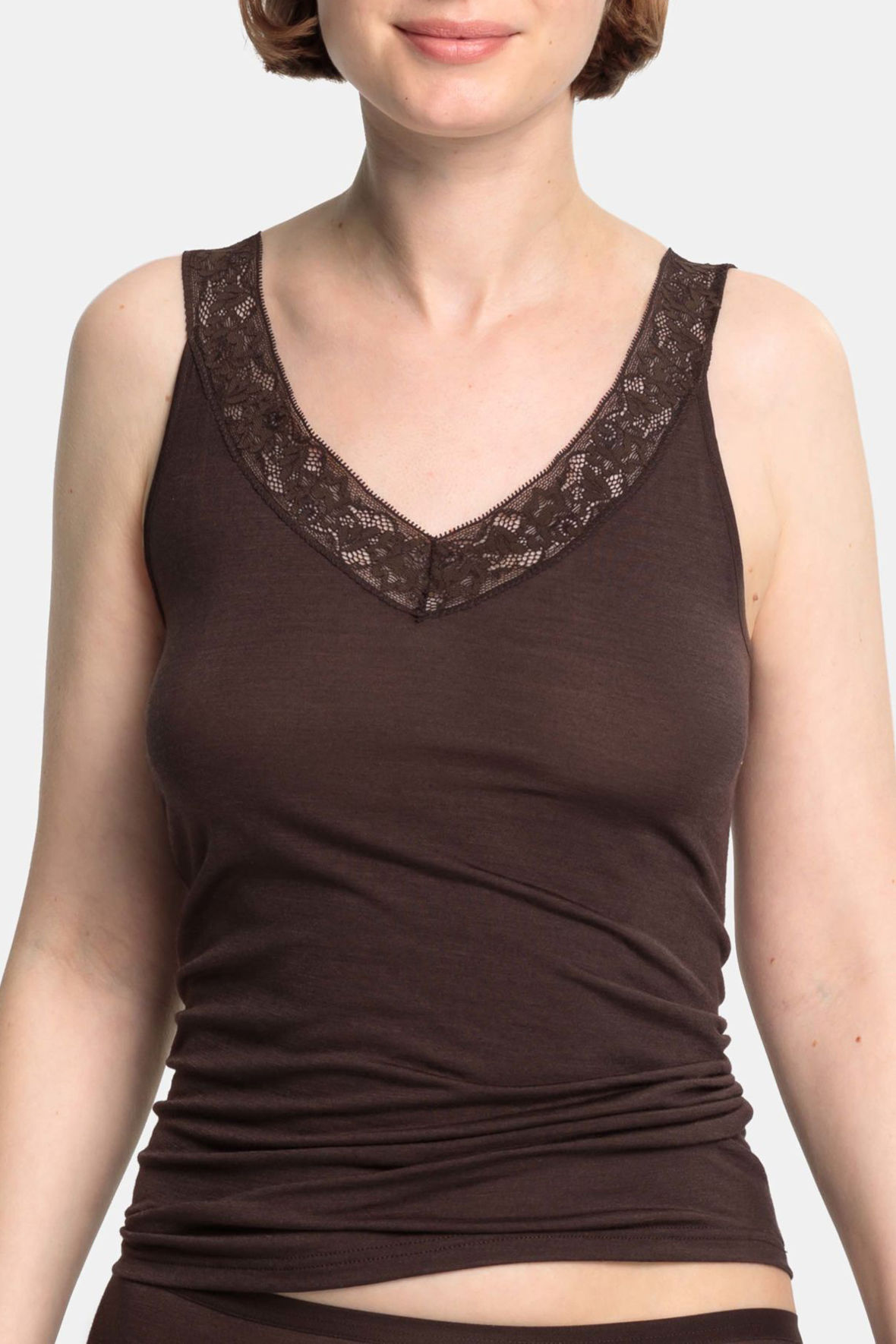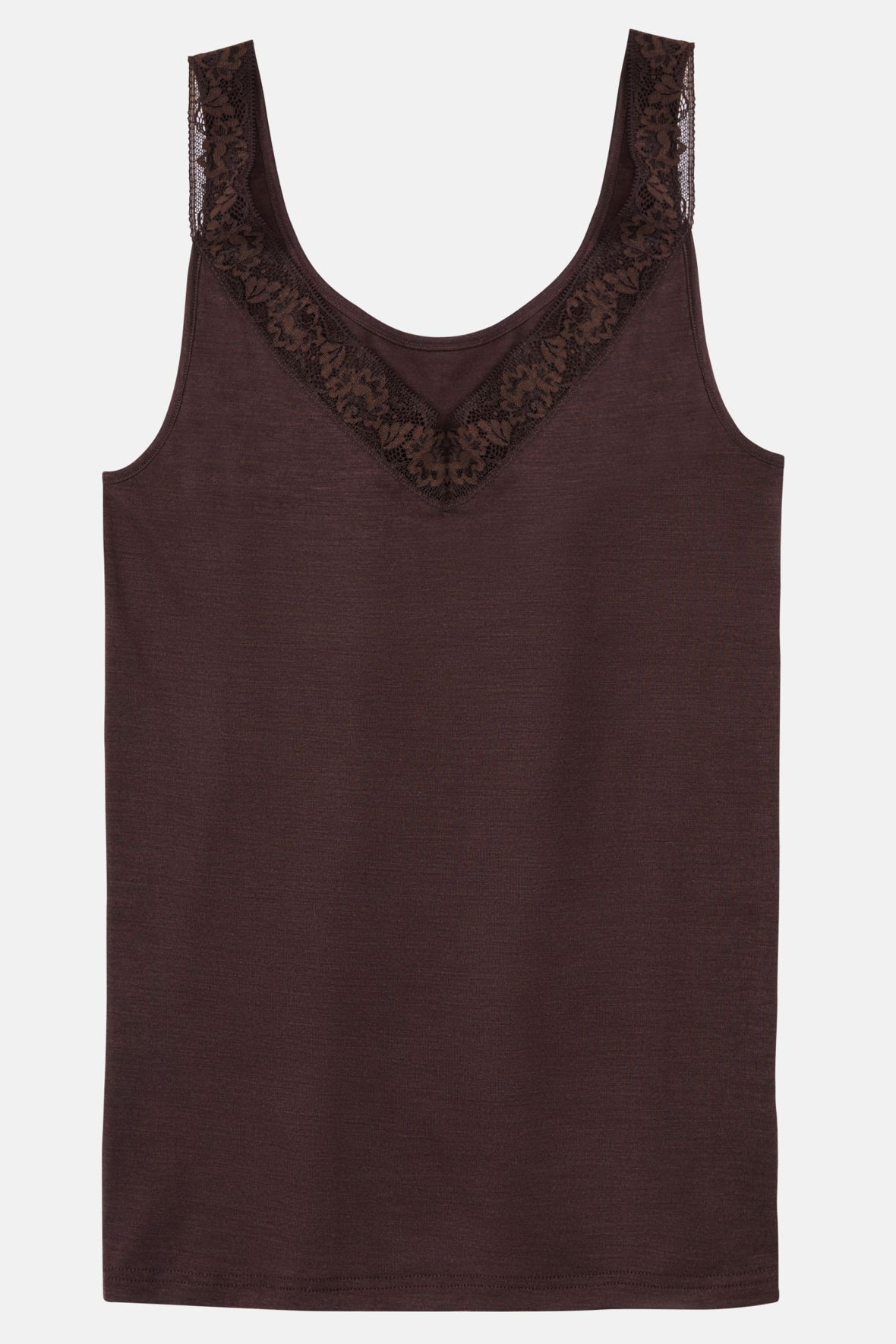 Sanja Merinould og Tencel undertrøje med brede stropper der har fået en flot transparent blonde der går ned i V-udskæring. Blandingen af Merinould og Tencel lader dig ikke i stikken, den har to meget vigtige egenskaber som er temperatur- og fugtighedsregulerende. Det bliver simpelthen ikke bedre. En stærk kombination uanset om du er super aktiv eller passiv vil den tjene dig med det du har behov for. Den tørrer super hurtigt. En kvalitet der ikke kradser på noget tidspunkt og som du med fordel kan bruge året rundt - ja året rundt og du behøver heller ikke klatre eller være i naturen for at have gavn af den. Det kolde kontor er nok den største "aftager". Den er rundstrikket så ingen syninger i siden, intet der generer og de resterende sømme er flade. Egnet til alle figurer og produceret i Europa. Størrelsessvarende og sidder til.