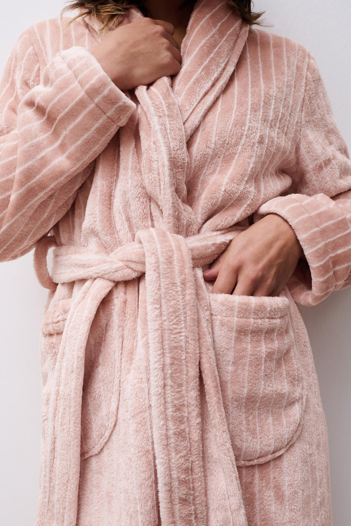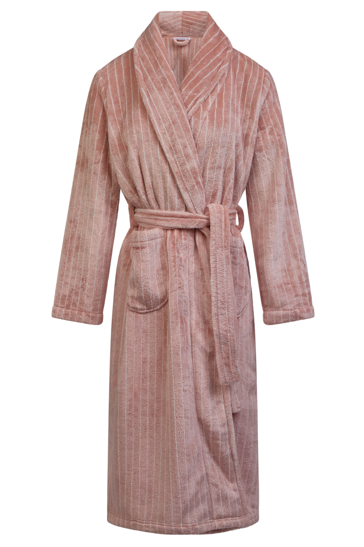 Her er så Femilet Chantelle budet på en fleece morgenkåbe der har noget teddy bear kvalitet over sig. Vamset, varm blød og dejlig mod den bare hud. Her kommer du ikke til at fryse, jeg garanterer det. Flot farvekombination af rosa og den hvide nålestribe. Husk fleece er bedst til tør hud ellers bør du kigge efter en frotte kvalitet. Kåben er lavet lige som den skal være, der er den flotte revers man kan putte sig lidt i, den har påsatte lommer, har løst bælte i stropper, men prikken over i'et - kronen på værket - er at den er med yderligere et bånd i satin der hæfter den ene yderside med modsatte inderside. Således undgår du at den går op. Så hænger du lidt længere i kåben hvor du er lidt aktiv, går den ikke pludselig op. Detaljer har betydning.