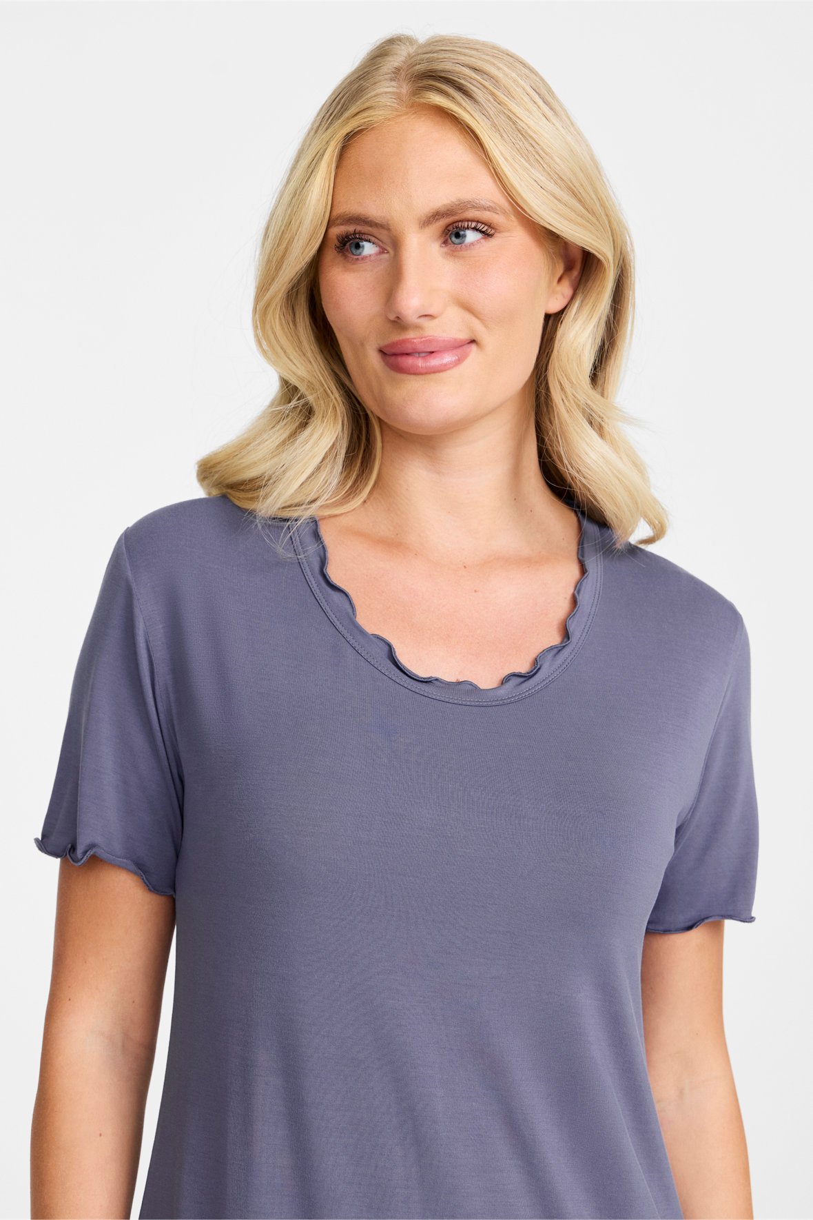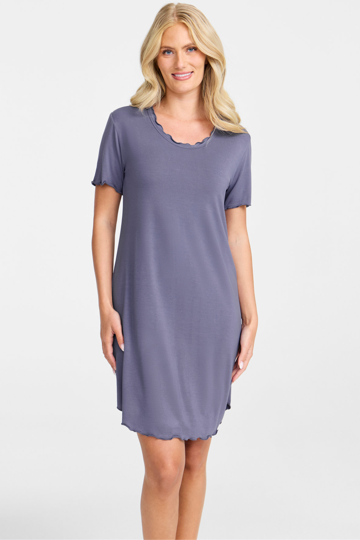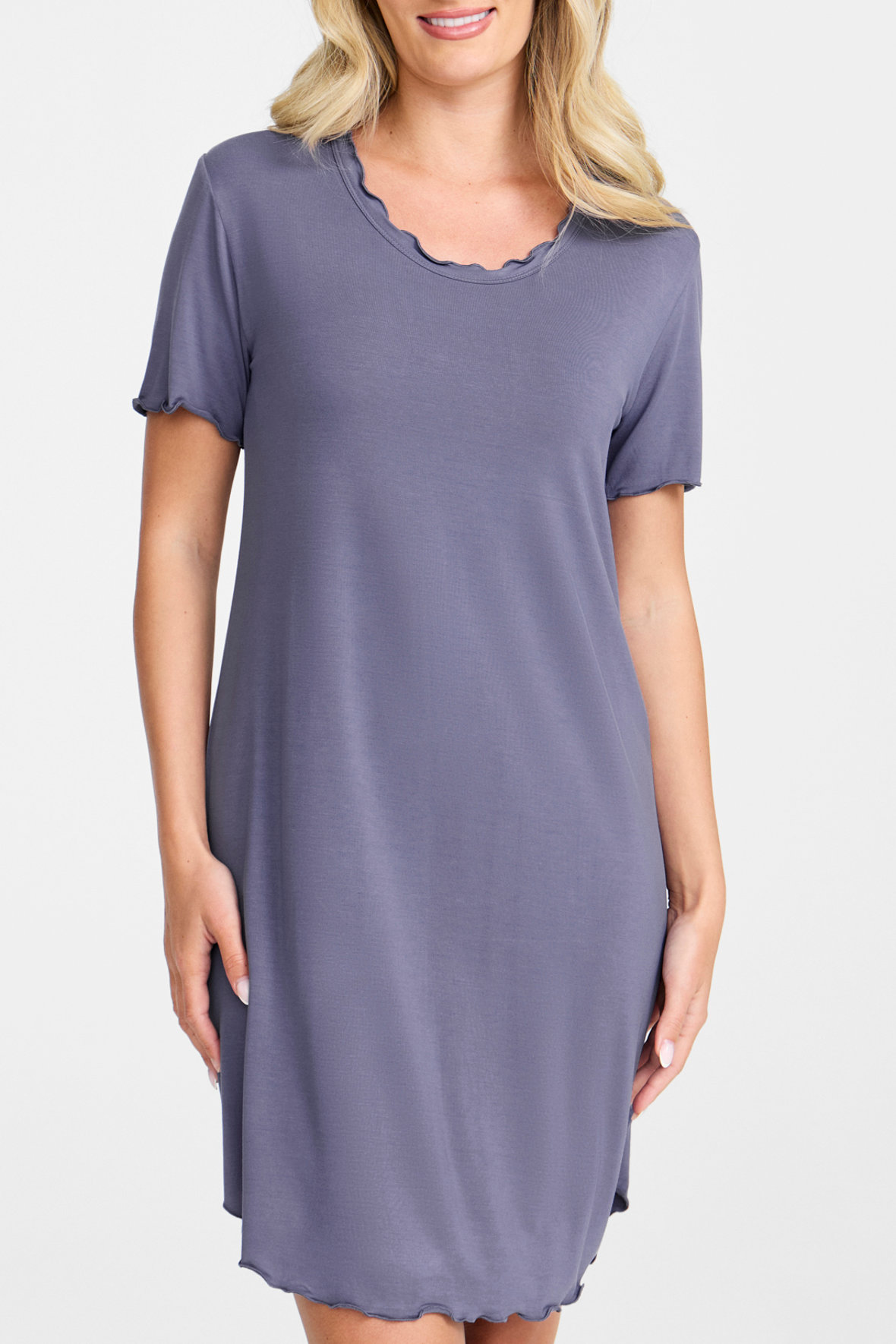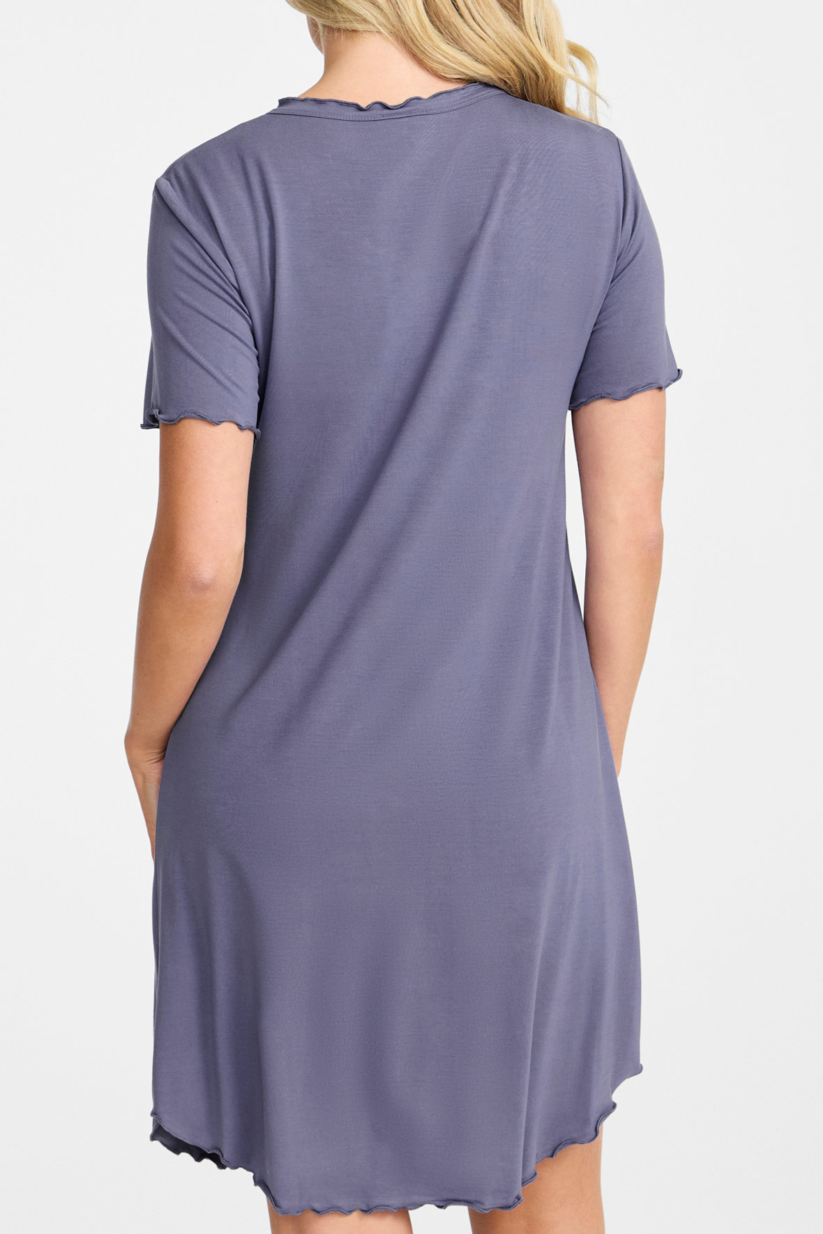 Damella ensfarvet blå natkjole med længde der slutter lige over knæ. Den har som særlig detalje syning på alle kanter der minder om flæse. Med rund halslinje samt korte ærmer og lavet i den blødest tænkelige kvalitet, nemlig i naturlige bambus fibre. En natkjole hvor der er lagt så megen vægt på den gode nattesøvn, og skal den følge dig i lidt længere tid når at det er fridag er den super flot til det også. Let og åndbar.