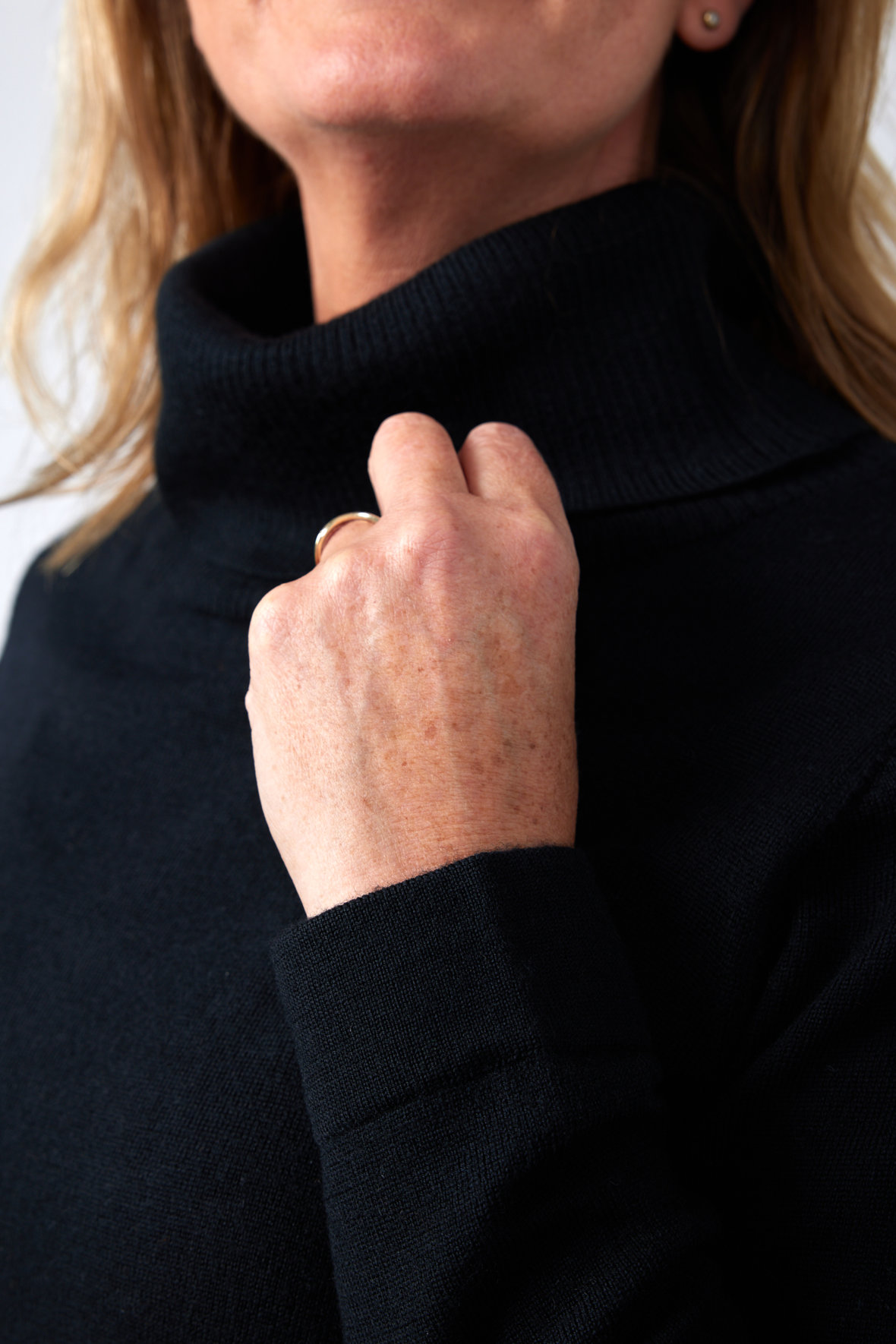Lind finstrik i ren Merinould, LiKirsten er toppen af poppen når vi taler kvalitet. Merinoulden er særligt temperaturregulerende, fantastisk til at køle og varme, absobere fugt og uden at lugte af sved. Den er særligt god direkte mod huden hvor den træder i karakter. Her er den lavet med melange effekt i garnet som giver den farvespil. Den har løs rullekrave og lange ærmer. Snittet er lige og løst. Den holder farven men også faconen og krøller ikke spor, det er sådan strik skal være. Den er bare fra øverste hylde.