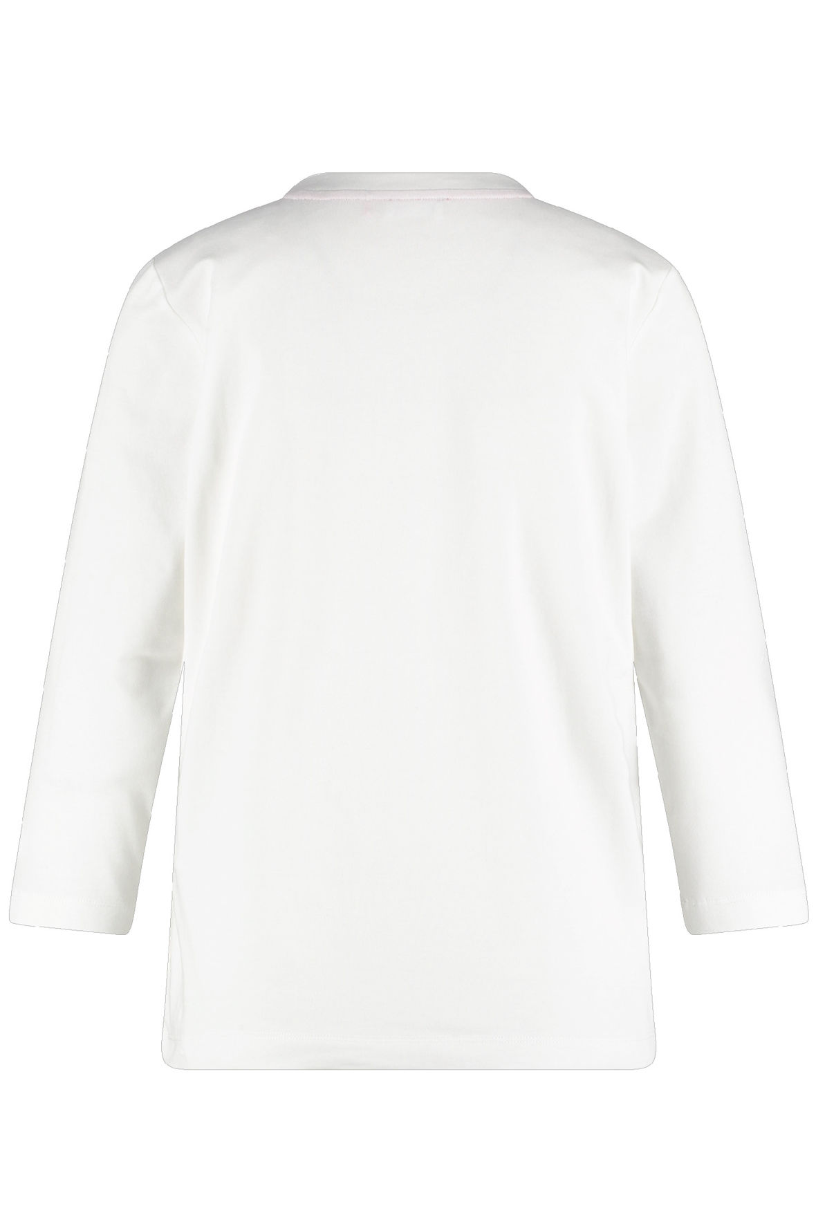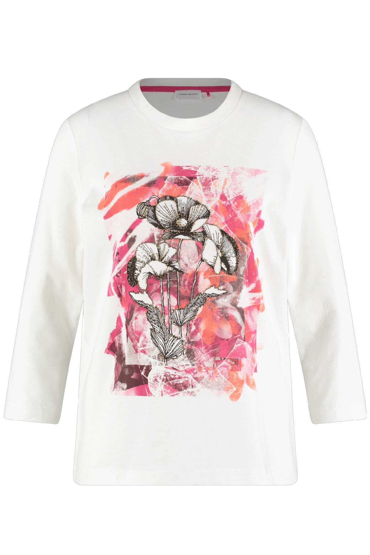 Print t-shirt der bare har fået megen kærlighed. Den er let i kvaliteten, Med rund hals og 3/4 ærmer. Den har årstidens print og farver med små sten/perle -besætninger på der er syet fast i hånden. Traditionen tro har Gerry Weber lavet den blød og lækker, den er en rar oplevelse mod huden. Dens lette kvalitet gør den særligt egnet til en flerlags løsning.