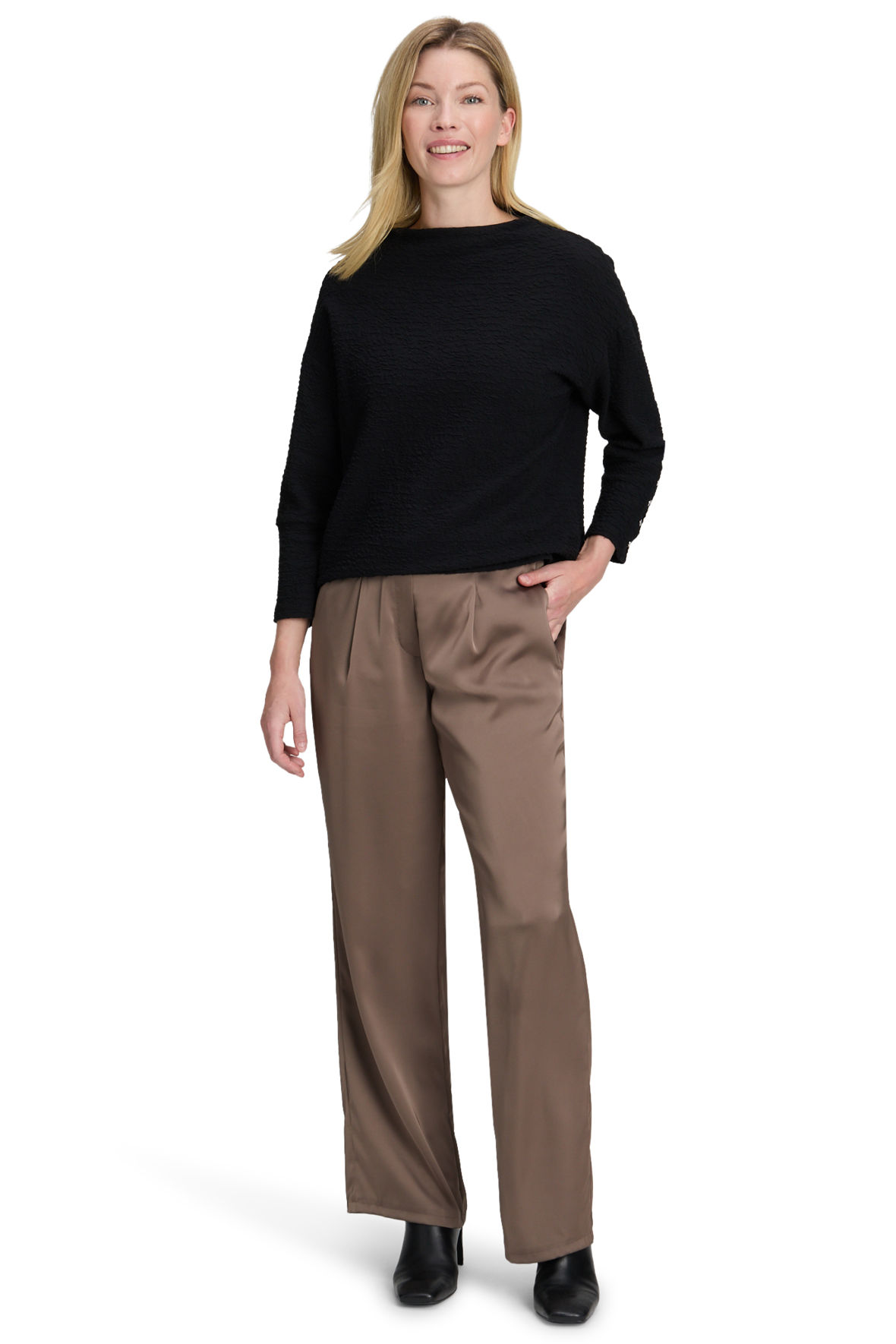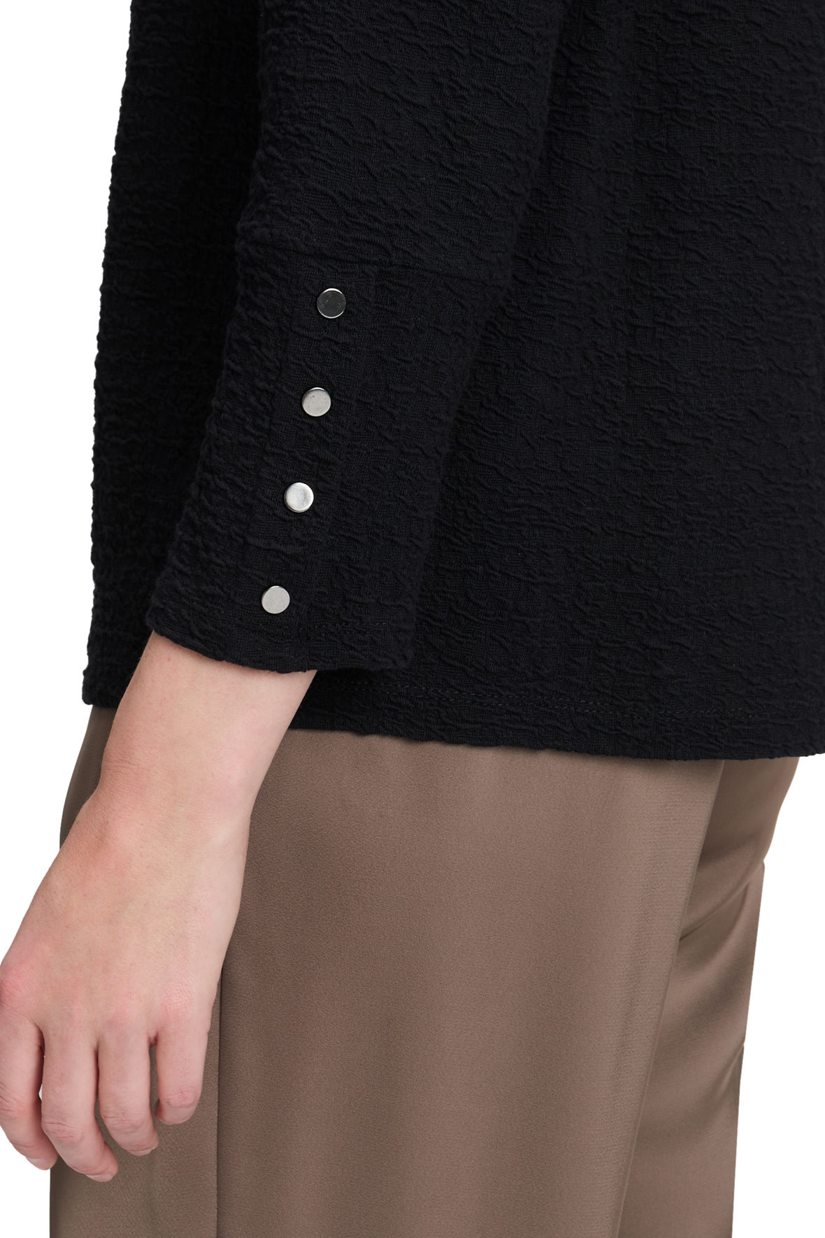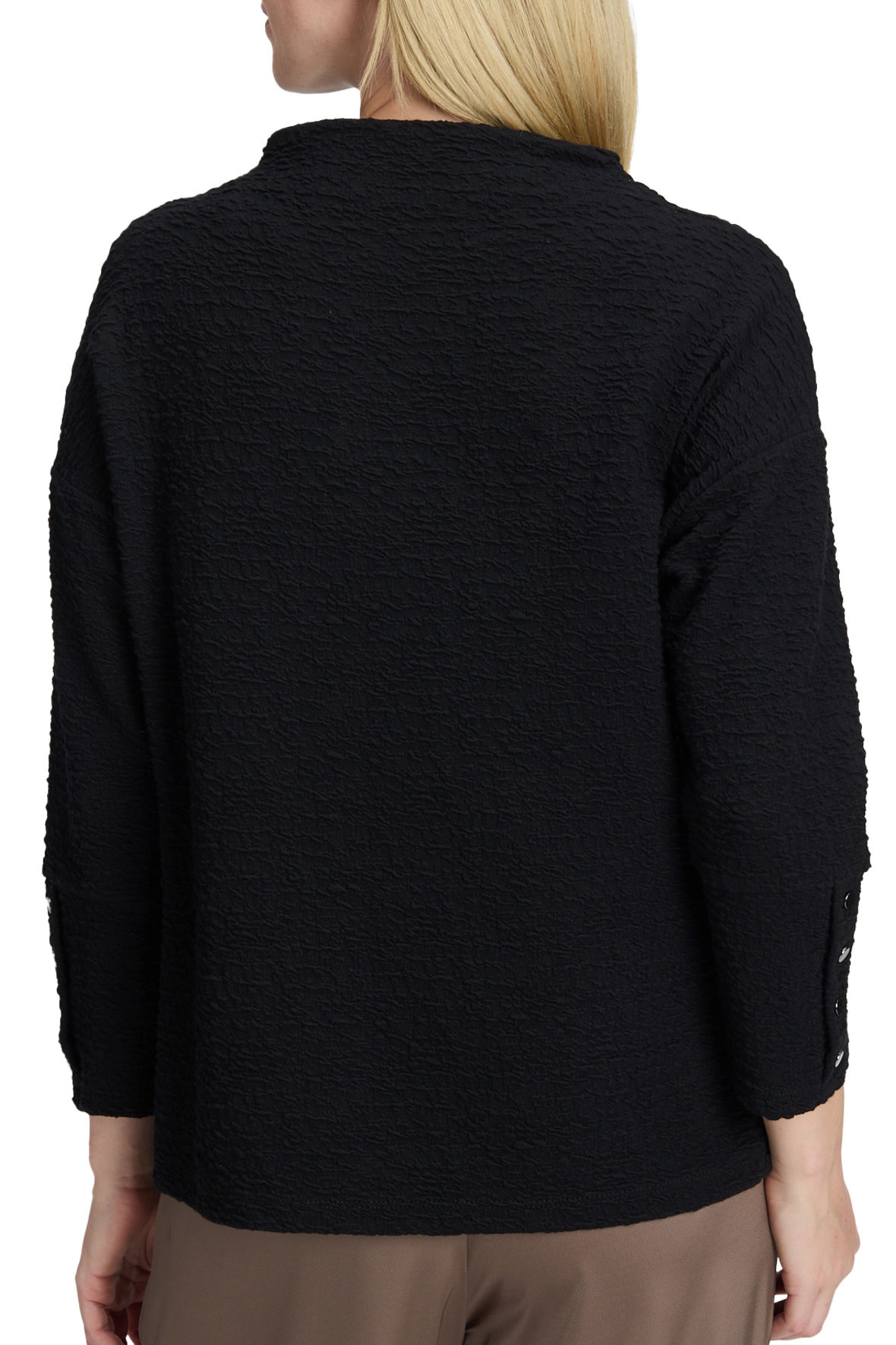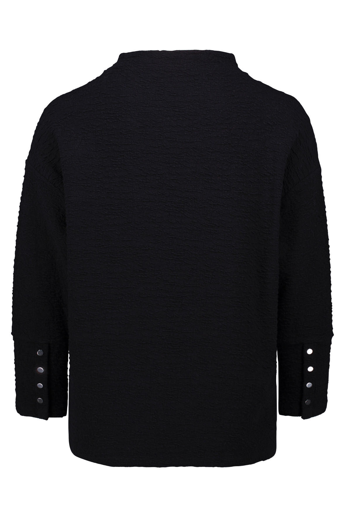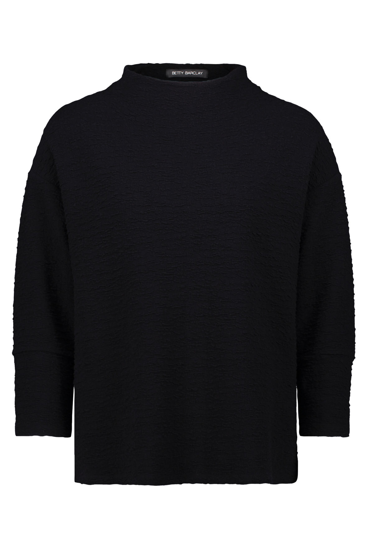 Sød bluse til vinteren, den har tekstur i stoffet og bliver populært kaldet krinklet (engelsk). Den har en overkrop med rund halsudnskæring der gør antræk til turtleneck uden helt at være det. Betty Barclay har lavet ærmerne som drop down skulder med ærme i 3/4 længde med knapper bagtil. Den har et løst snit der også favner en større barm. Eksklusiv og elegant men sådan er Betty B jo. En varm kvalitet som holder faconen, farven og som ikke krøller.
