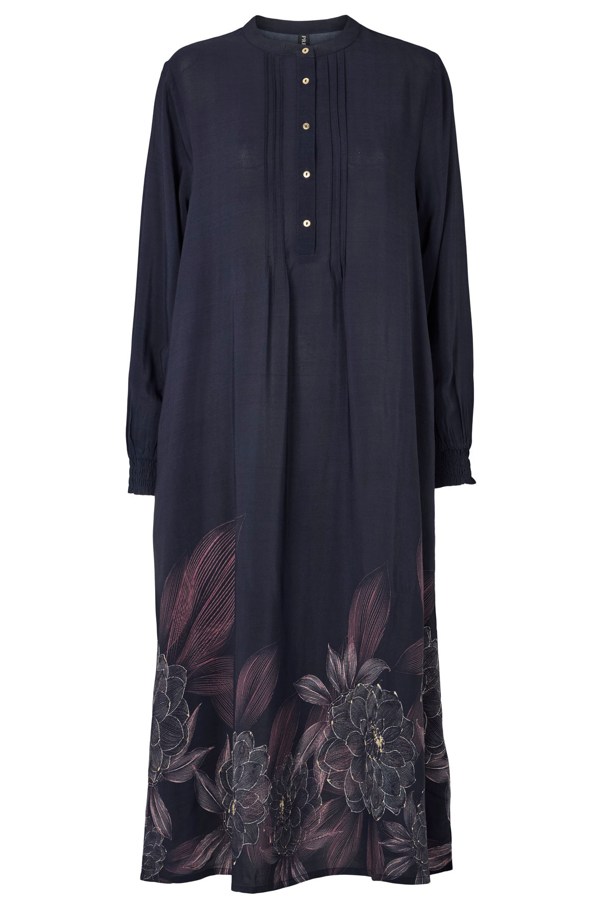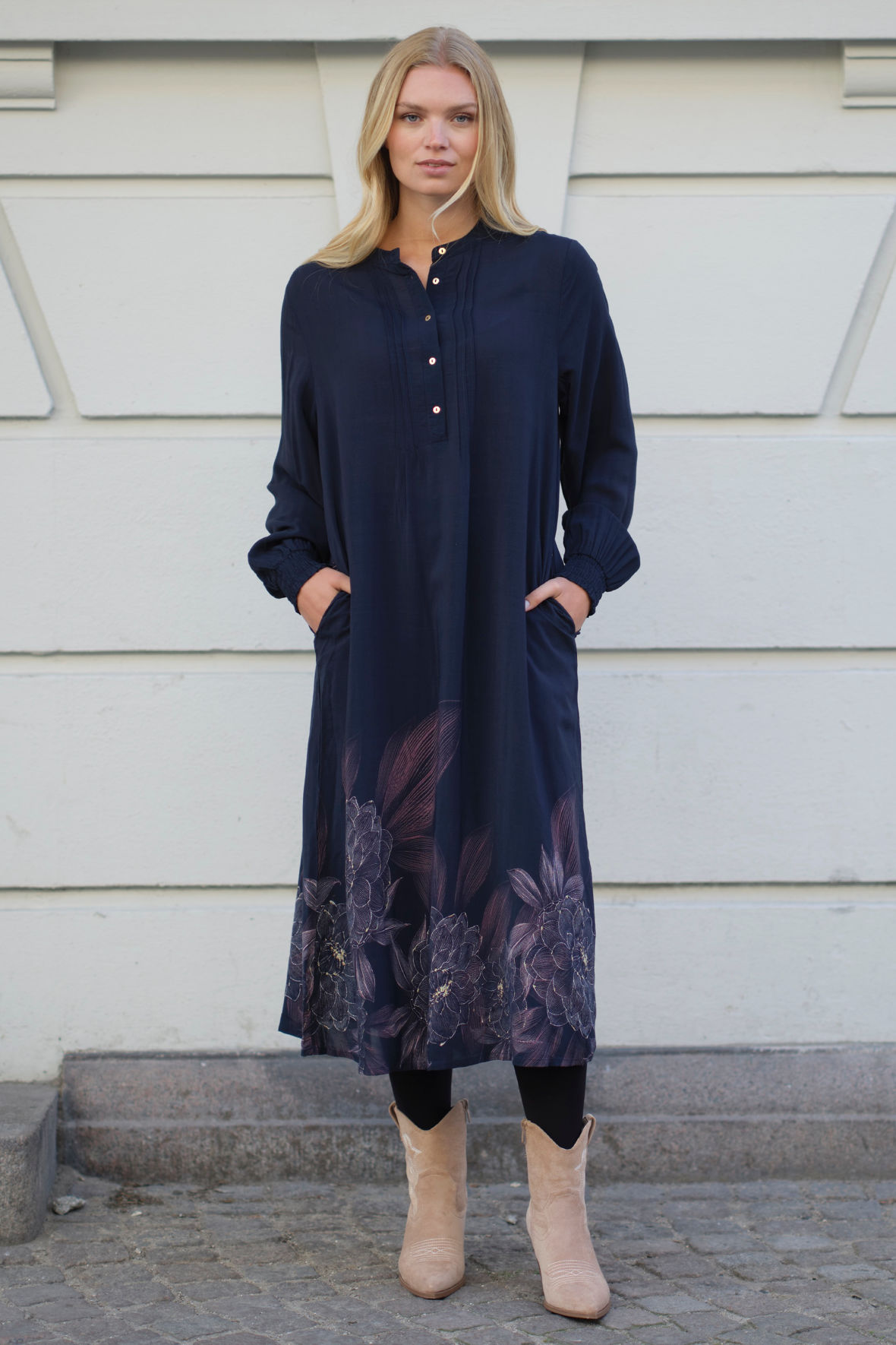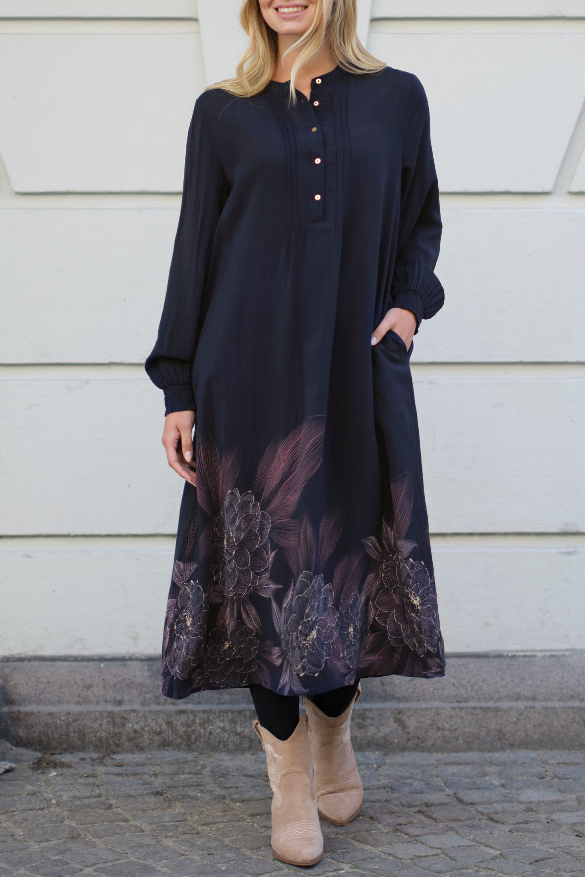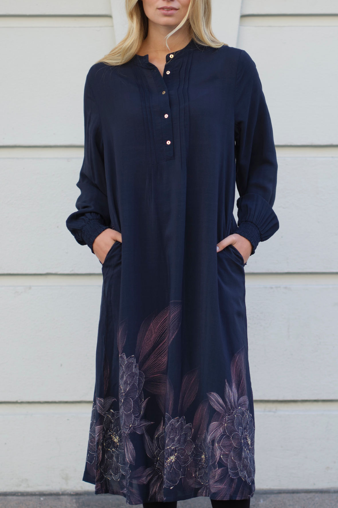 Caroline pasformen kender du måske i forvejen, her er hun som en maxi kjole i viskosekvalitet. Sikke en flot farvesammensætning med print nederst. Caroline har rund Kina krave der ligger ned, herunder kort knapstolpe med guldknapper og de her flotte små læg ved siden af. Ærmer har afslutning ved håndled med smockelastik. I sidesømmen har den fået lommer, et smart trick der skjuler dem lidt. Rygen er helt glat og farve og print går igen. Den er lavet som sigle layer - altså i et lag uden foring. Vanen tro har Prepair lavet den lidt til den store side, det giver dig mulighed for at gå en str. ned hvis du almindeligvis ligger i mellem to str.