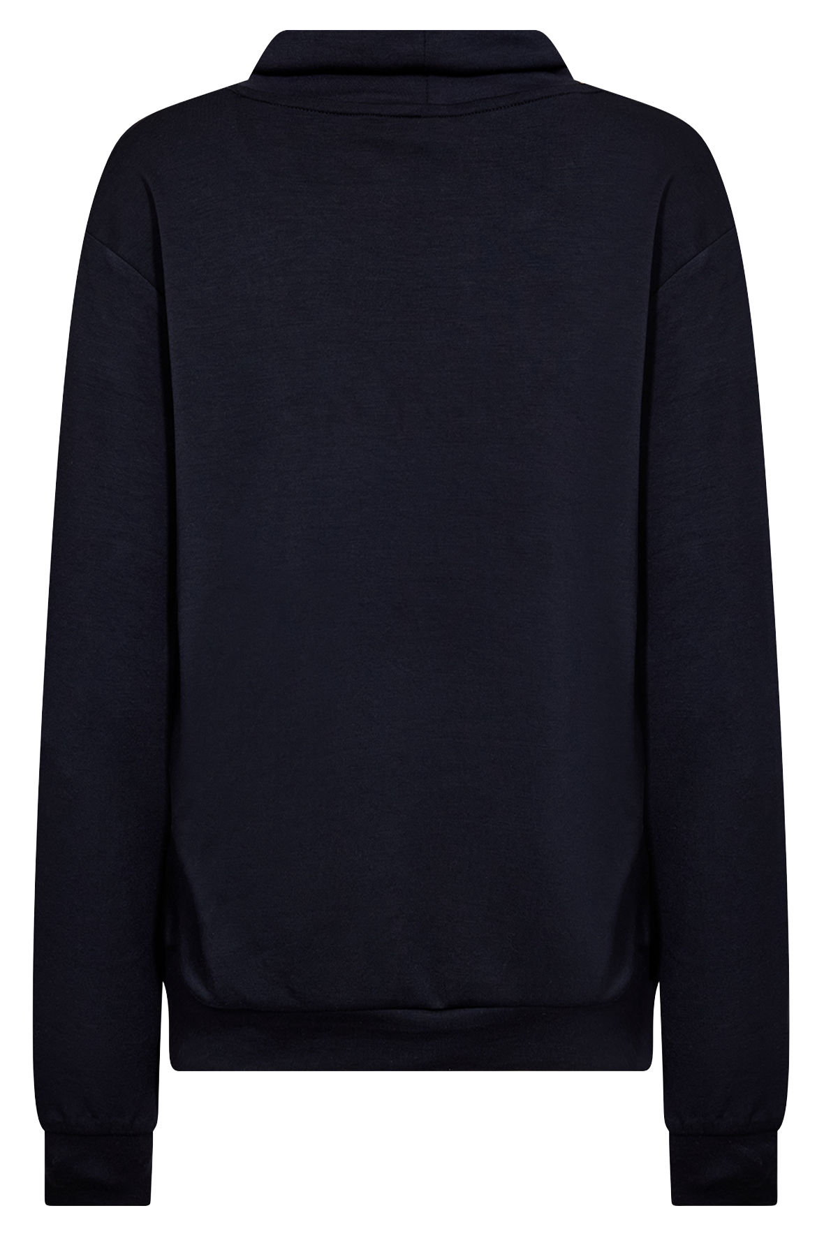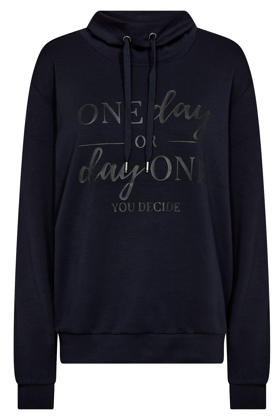 Sc-Banu i 256 modellen der kommer som sweatshirt med høj løs hals med snører. Printet er stiller det glimrende spørgsmål "en dag eller dag et" der jo absolut er dit valg. Den har lange ærmer med manchetter der også går igen som kant ved hofter. Banu er den casual serie fra SoyaConcept og giver dig friheden til at være afslappet og loose fit.