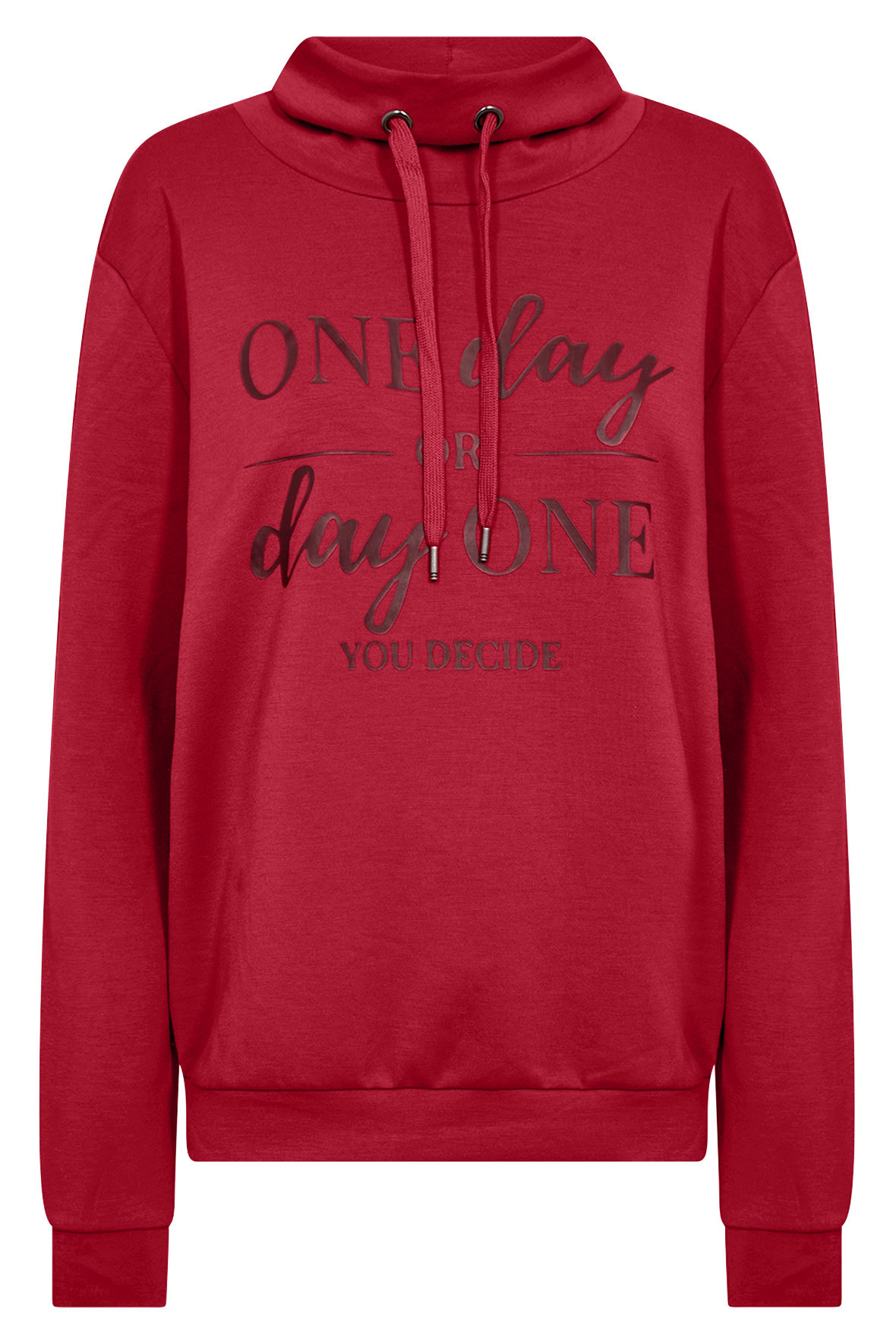 Sc-Banu i 256 modellen der kommer som sweatshirt med høj løs hals med snører. Printet er stiller det glimrende spørgsmål "en dag eller dag et" der jo absolut er dit valg. Den har lange ærmer med manchetter der også går igen som kant ved hofter. Banu er den casual serie fra SoyaConcept og giver dig friheden til at være afslappet og loose fit.