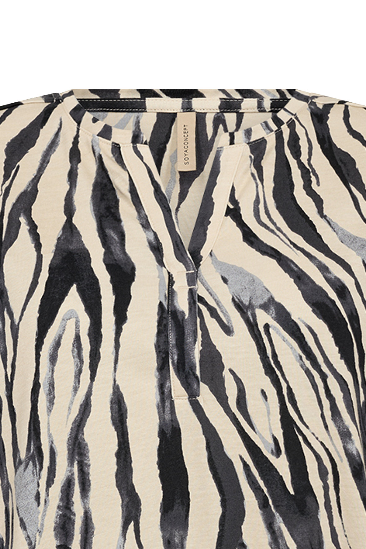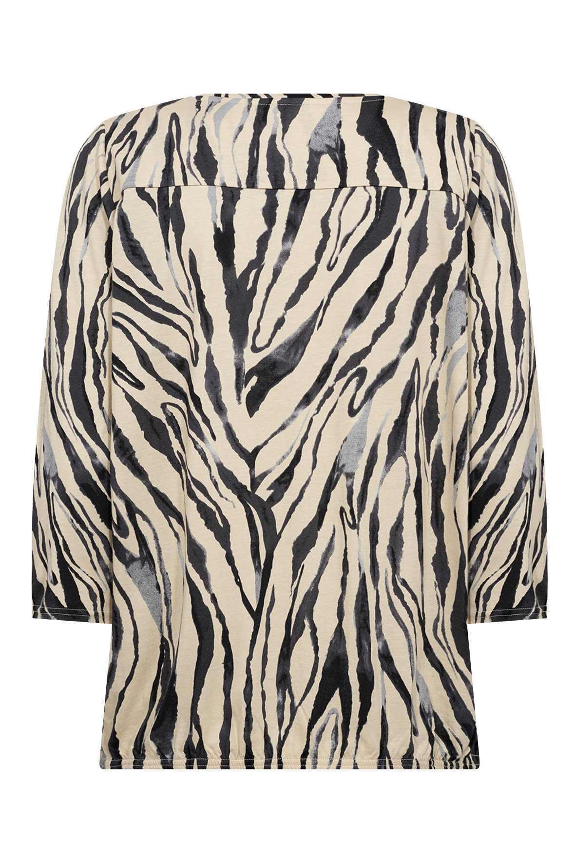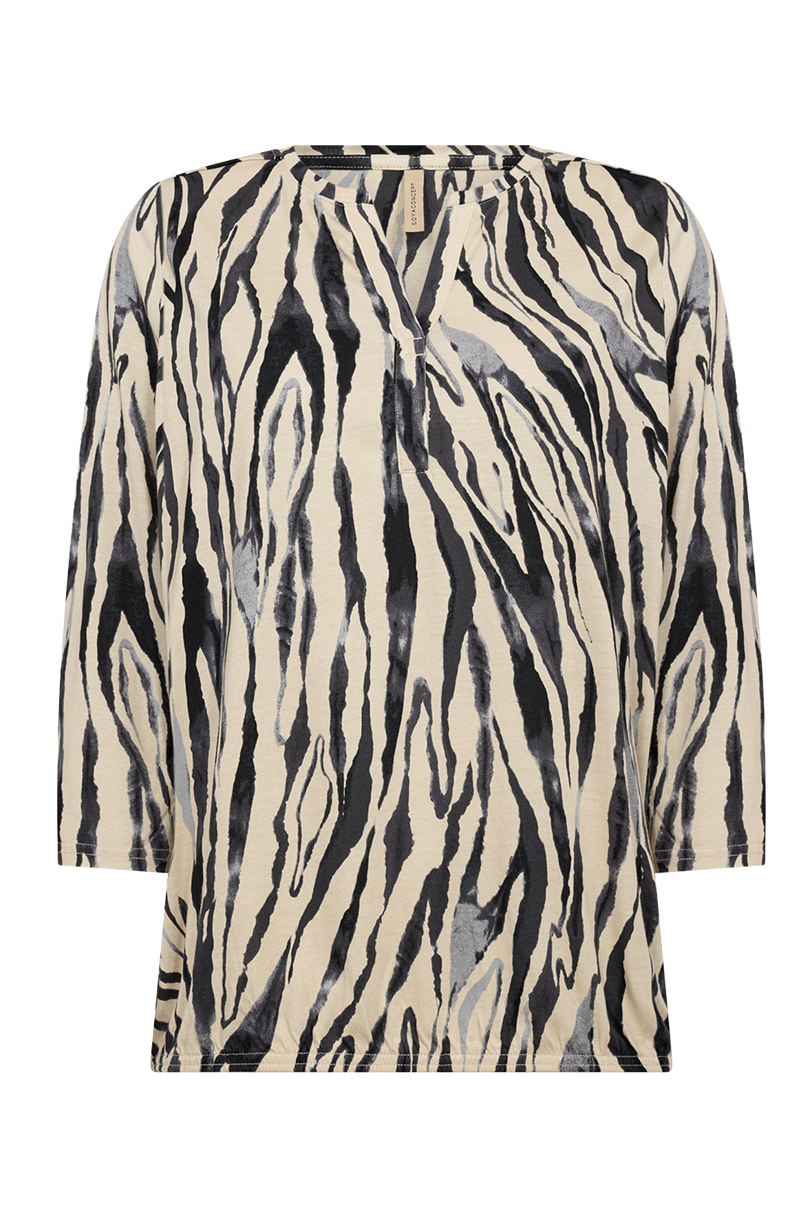 Så er du røget lige ind på den tynde SC-Felicity i Jersey. Sådan en nem lille hurtig overdel der kan så meget. Den har rund halslinje som har flot kant bånd, er med åben V-stolpe, ærmerne har 3/4 længde og giver det her friske udtryk. Ved hofter slutter den med at være mere løs fordi den har elastisk linning. Printet går i sort, grå, antracit (hold da op svært at stave til ;-) på beige bund, et glimrende valg til vinteren.