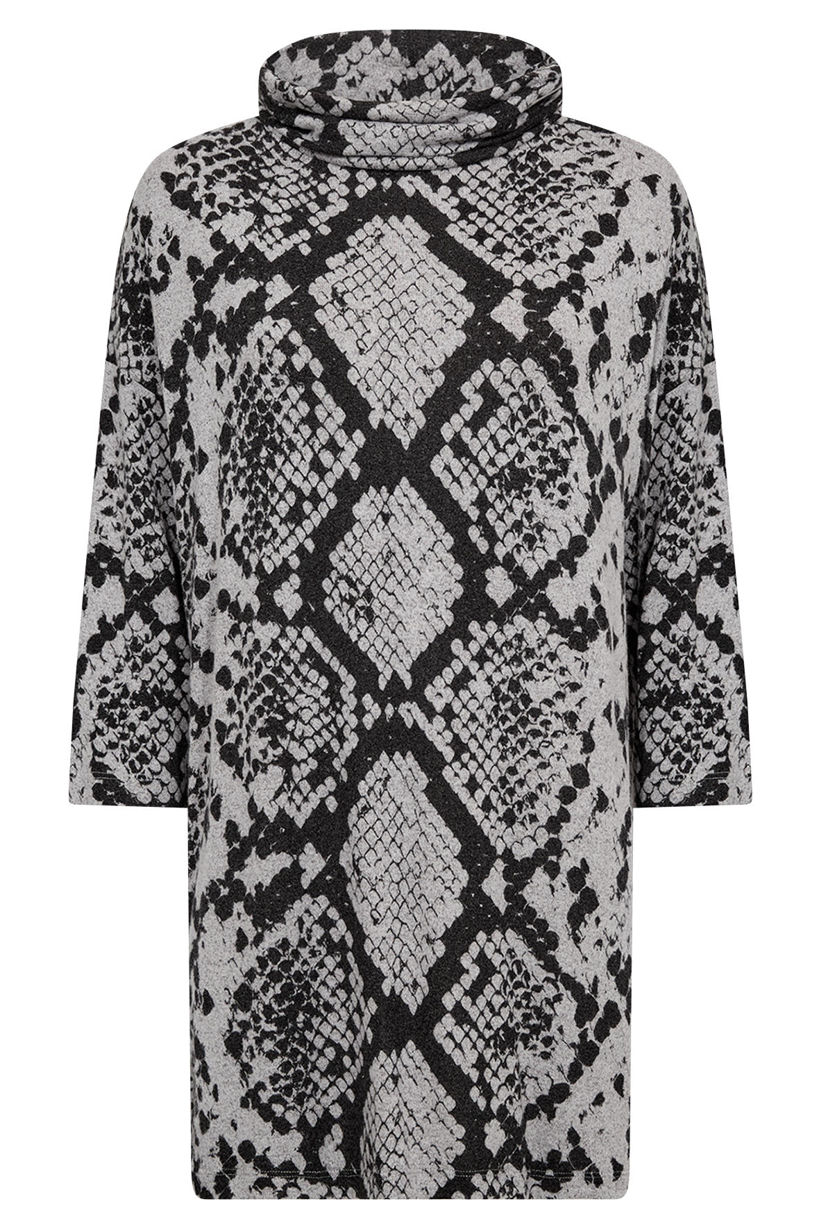 SC-Biara 146 er den letteste strik SoyaConcept laver, finmasket og så blød. Her er det en mønstret grå og sort melange strik med rullekrave og ekstra længde der dækker bagen. Den har løs pasform og har ærmer med drop down skulder. Holder farve, facon og krøller ikke.