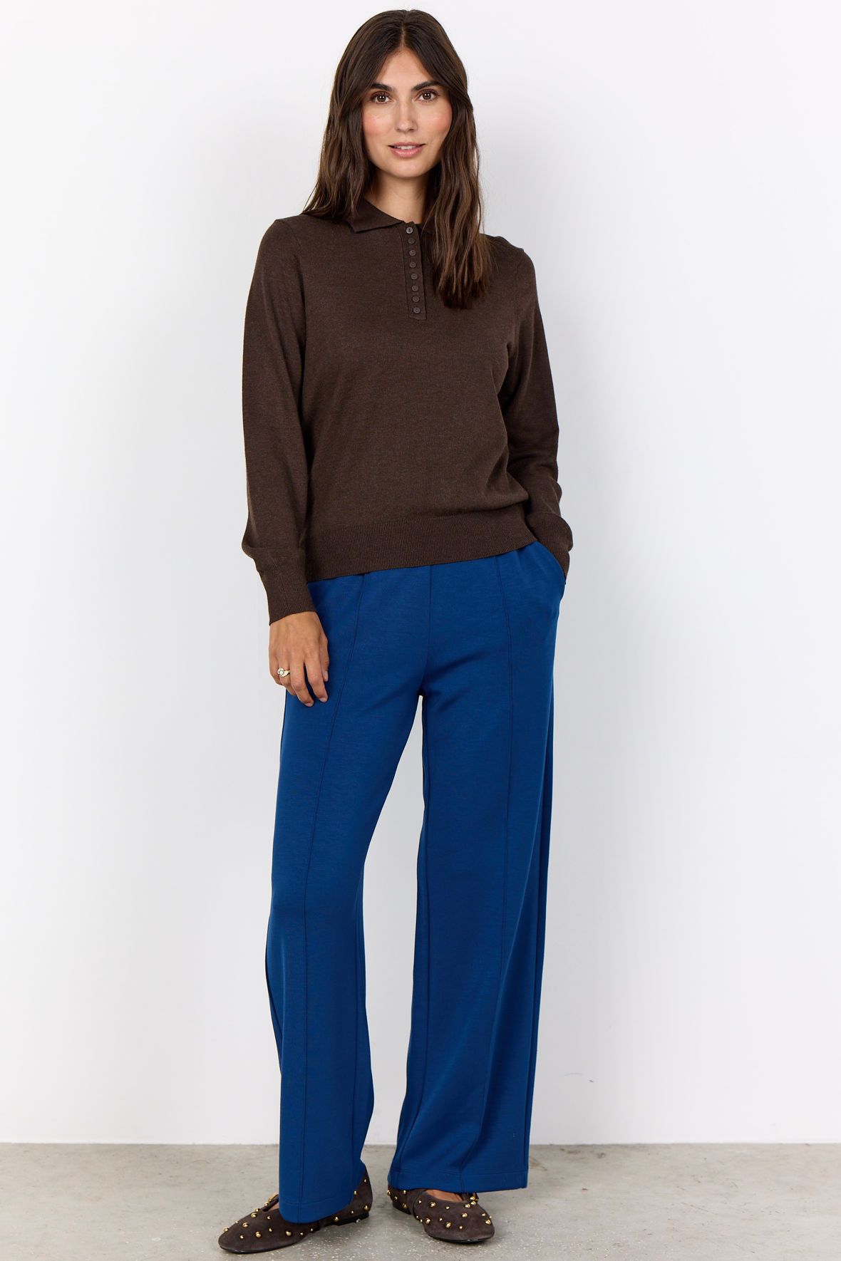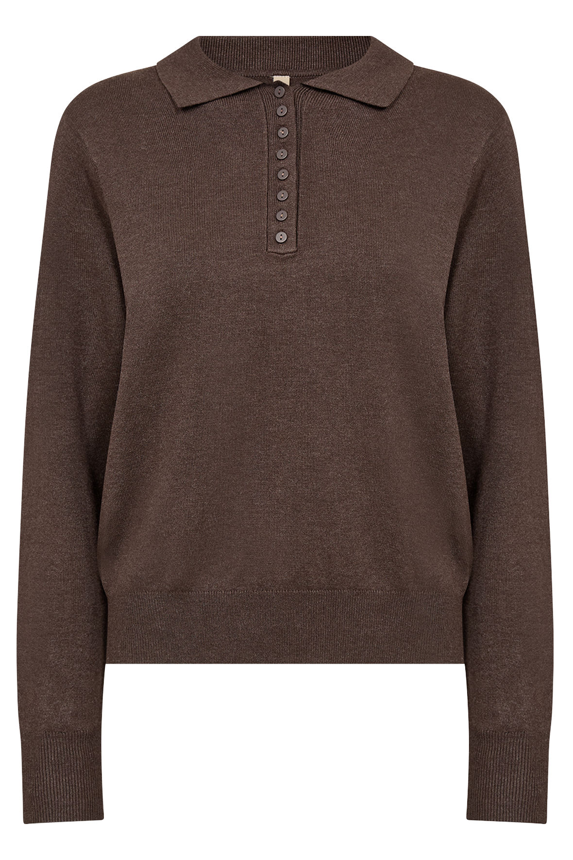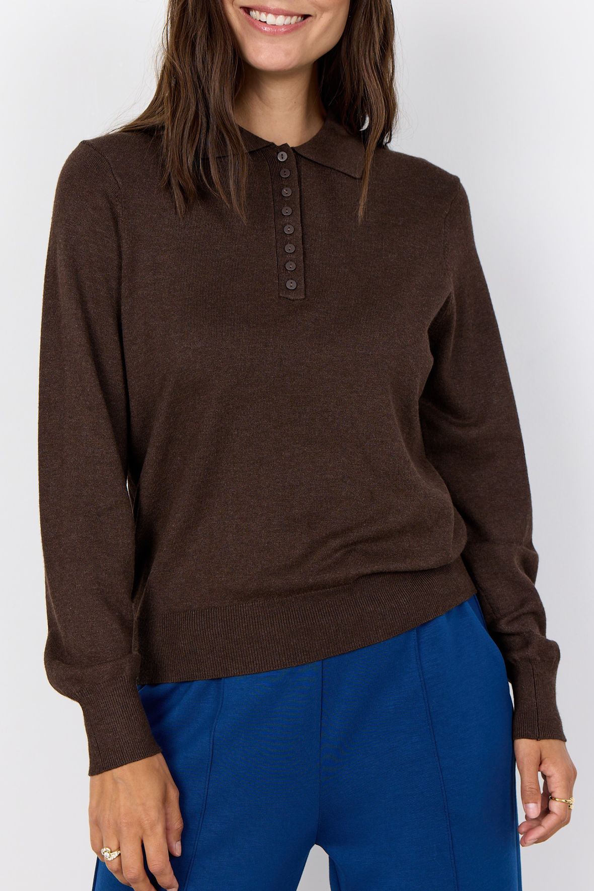 Uhh en rigtig lækker viskose finstrik, Sc-Dollie 799 er så beghagelig blød og fylder ikke så meget. Og, SoyaConcept har rigtig godt styr på kvaliteten der er så taknemlig, den holder farve, facon og krøller ikke. En flot detalje er knapstolpen med ekstra tætsiddende knapper der giver dig gode muligheder for justering. Den er lavet med polo krave. Farven har lidt melange i sig. Fine ribstrikkanter.