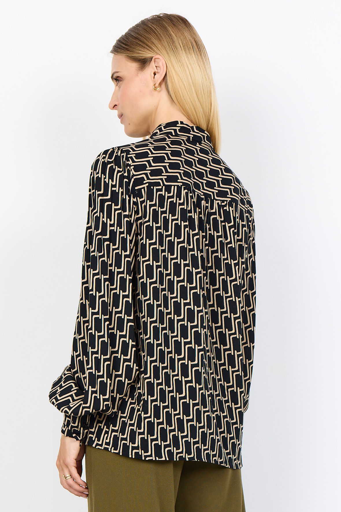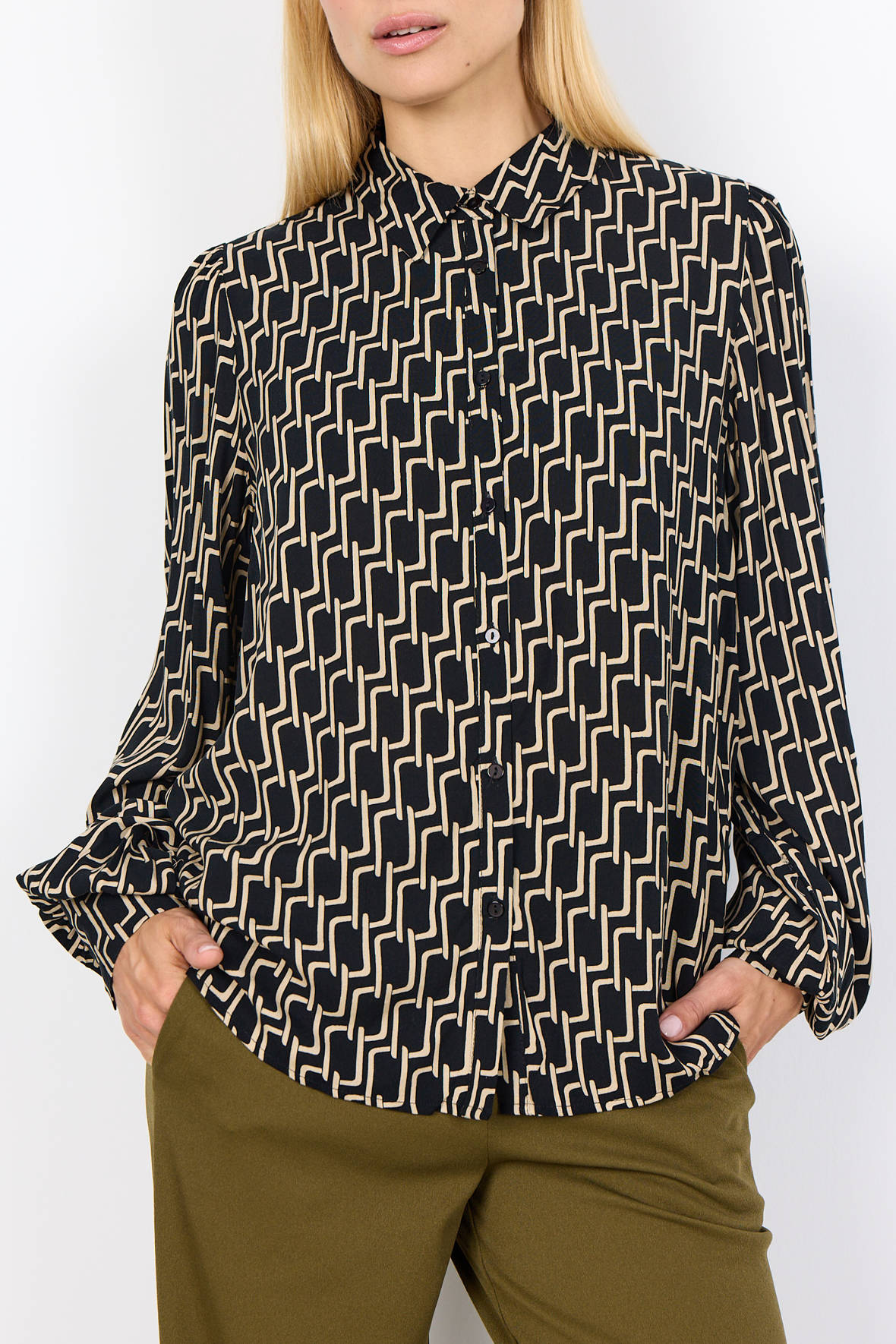 Har du nogensinde prøvet en EcoVero viskose, den er lækker fuld af gode egenskaber. SC-Varla 2 skjorten er ingen undtagelse, helt let, åndbar og naturlig. Skjorten her rummer en særlig feature, en lille design genistreg. Har du fundet den? Kig efter ærmerne, de her flot vloumen, nærmest balloneffekt. Den fremkommer selvfølgelig ved at give dem mere stof men også ved da da....at skære manchetten skrå - det ser vidlt godt ud, der er tre knapper i manchet. Ellers har den skjortekrave, gennemgående knapstolpe med sorte knapper. Skuldersømmen har lille puf. Ryggen har skillesøm med små læg. Den falder løst og bliver i øjenfaldende elegant uanset om du bærer den uden på bukserne eller stikker den ned. Den følder du dig hurtigt godt tilpas i, for den er glat og blød.