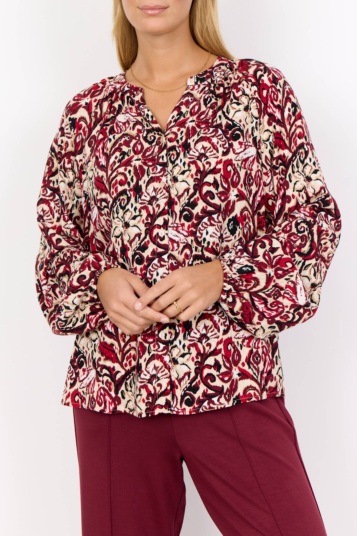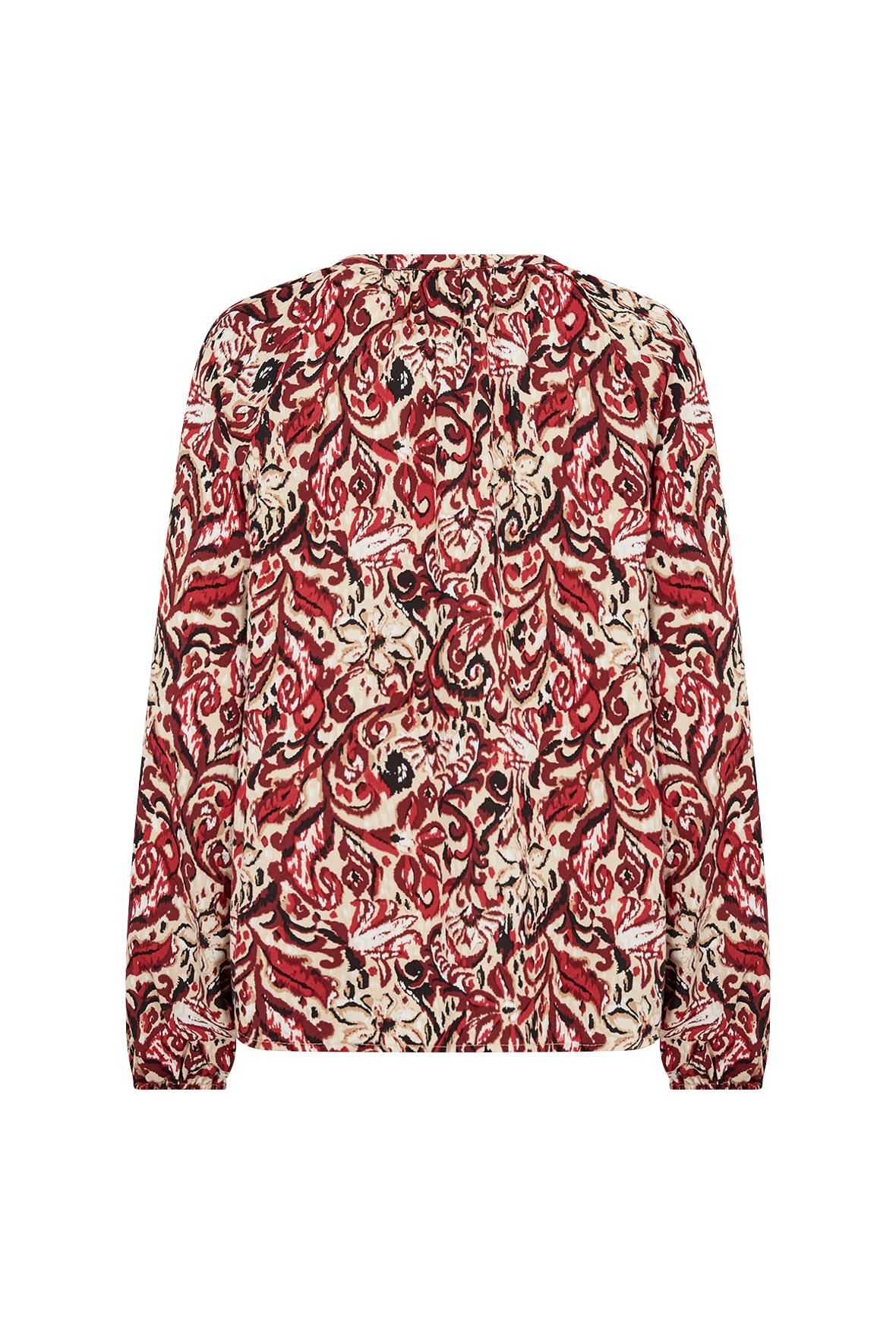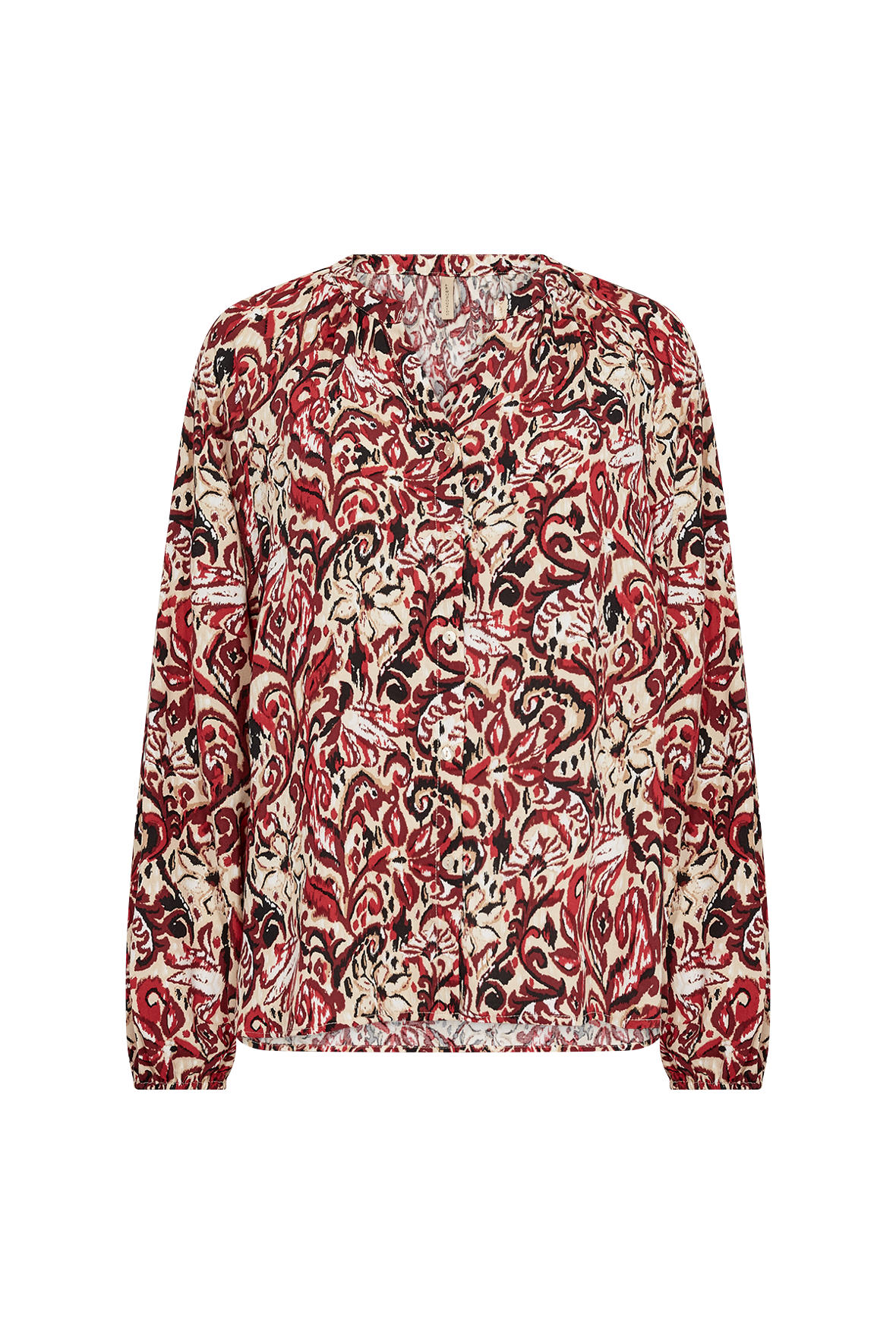 Casual blød viskose skjortebluse med print og rund halsudskæring med åben V-slids. SC-Vava har et dejligt løst snit. Langs halsen har den små læg. Ballonærmer har fuld længde, er hæftet som raglan og har smal elastik ved håndled. Uden skillesøm på ryggen men med mere længde der kan dække numsen.