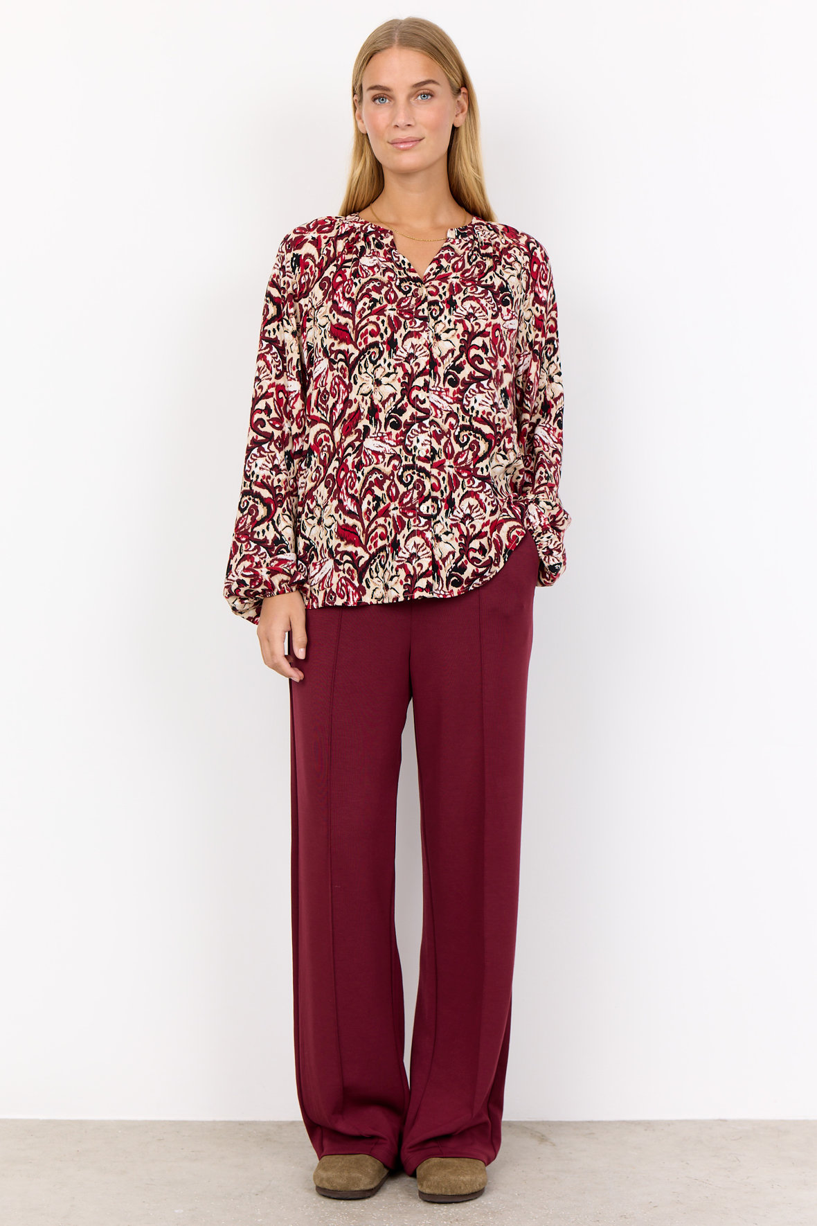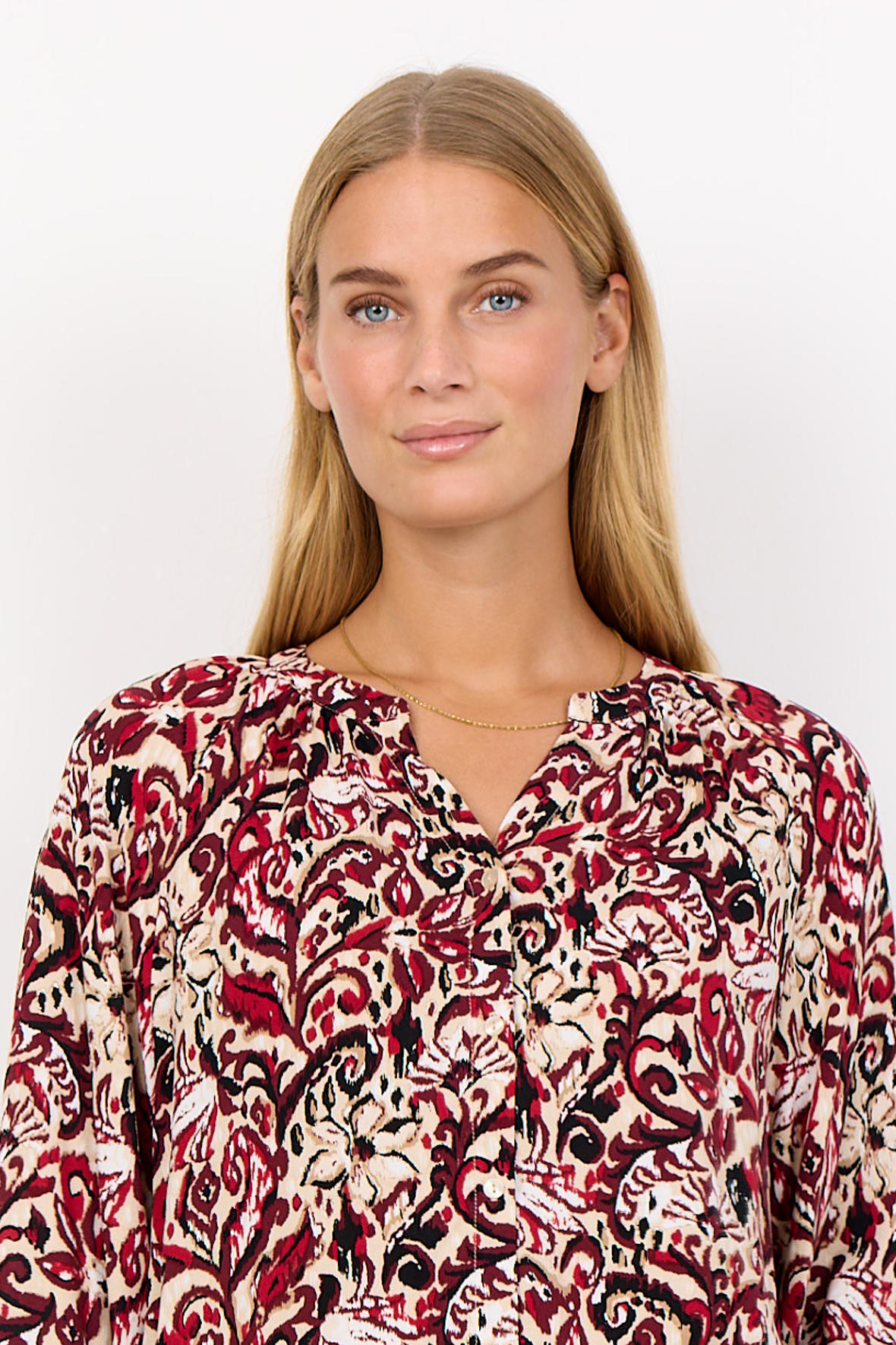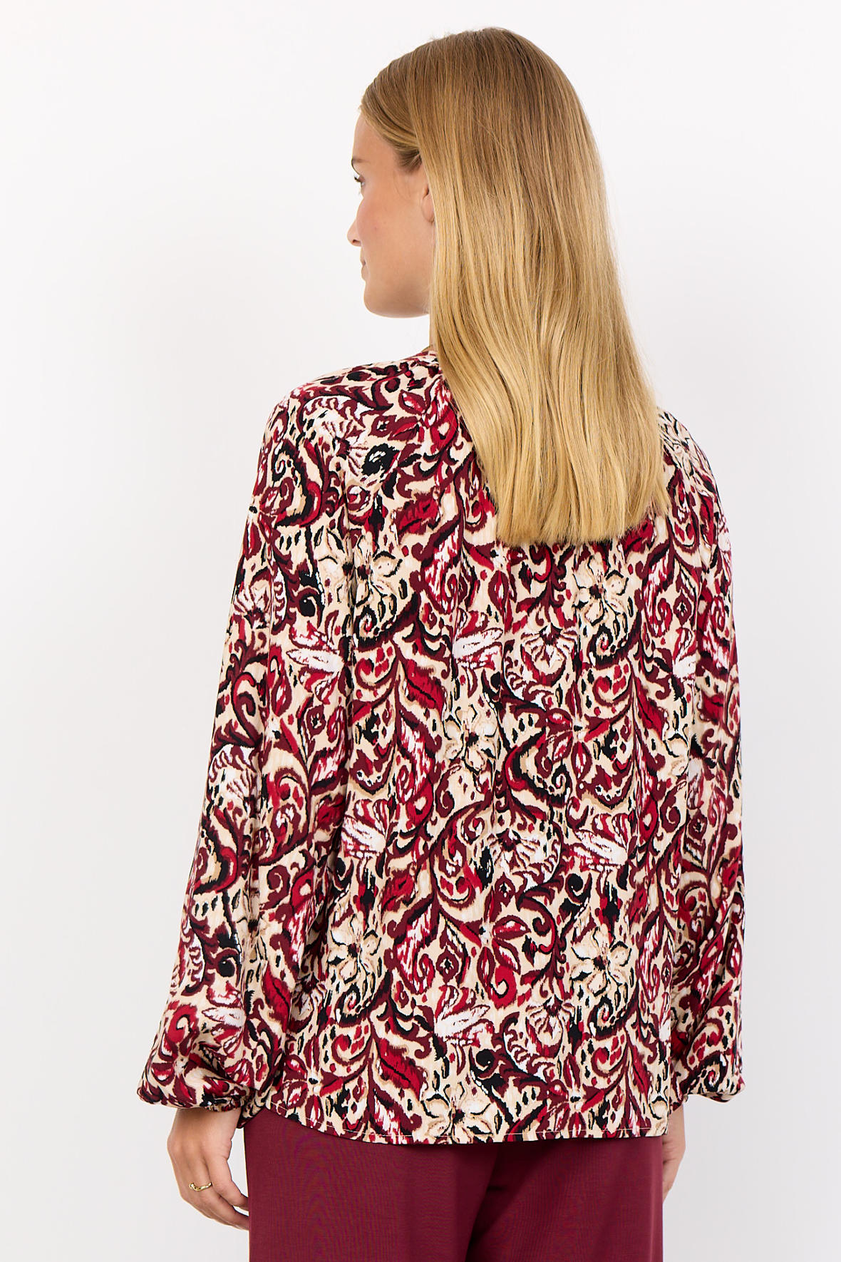 Casual blød viskose skjortebluse med print og rund halsudskæring med åben V-slids. SC-Vava har et dejligt løst snit. Langs halsen har den små læg. Ballonærmer har fuld længde, er hæftet som raglan og har smal elastik ved håndled. Uden skillesøm på ryggen men med mere længde der kan dække numsen.