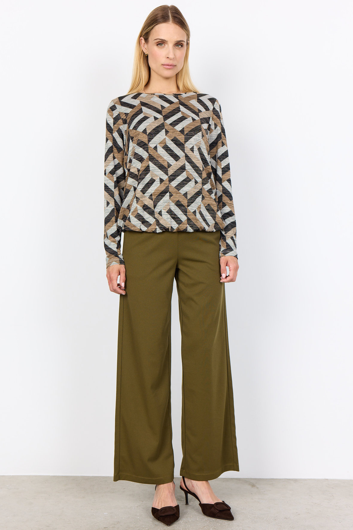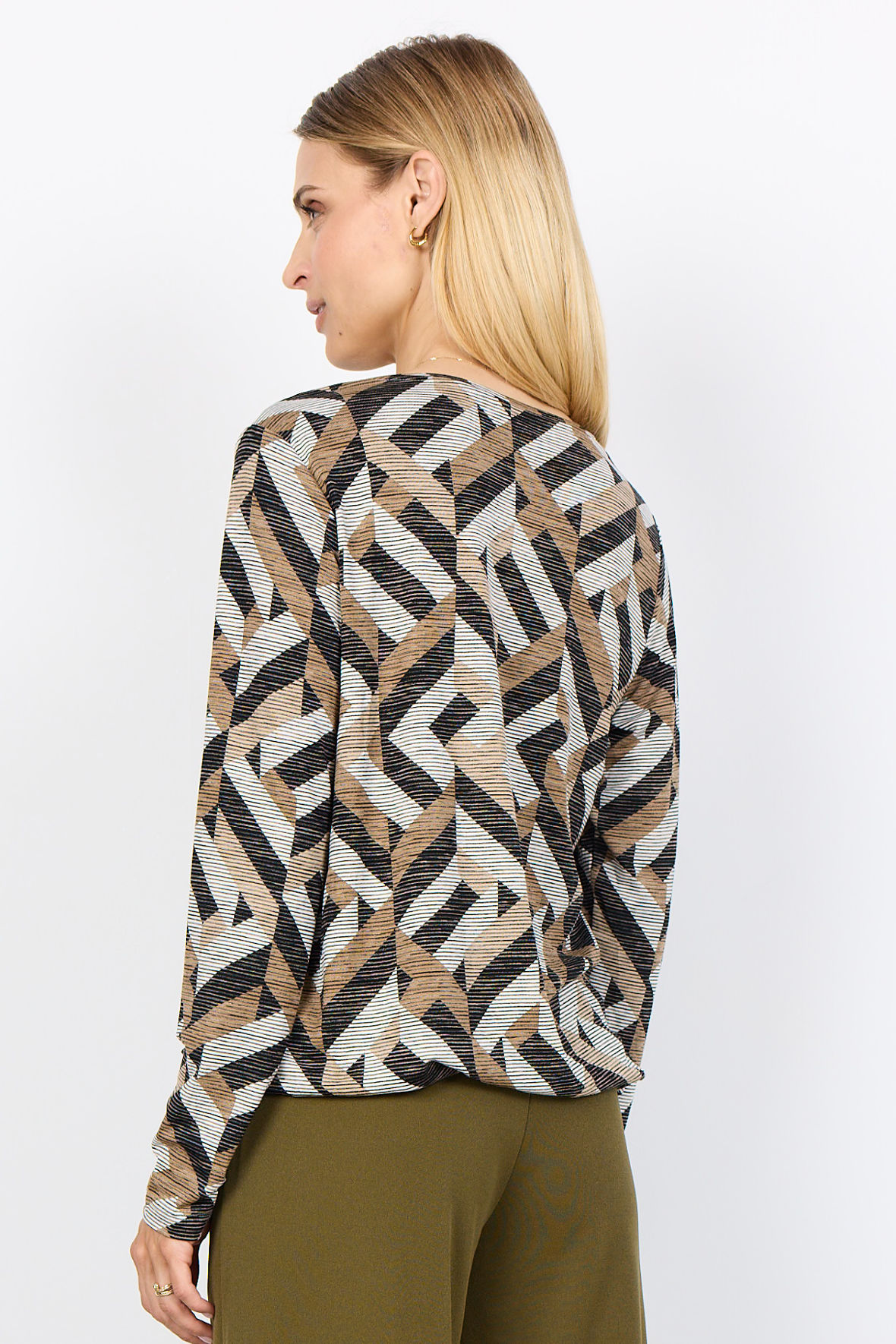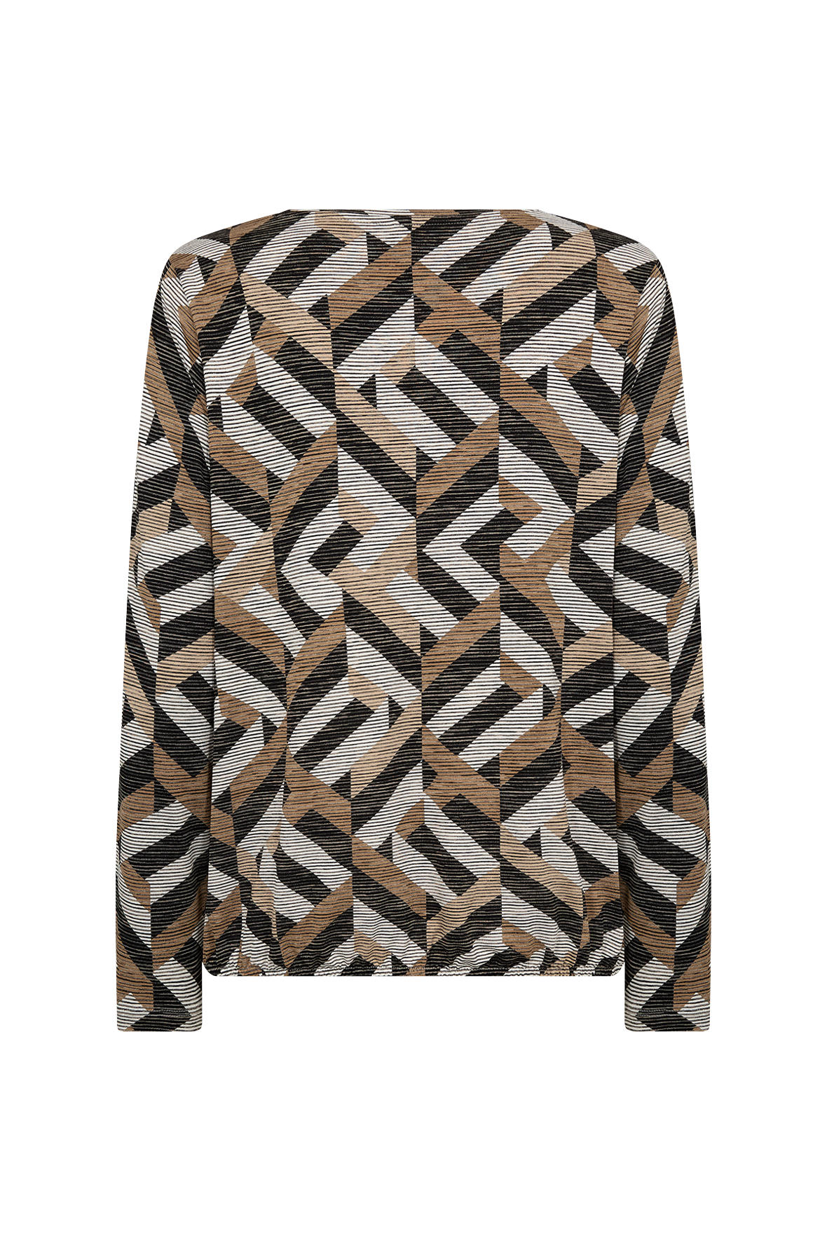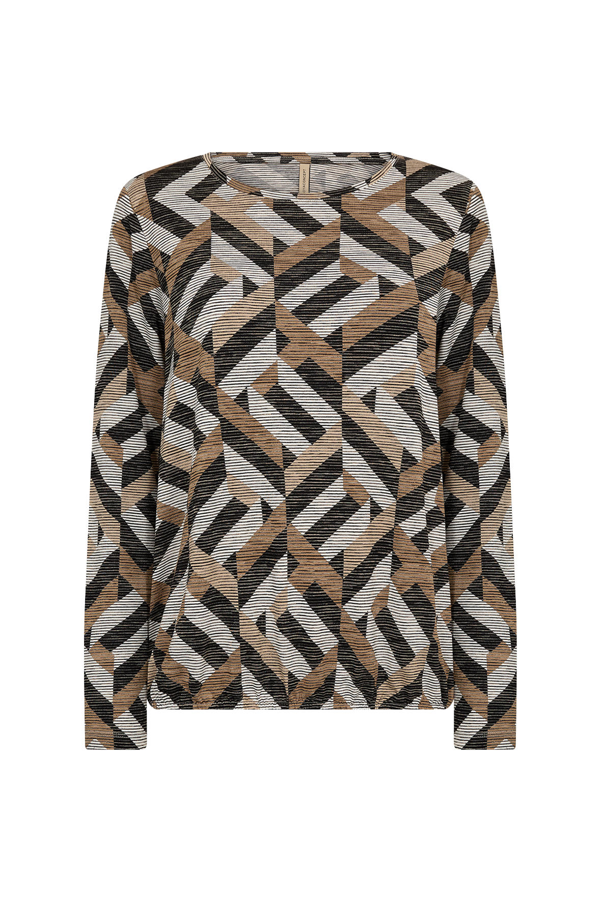 SC-Galina er tilbage i 64 versionen. Det betyder at du får en langærmet t-shirt med geometrisk print og har stadig signaturen fra Galina med - nemlig striber. Den er let og er i den grad egnet til lag på lag løsninger. Den har rund halsudskæring og kroppen slutter ved hofter med smal elastik der giver den loose fit omkring maven. Og, med Soya er kvaliteten jo helt i top selvom prisen ikke afspejler det, hvor får du ellers fantastisk pasform og en uforanderlig metervare. Den holder sig, farve, facon og pasform sker der ikke noget med.