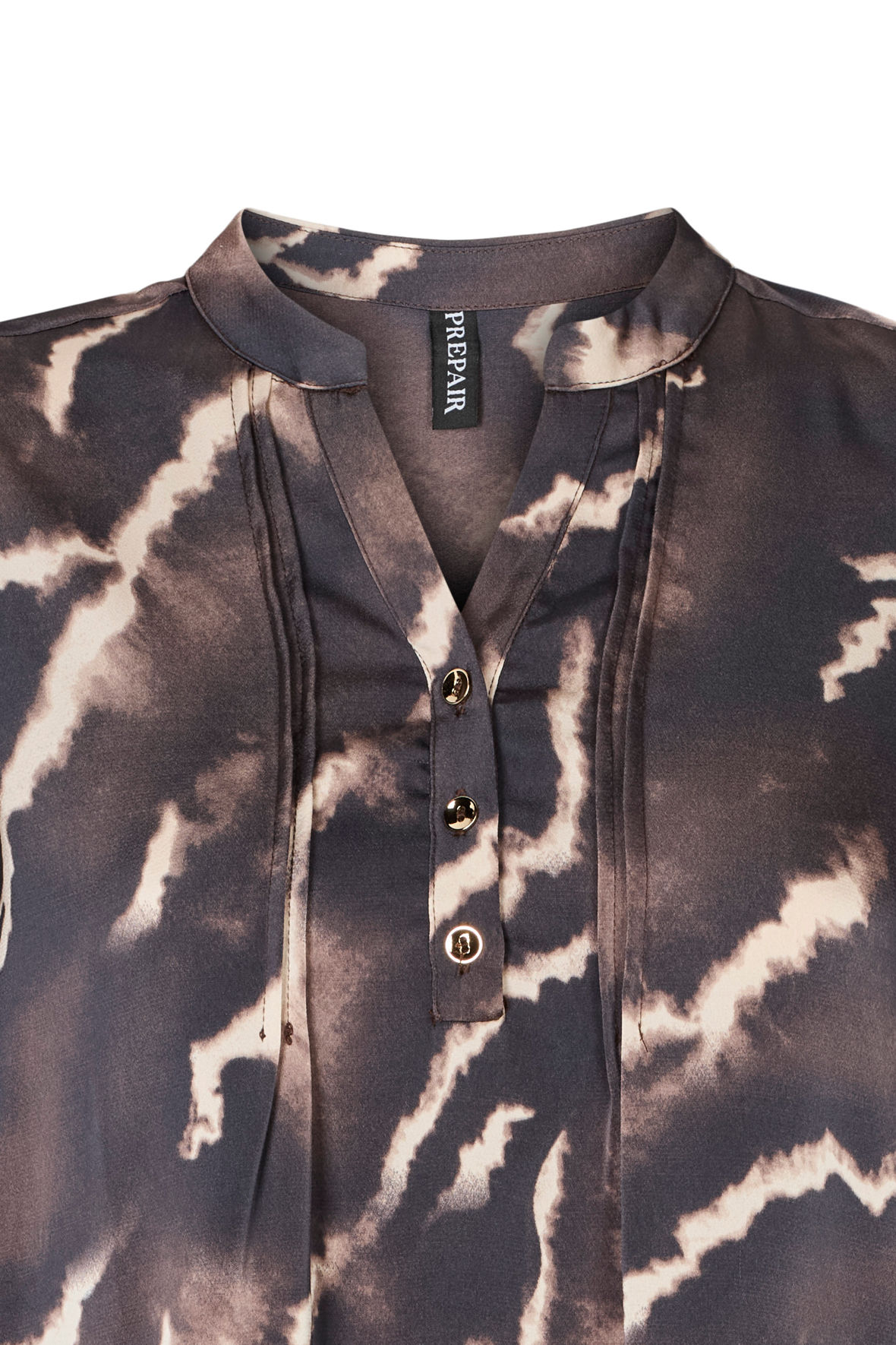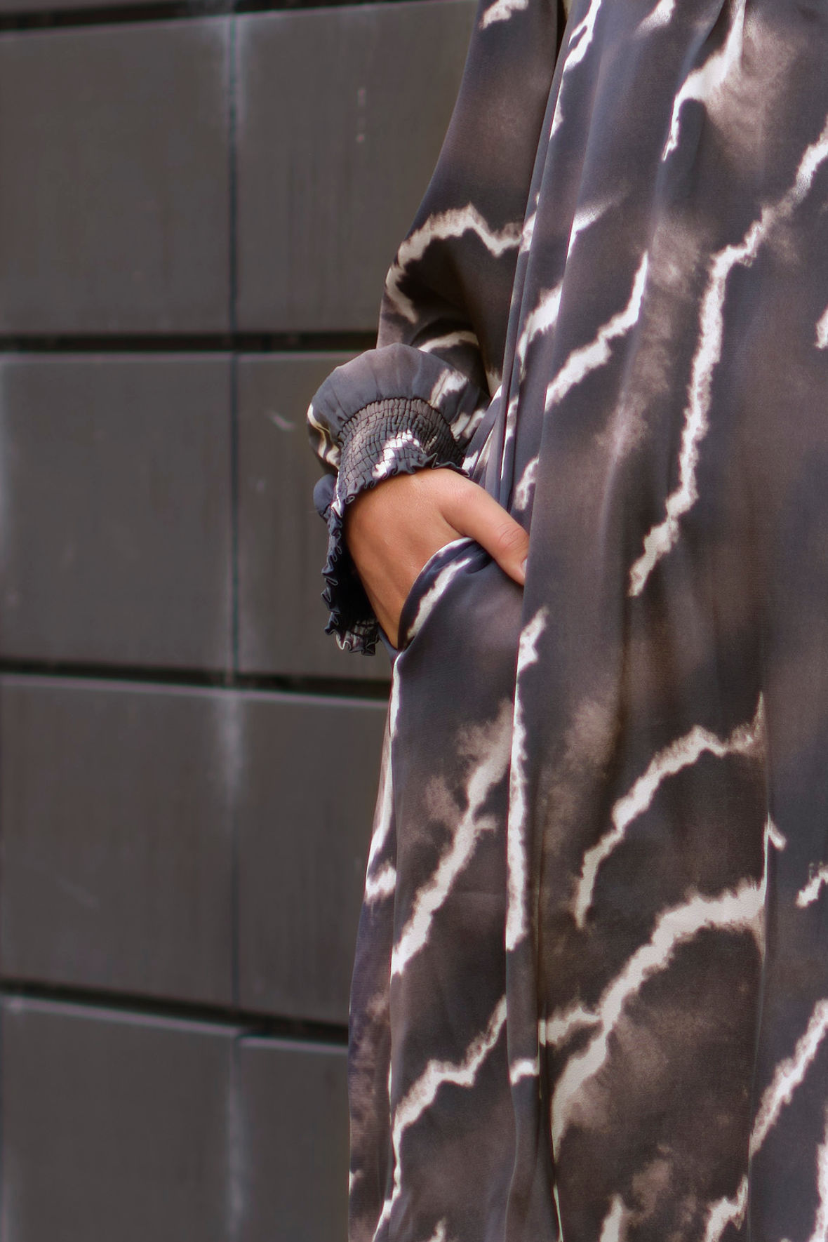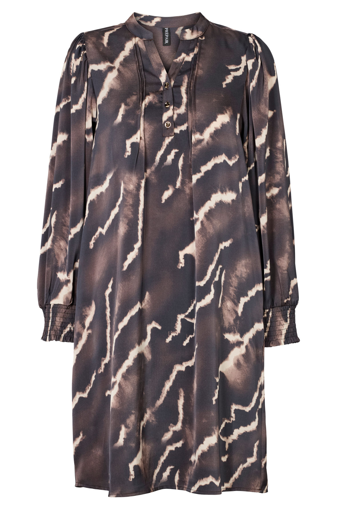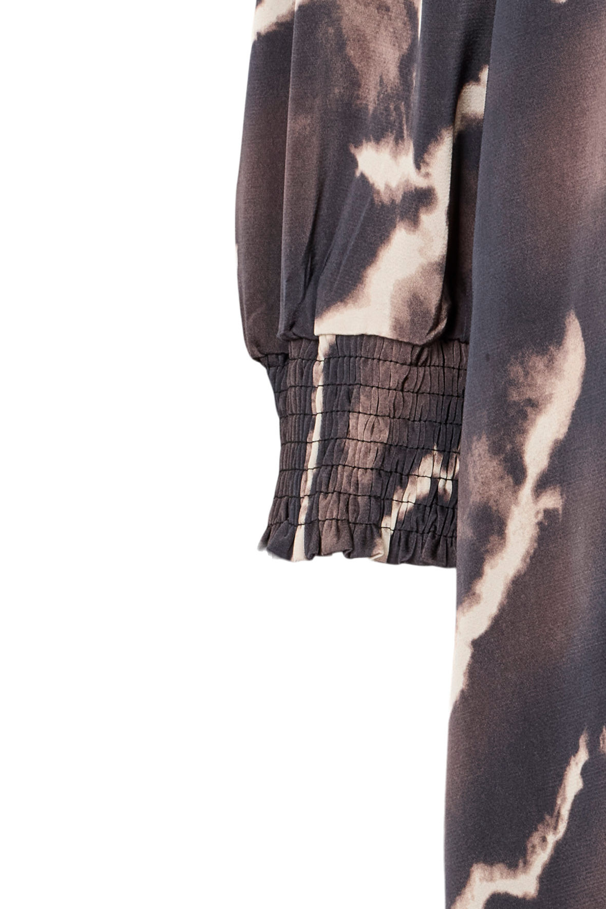 Olivia med et flot tie dye print der rummer lidt af vinterens farver. "Vasket sort" hedder farven. Den har Kina krave der ligger ned, og herunder en åben V-stolpe med guldknapper der er omkranset af små søde læg der giver lidt spræl til stoffet. Skuldre har lille puf og ærmer en flot volumen som stopper med smock elastik ved håndled. Der er lommer i sidesømmen. Ryggen har skillesøm med små rynker. Kjolen er lavet i en skindende polyester satin og som en sigle layer. Den er størrelsessvarende.