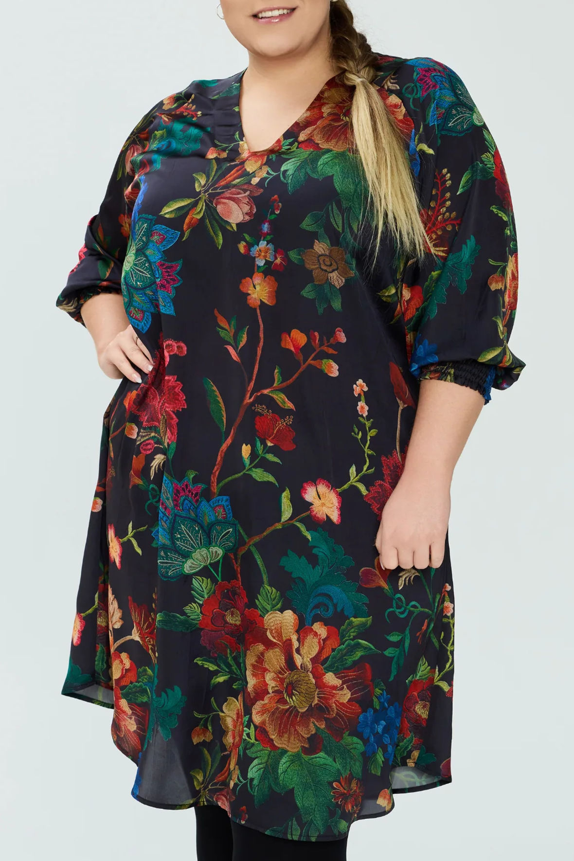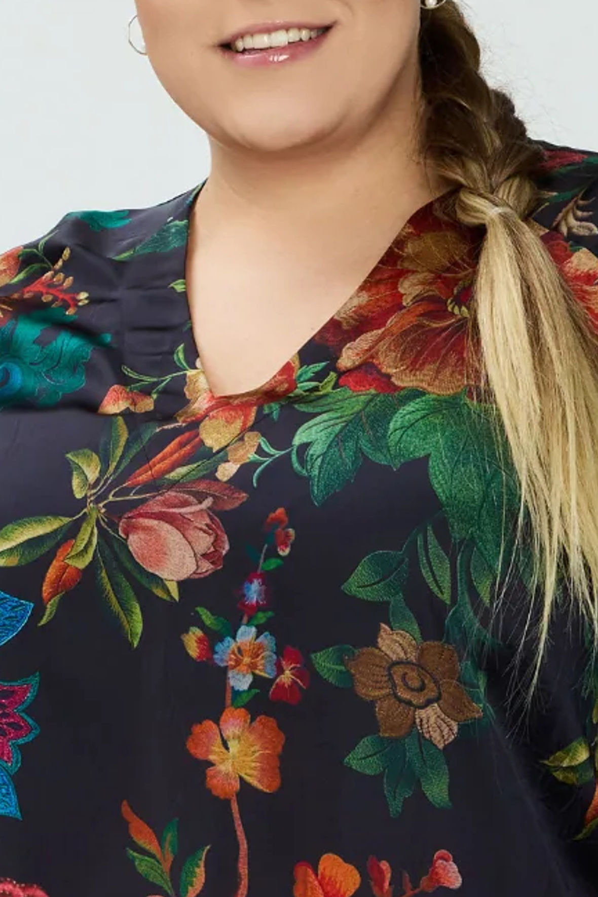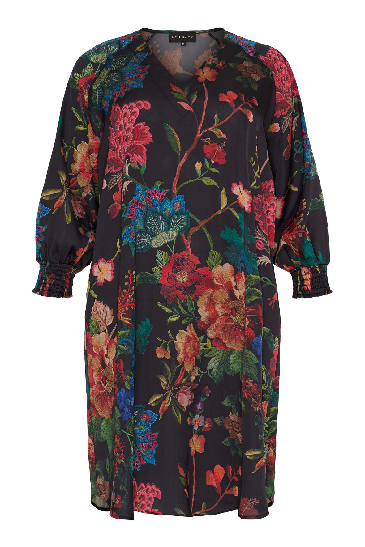 En meget smuk kjole der taler ind i det elegante og det feminine følger i den grad med. Den er lavet i polyester satin der er helt let og luftig samt er med en skindende overflade. Printet er farverigt med blomster. Den har V-udskæring og raglan ærmer i 3/4 længde hvor de slutter med smock elastik nederst. Ryggen er helt glat. Et smukt valg der vil sætte dig i fokus.