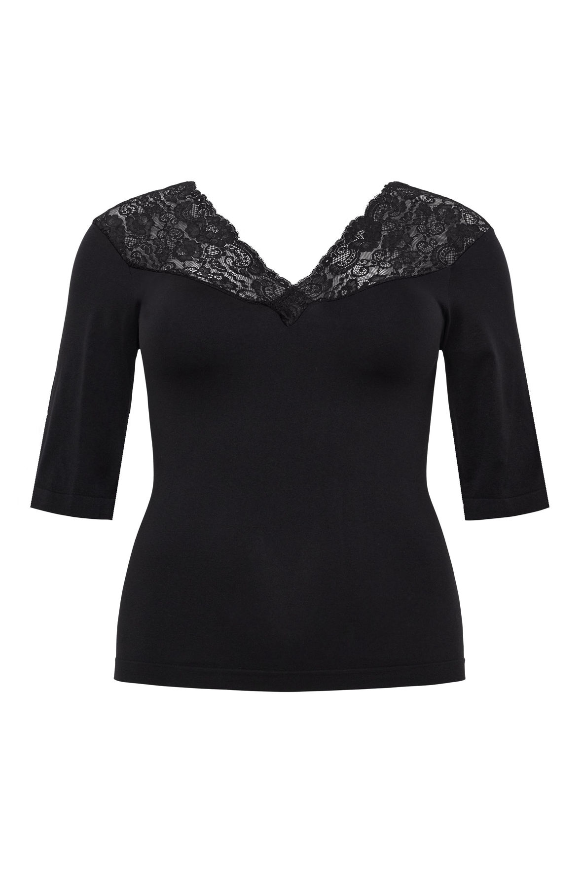 Seamless V-hals top med blid shapeeffekt, der har transparent blonde øverst samt har ærmer i 3/4 længde. Super basis top der hjælper dig på vej. Den har tætsiddende pasform og er skabt til at have under andet. Størrelsesvarende plus size.