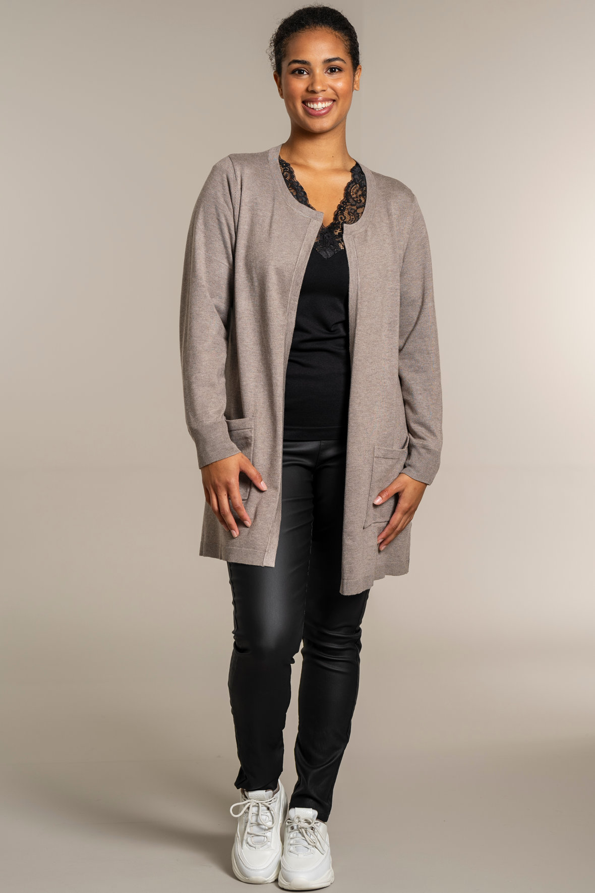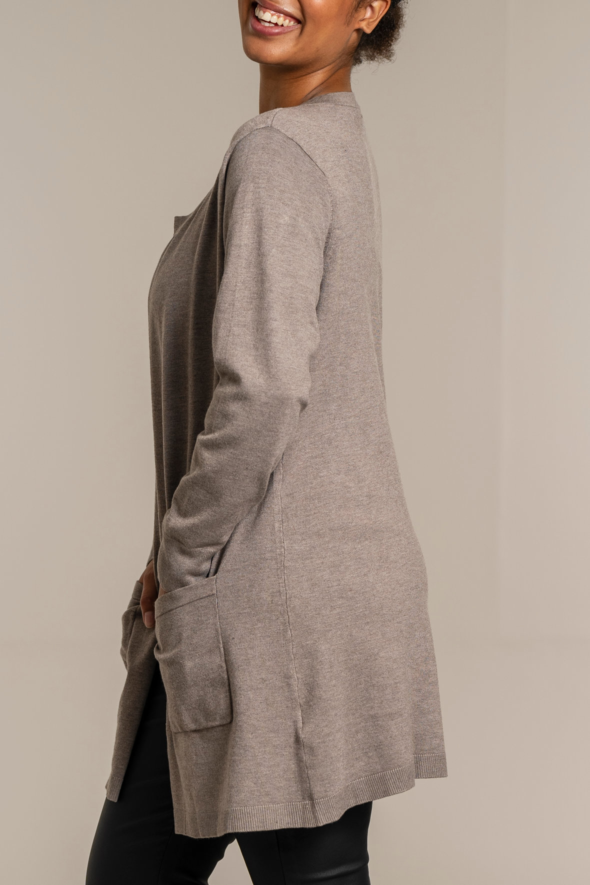 Den lange viskose finstrik cardigan Helsinki er måske en af hverdagens helte og kan faktisk være det året rundt. Den er nemlig så anvendelig men også holdbar, fordi den holder farve, facon og krøller ikke. Den er åndbar og det vil du ikke undvære i lag på lag løsninger. Den er lavet som en åben model du ikke skal knappe eller lyne. Den har to påsatte lommer. Ærmer er lavet lange og alle kanter er udstyret med ribstrik. Leg med forskellige farver under og fremhæv detaljer som halsudskæringen, eller en blonde på ærmet mulighederne er uendelige. Den er størrelsessvarende.