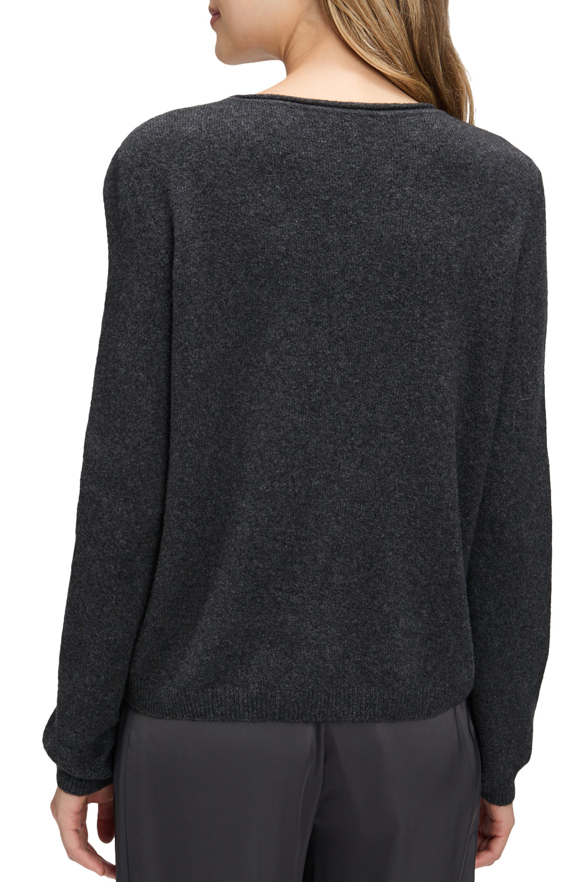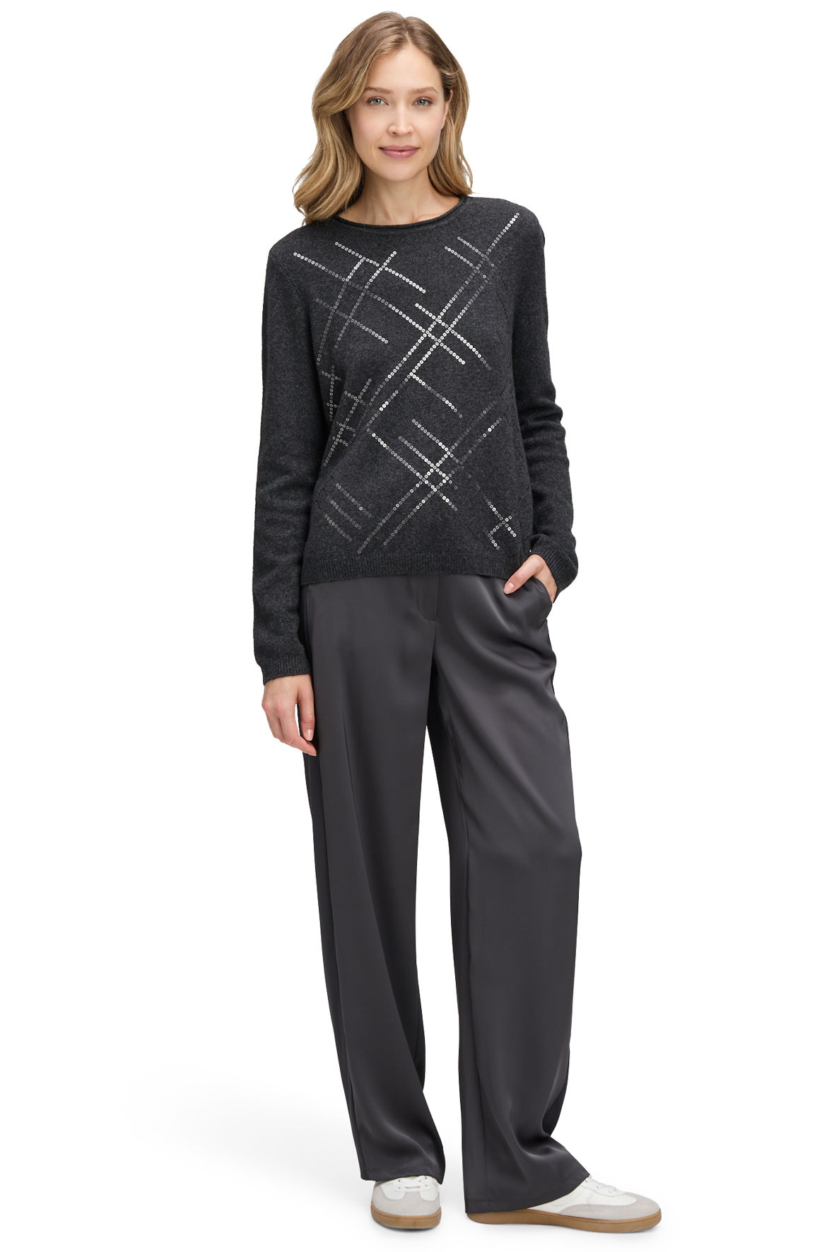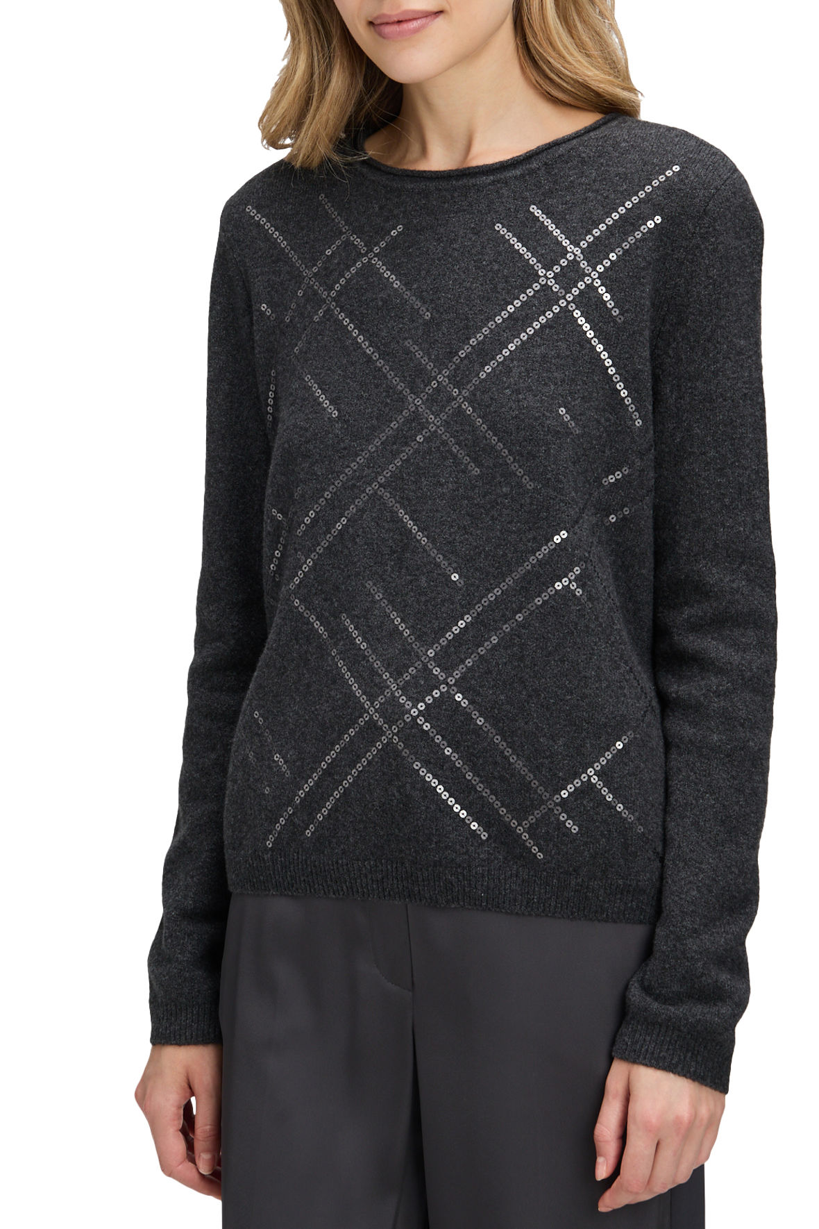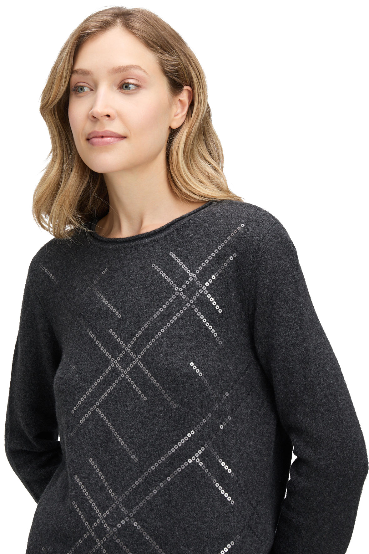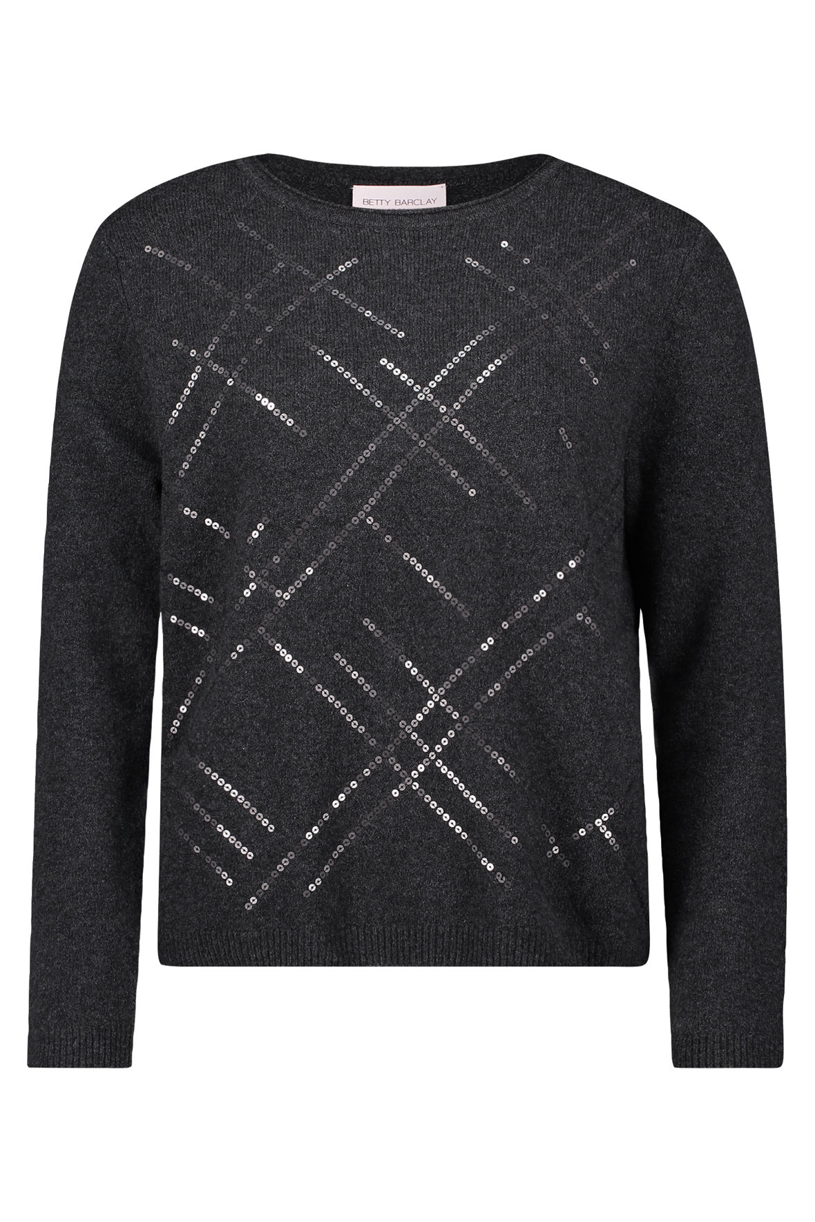 Finstrik med god brystvidde. Den har det flotteste mønster med pailetter foran, helt tone i tone der er håndsyet som virkelig sidder tæt og faktisk bliver der. Der er styr på det når Betty Barclay skal sætte navn til. Den har rund halsudskæring der er kant der ruller og ærmer slutter ved håndled med ribstrik. Og, samme går igen ved linning/hofter. Den er fra So Cosy serien, derfor er den også ekstra blød og vamset. Den holder sig pæn.