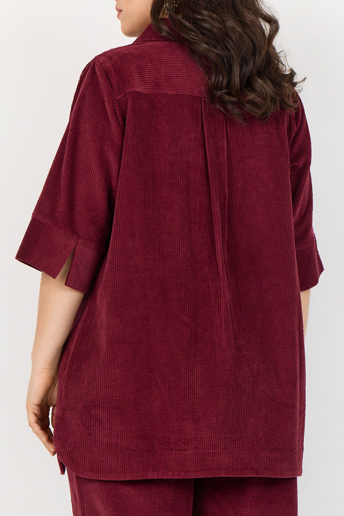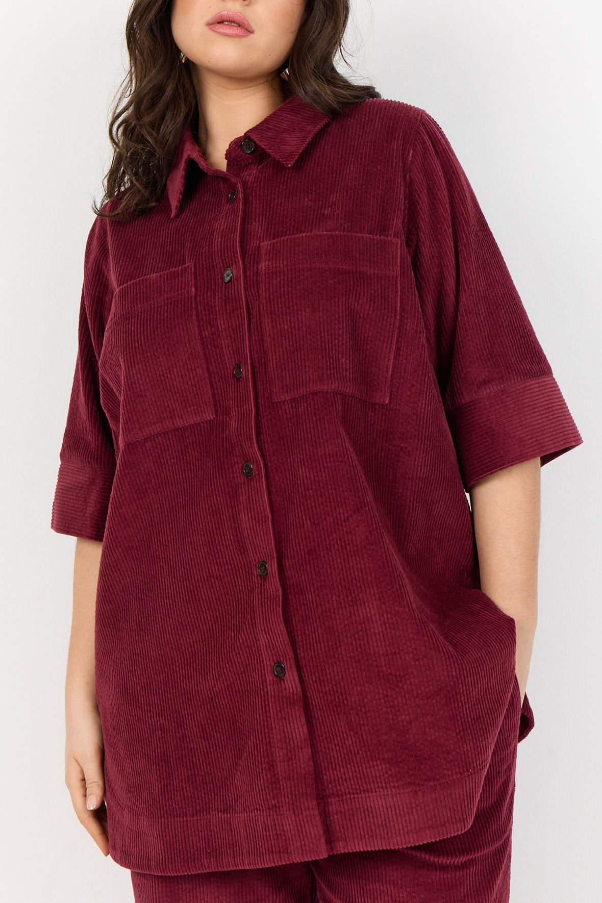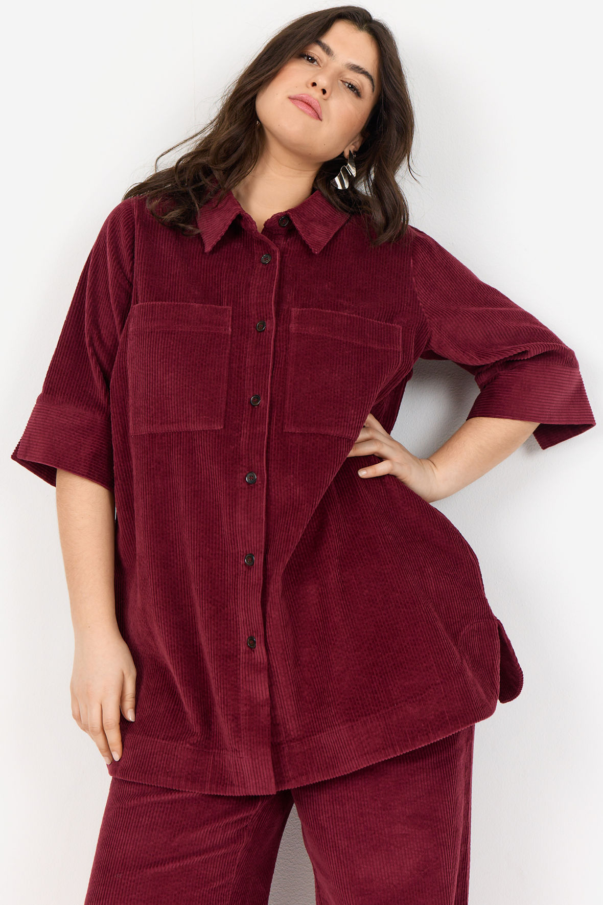 Fløjl er hot og det hører årstiden til. WA-Nadin er lavet som skjorte med krave, herunder knapstolpe og på brystet to påsatte lommer. Ærmer i 3/4 længde med god plads og slids manchet. Den har skillesøm på ryggen. Strukturen i fløjlen hører til de finere. Den har en længde der slutter under bagen, derfor har den også fået slids i siden. WasabiConcept er så gode til plus size med gedigne kvaliteter.