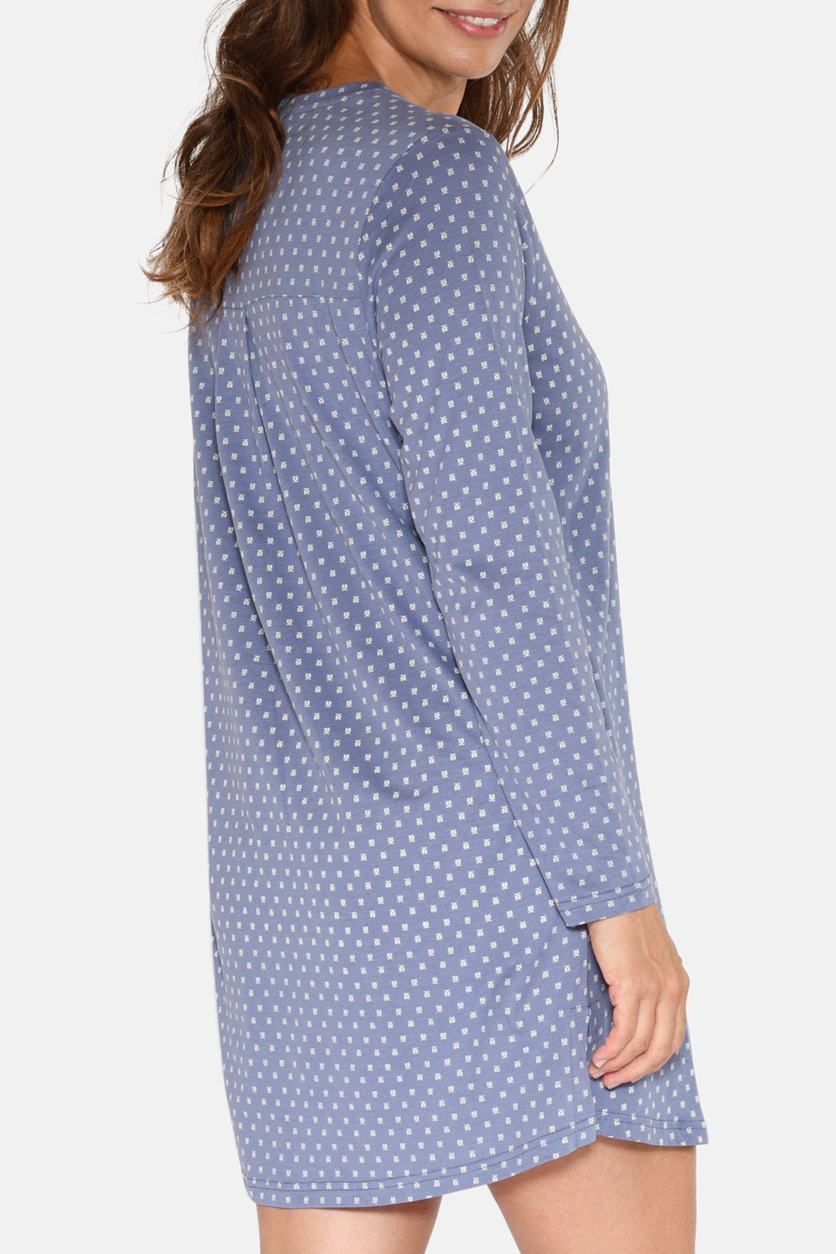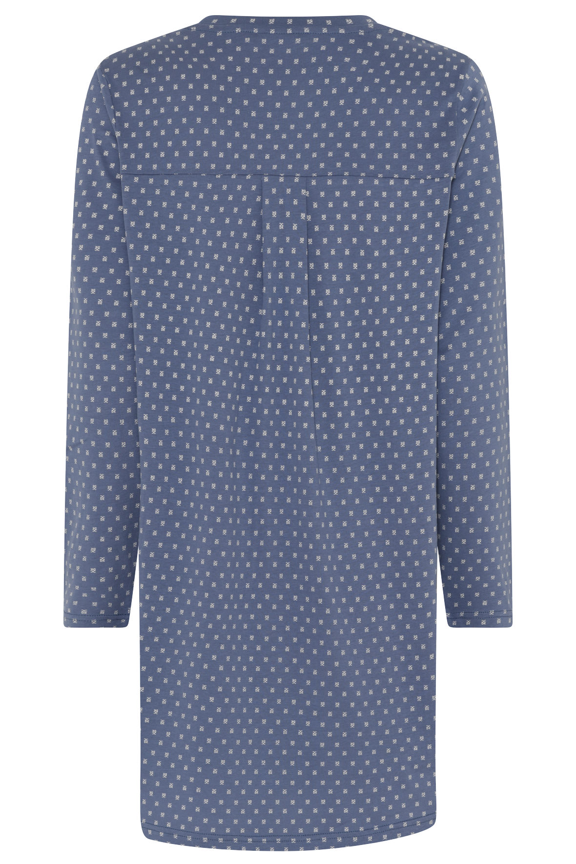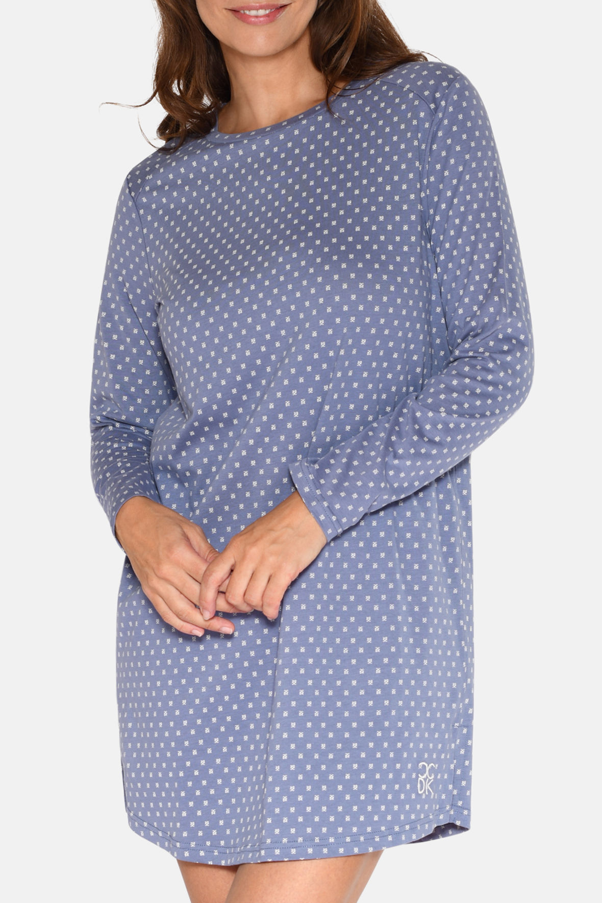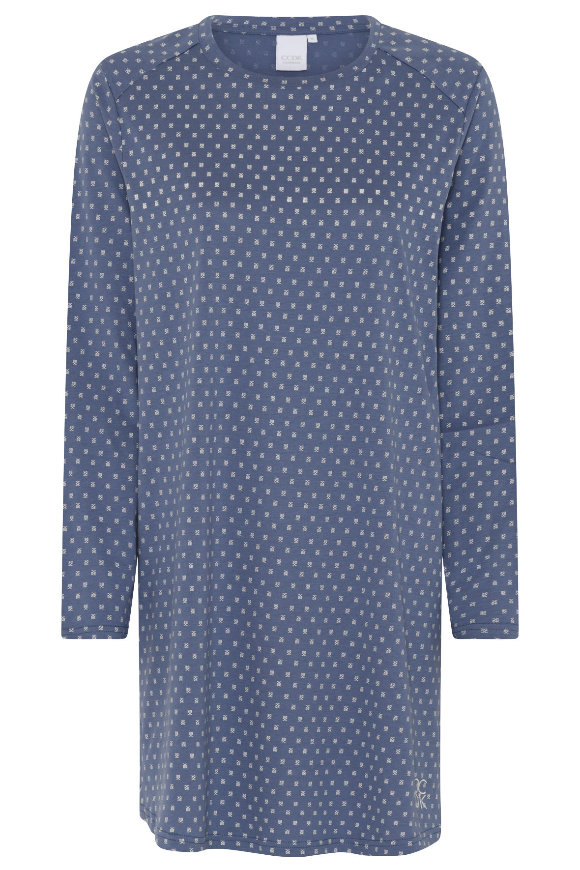 Nicole er en langærmet natkjole med all over print. Med rund halsudskæring, den er er blå i bunden og har CCDK print i hvidt der ligner snefnug. Lavet i økologisk bomuld for dejligt velvære. Den er temperaturregulerende og åndbar. Med løst snit. Skillesøm på ryggen med læg.