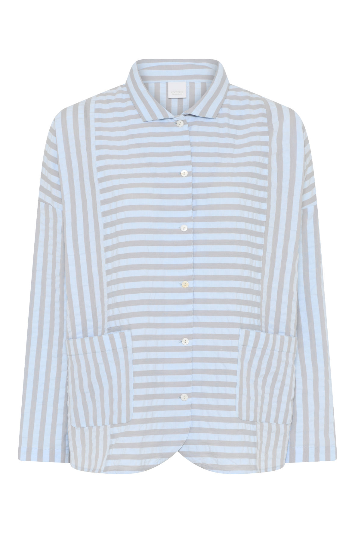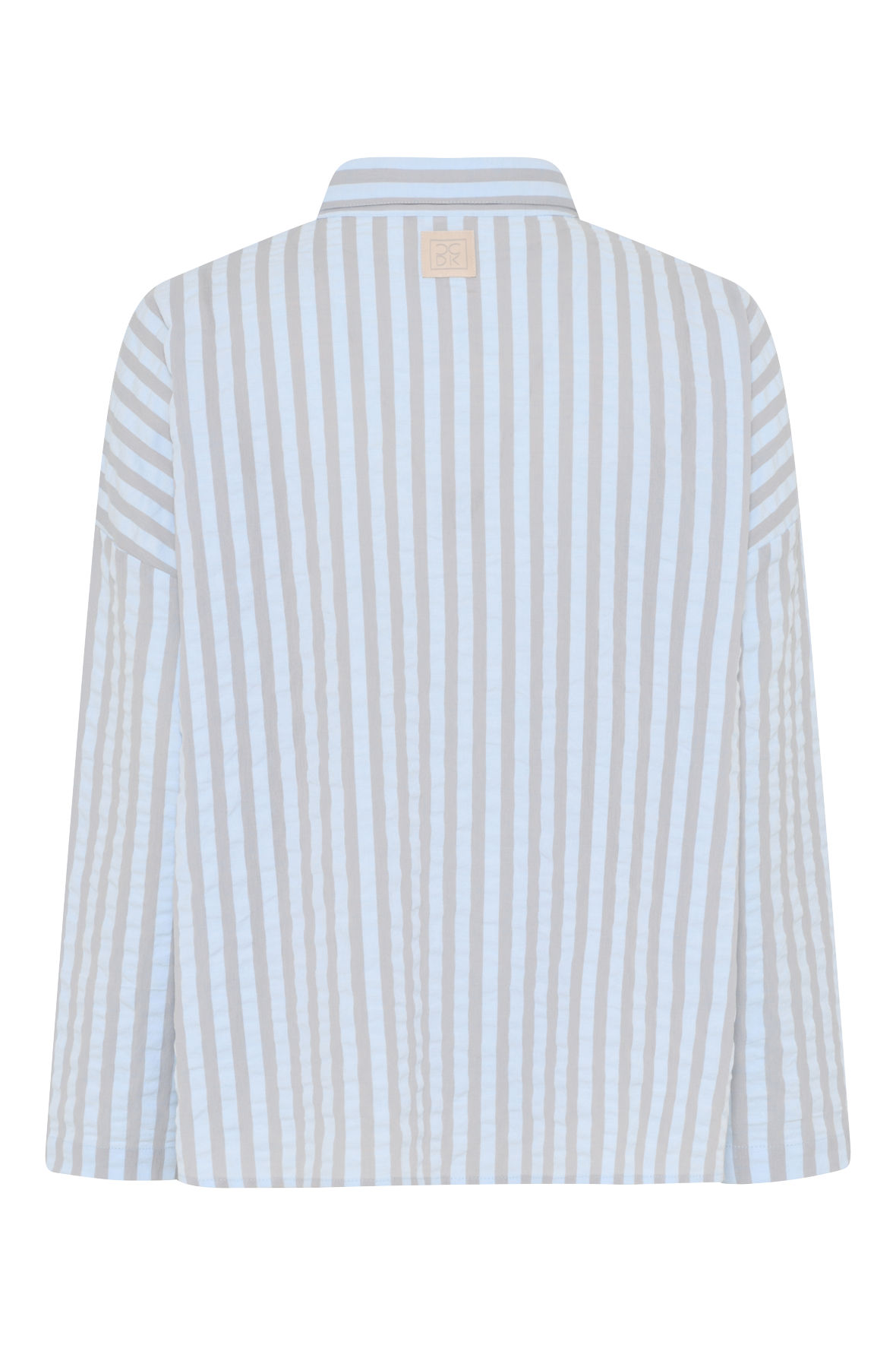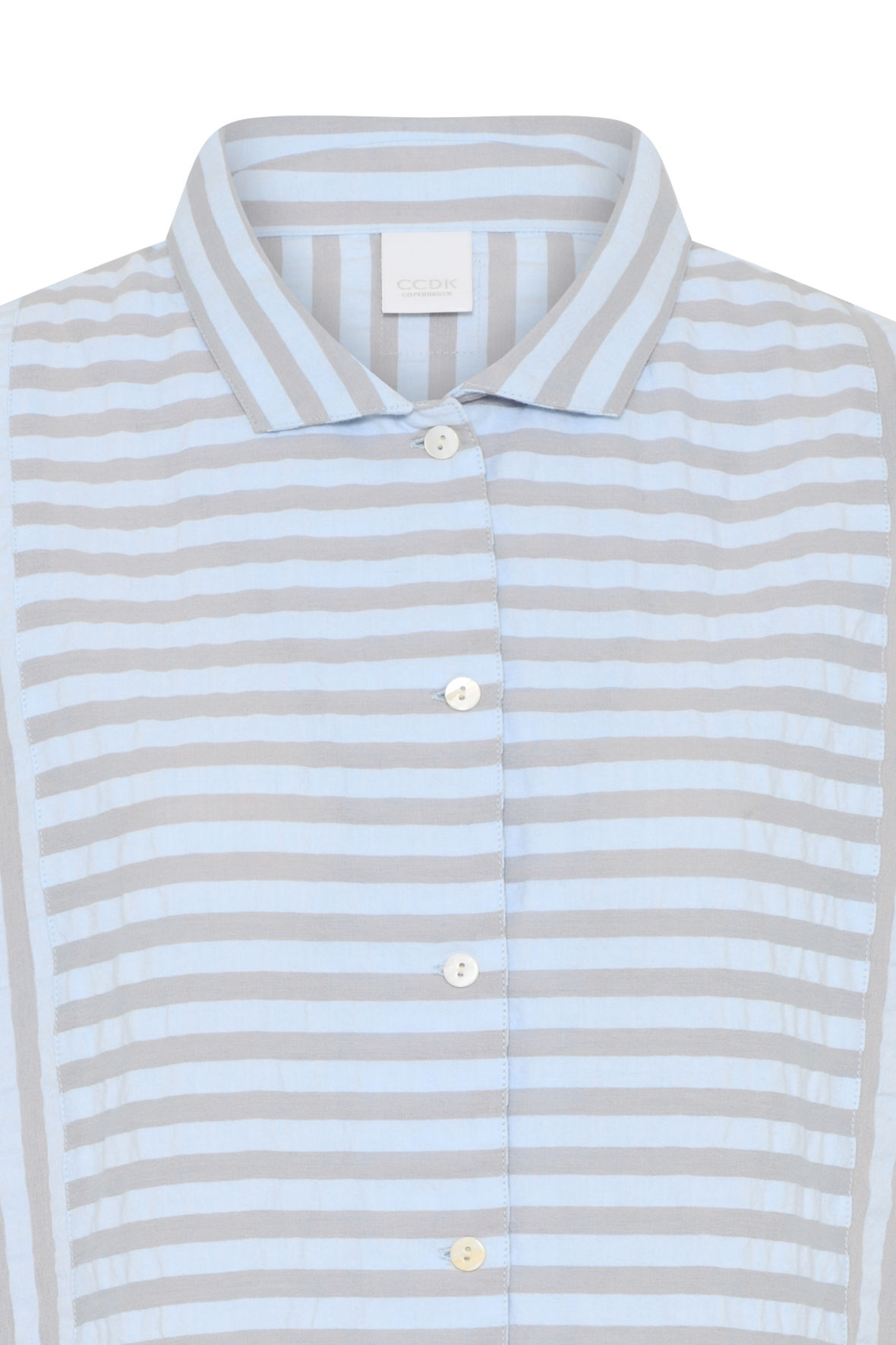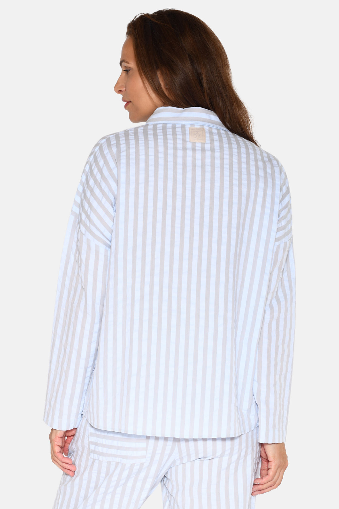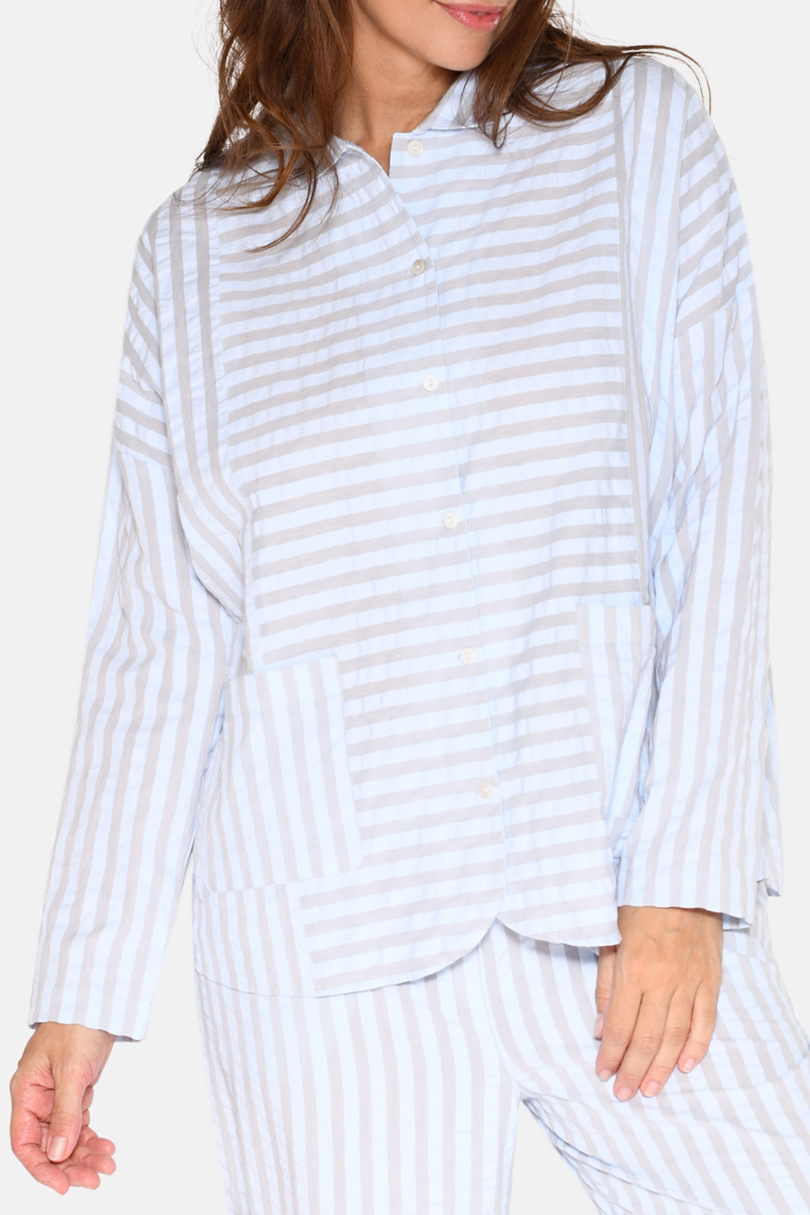 Amanda er en godt sælgende pyjamas skjorte, og laves derfor også i flere farver igen og igen. Her er den i en mere afdæmpet "artic ice stripe" altså en grå med lyseblå - flot ser det ud og lidt sødt som der er leget med stribernes orientering. Den har en feminin krave og herunder knapstolpe. Den har lange ærmer og skuldersømmen er trukket ned på overarmen. En finesse der sammen med den ekstra vidde der til barmen/i kroppen, giver det velkendte boyfriend look, lidt boxy/oversized. Og, er det ikke bare sødt lavet med påsatte ærmer.