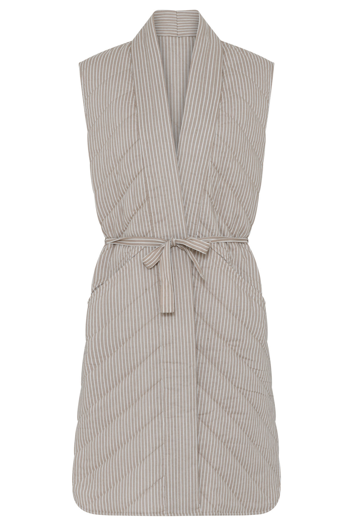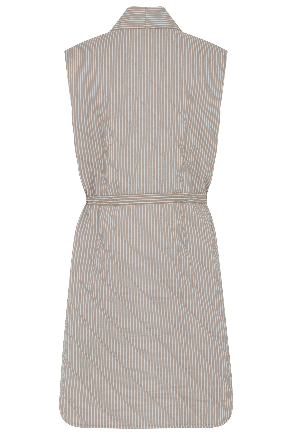 Freja er en quiltet waistcoat i sandfarve med hvide striber CCDK har valgt at kalde farven "String AOP". Den er uden ærmer men har store ærmegab. Lavet med quilt striber tone i tone på skrå i 45 gr. Den har bæltebånd i løbegang. Der er skrå paspellommer med god dybbe foran. Dejlig varm og helt genial som supplement til hyggetøjet eller nattøjet. Den er virkelig dejlig i sommerhuset eller i det hele taget bare til at forlænge hyggen op af dagen. Farveforskellen i billeder er forskellen i lyset hos fotografen.