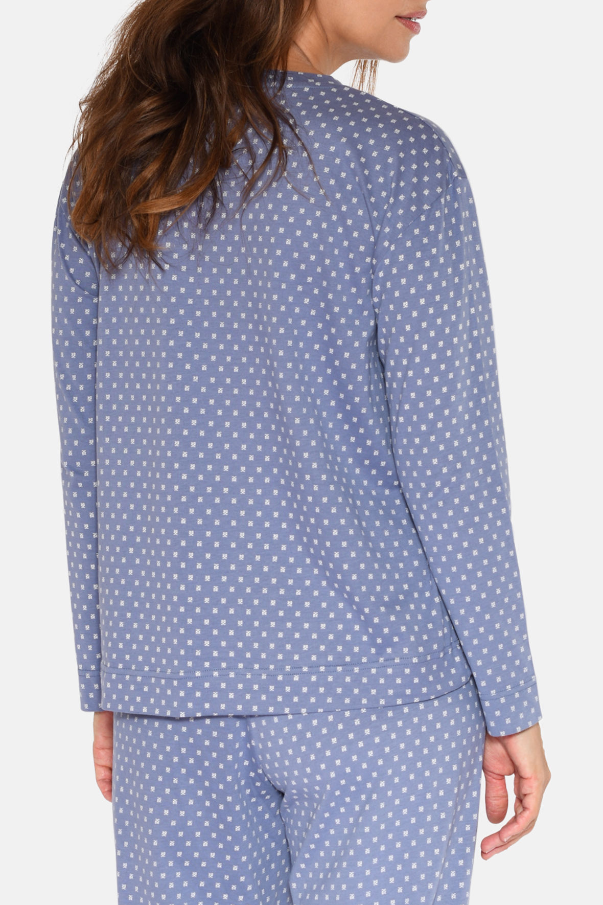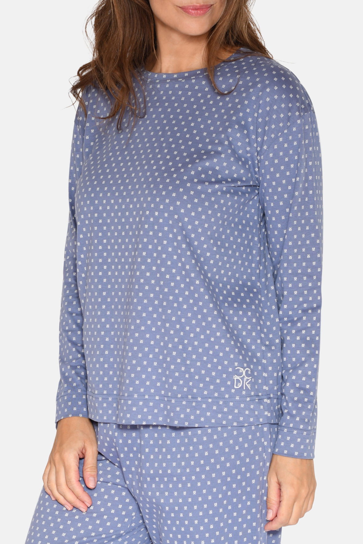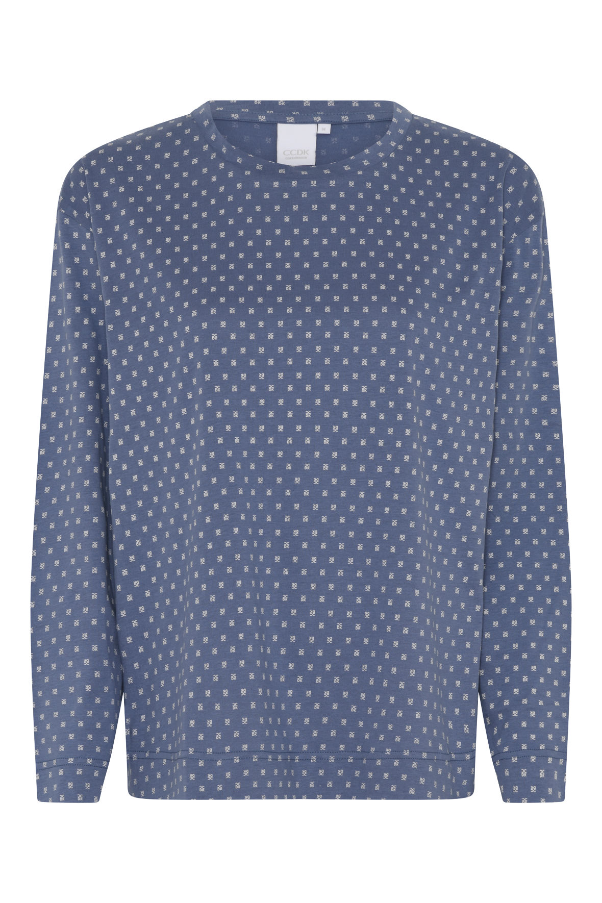 Janis er en langærmet variant af en pyjamas overdel, og kan selvfølgelig også bruges sopm hygge tøj. Du skal bare selv matche den op med hvad du lige føler for. Med rund halsudskæring, den er er blå i bunden og har CCDK print i hvidt der ligner snefnug. Lavet i økologisk bomuld for dejligt velvære. Den er temperaturregulerende og åndbar. Med løst snit.