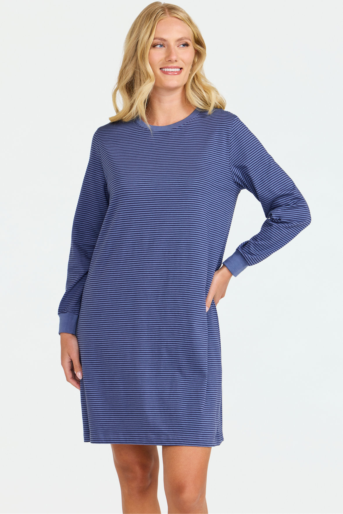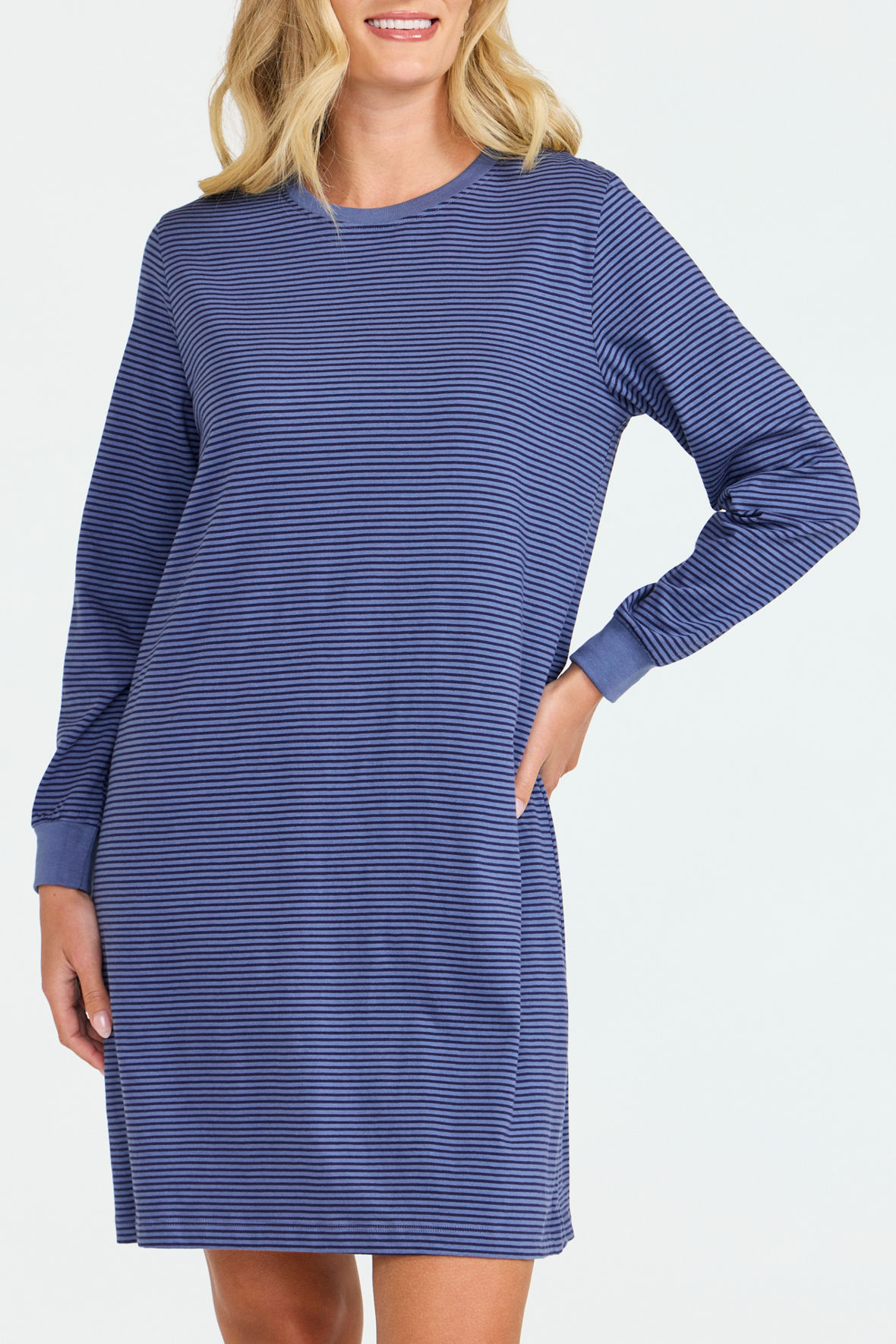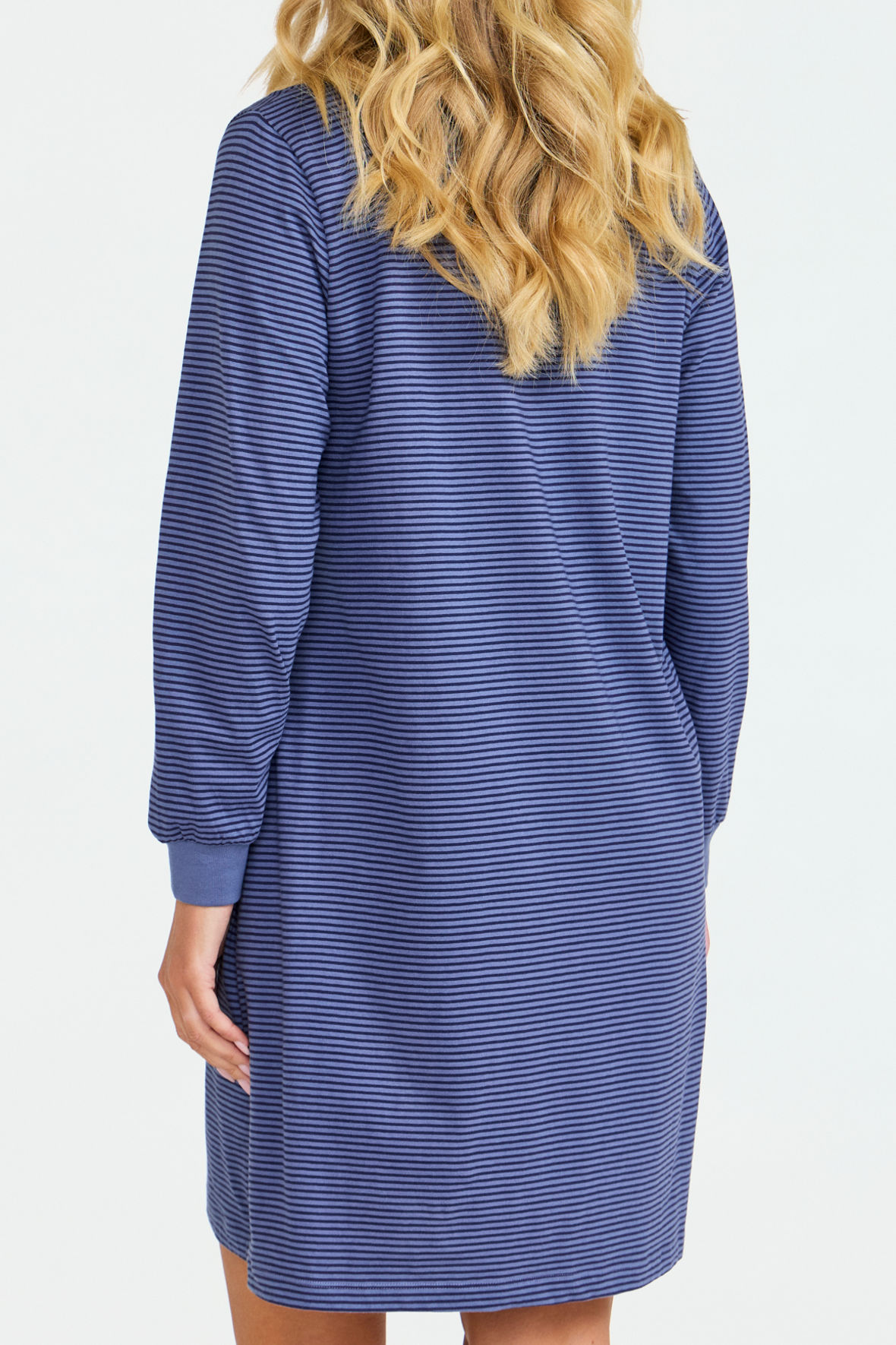 Blød og komfortabel skal være dine nøgleord når en ny natkjole skal erhverves. Damella er så god til nattøj, de ved hvad der er på spil. Nattkjolen her er i økologisk bomuld, fin let kvalitet der åndbar og rar mod den bare hud. Designet er to tonet blå, lys i bunden med en mørkere stribe. Rund udskæring i halsen, lårlangt snit og lange ærmer. Rigtig sød ikke ;-)