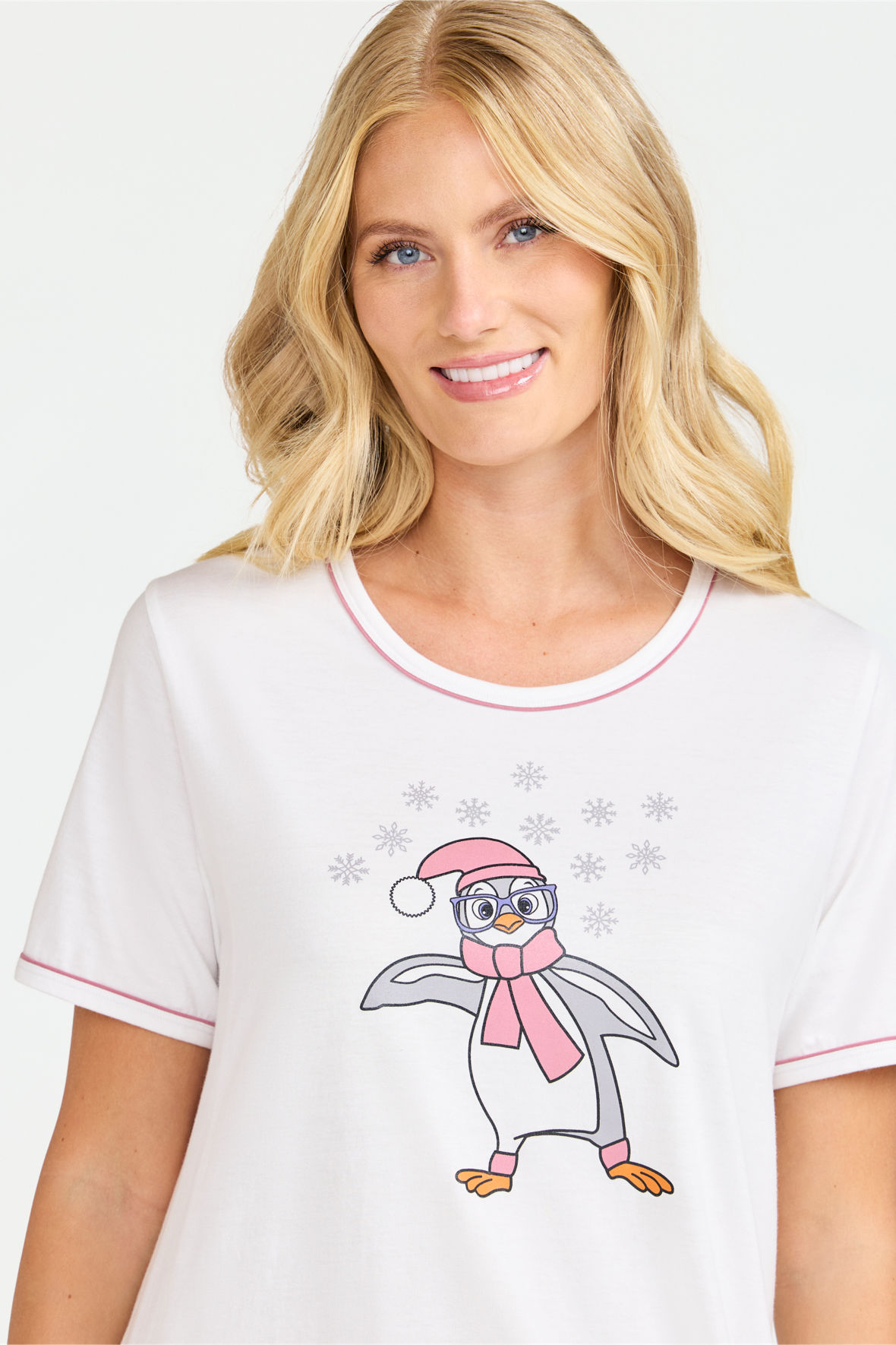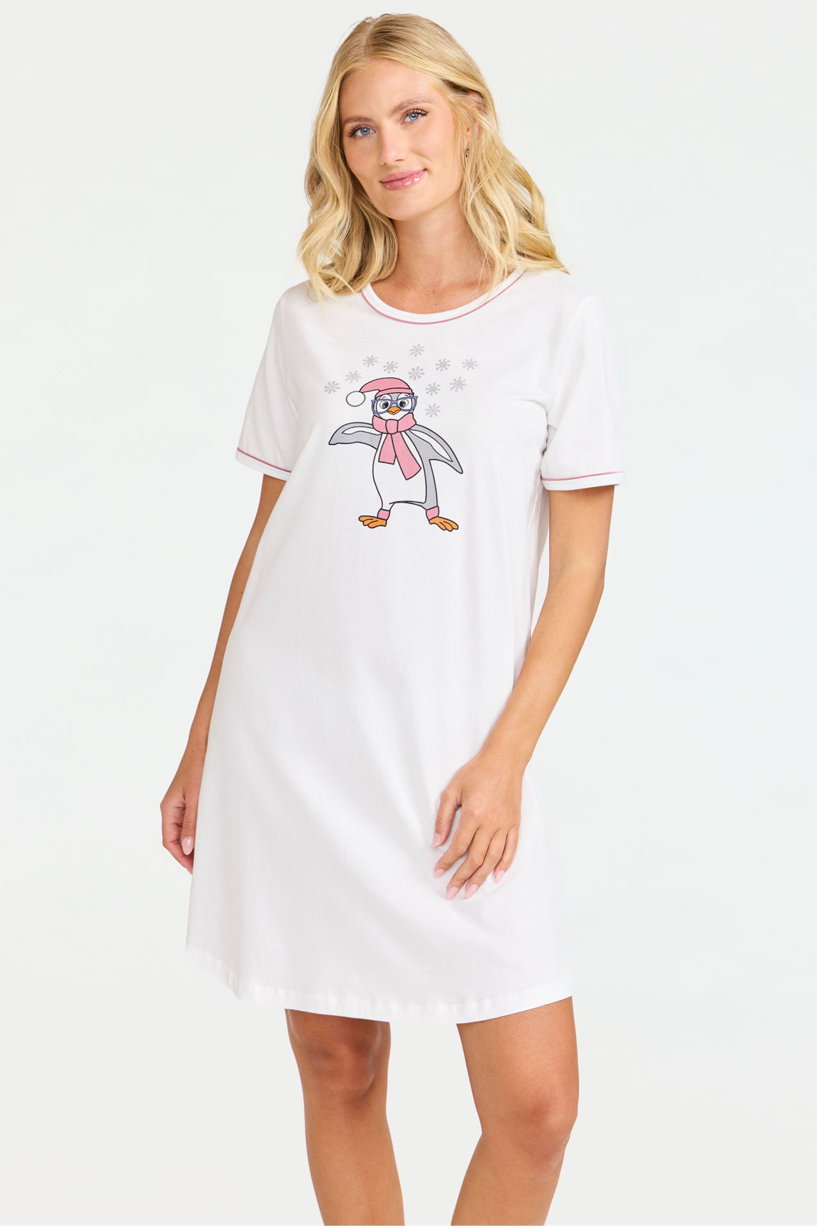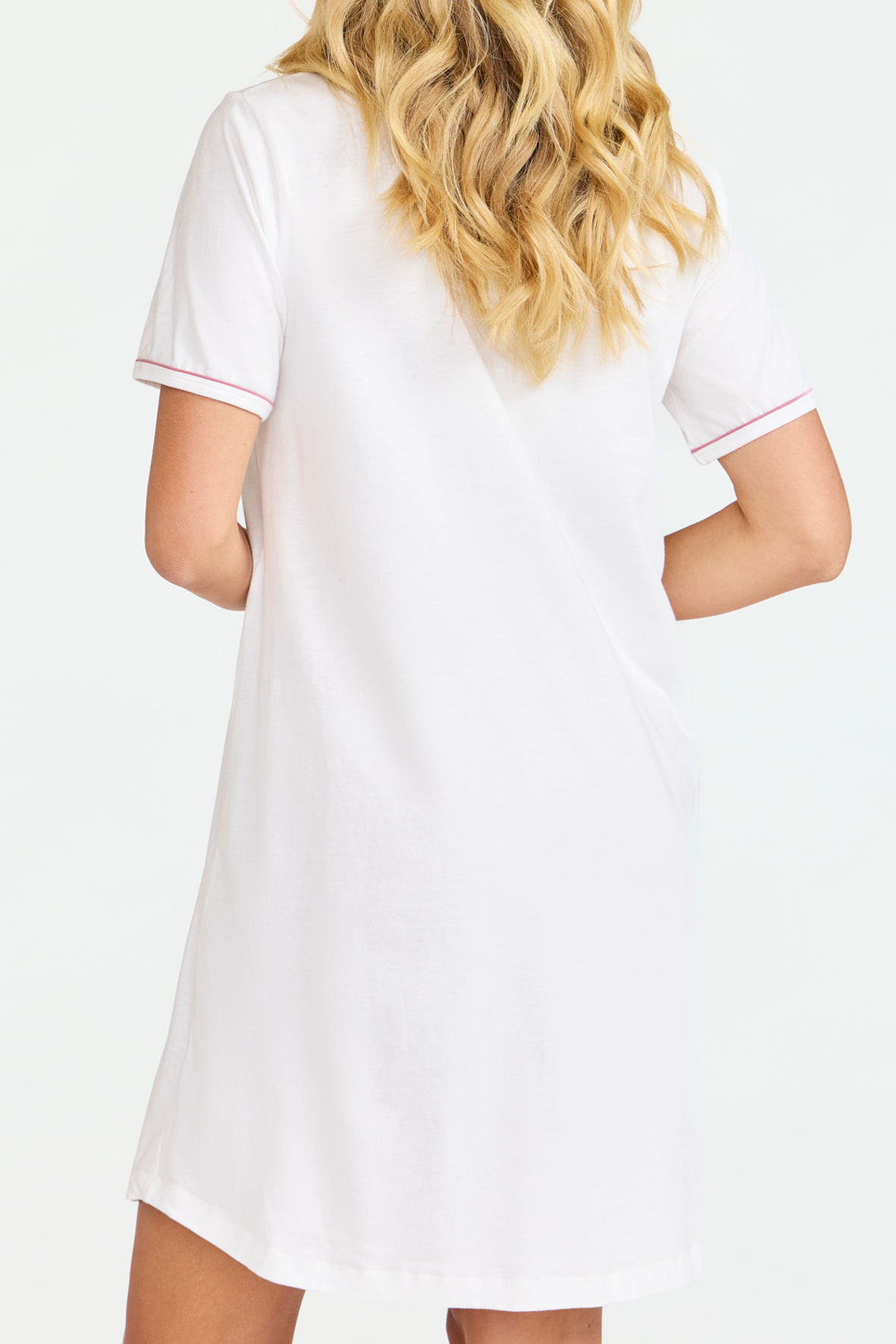 Natkjole der slutter over knæ med et virkeligt sødt print og er ellers ensfarvet. Med rund udskæring i halsen hvor den har lille kontrast piping, den har korte ærmer igen med farvet piping. Kvaliteten er naturligvis let og blød ren bomuld der giver en fortræffelig komfort uanset om du har det varmt eller koldt, det et det bomulden kan.