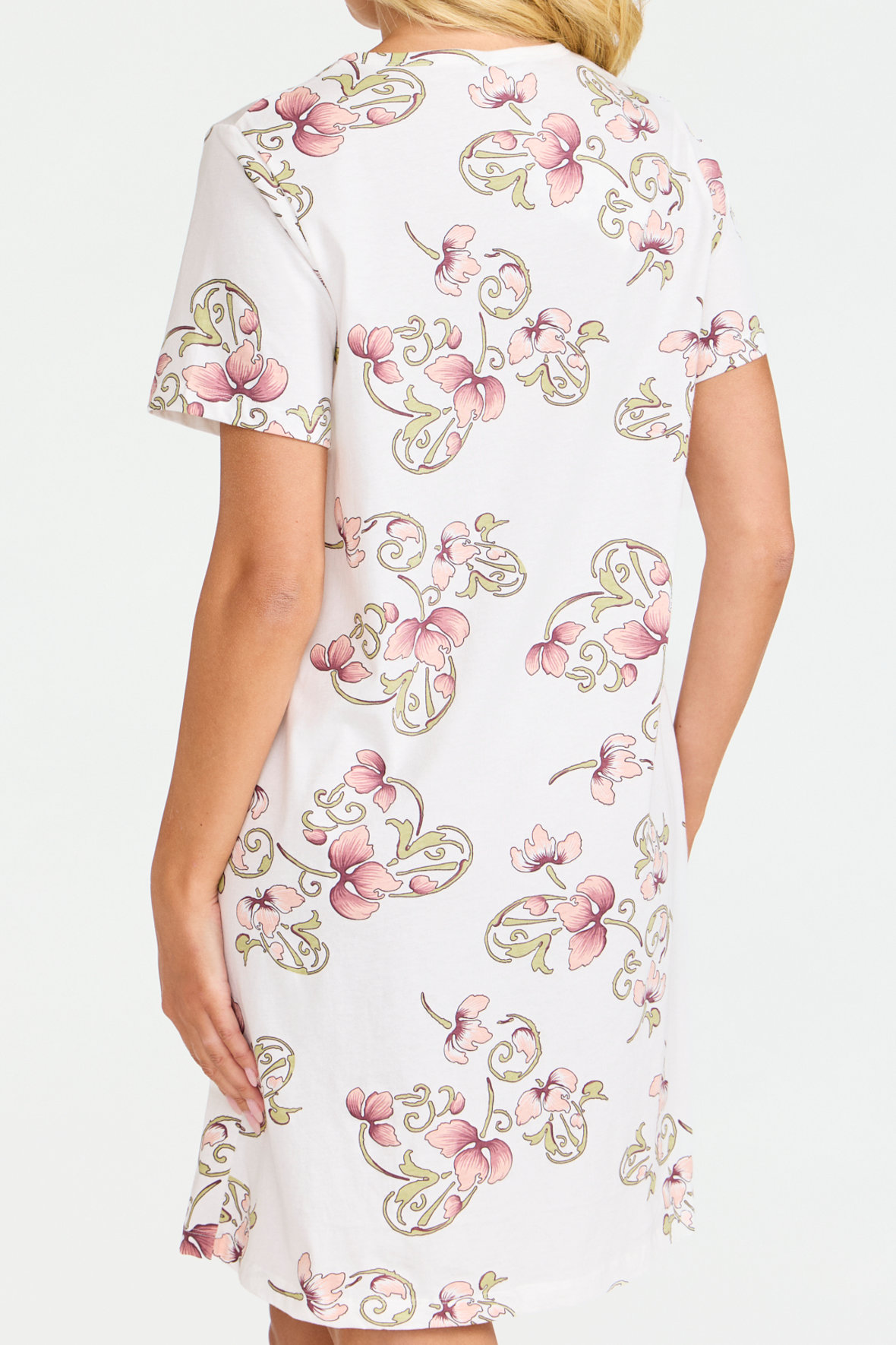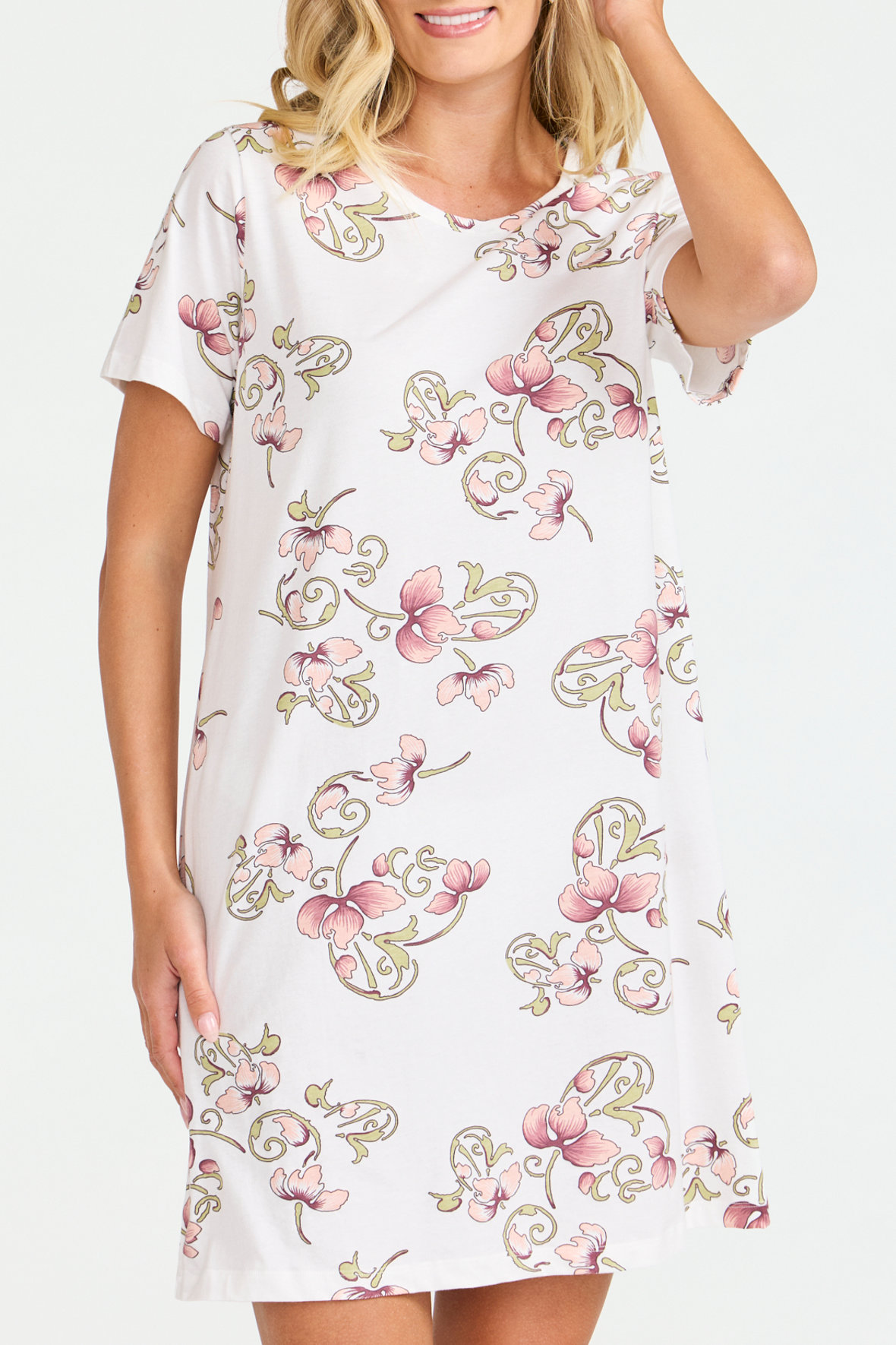 Natkjole der slutter over knæ med print der har hentet inspirationen fra blomsterverdenen. Med rund udskæring i halsen samt korte ærmer. Kvaliteten er naturligvis let og blød ren bomuld der giver en fortræffelig komfort uanset om du har det varmt eller koldt, det et det bomulden kan.