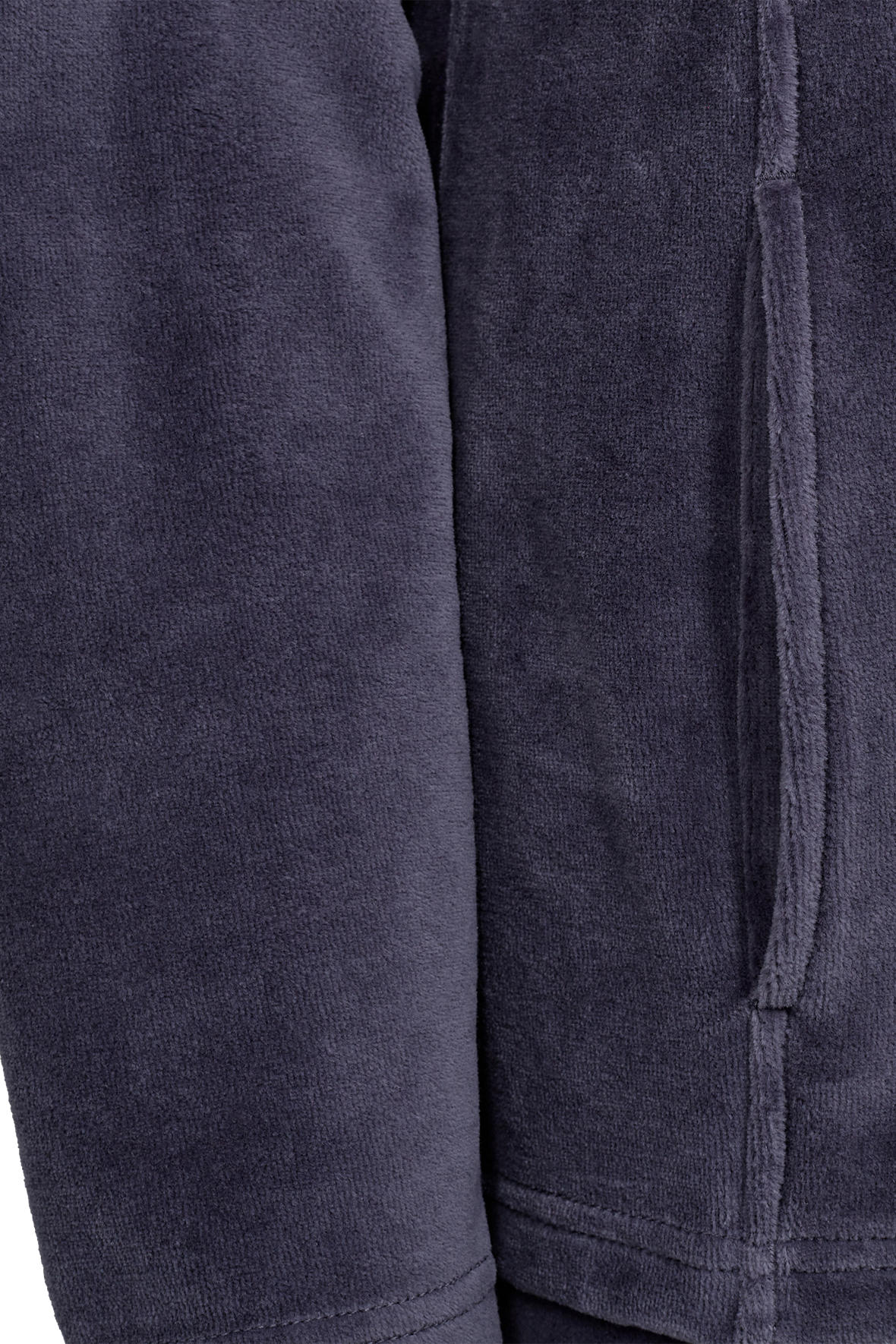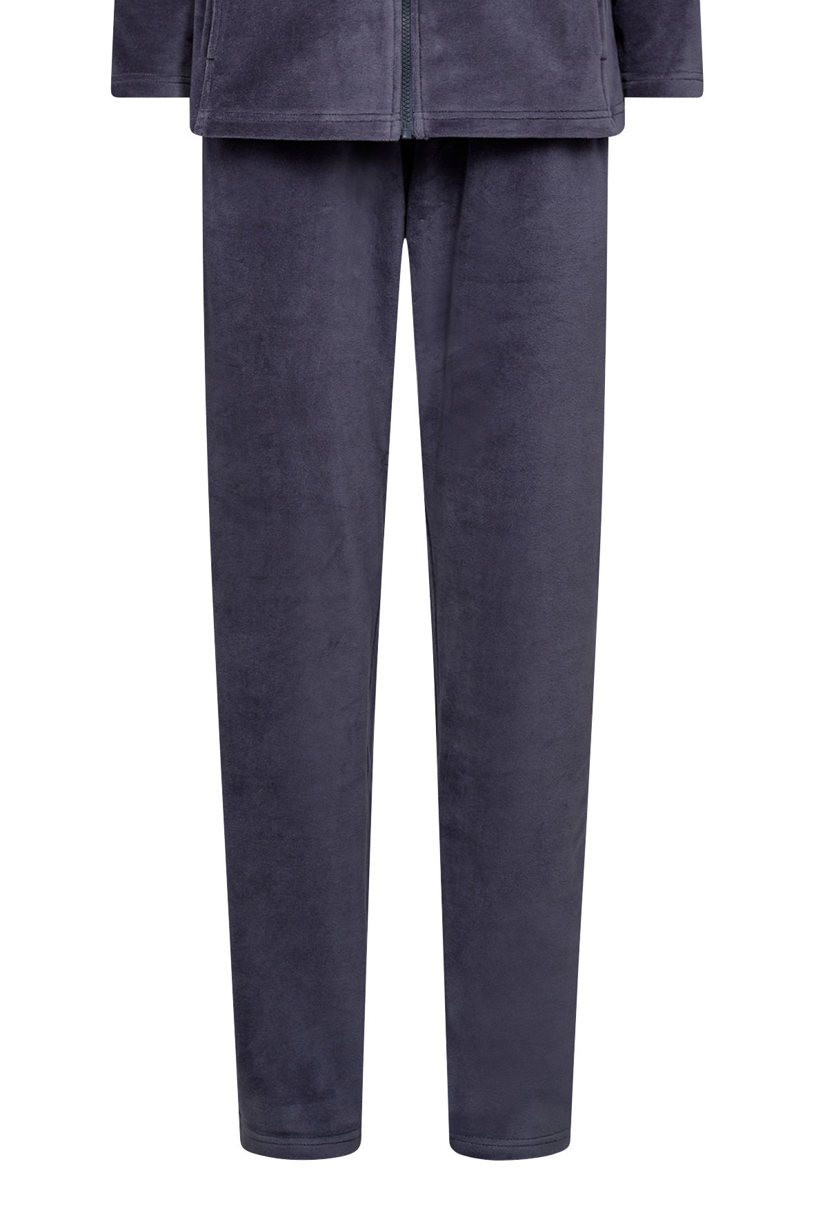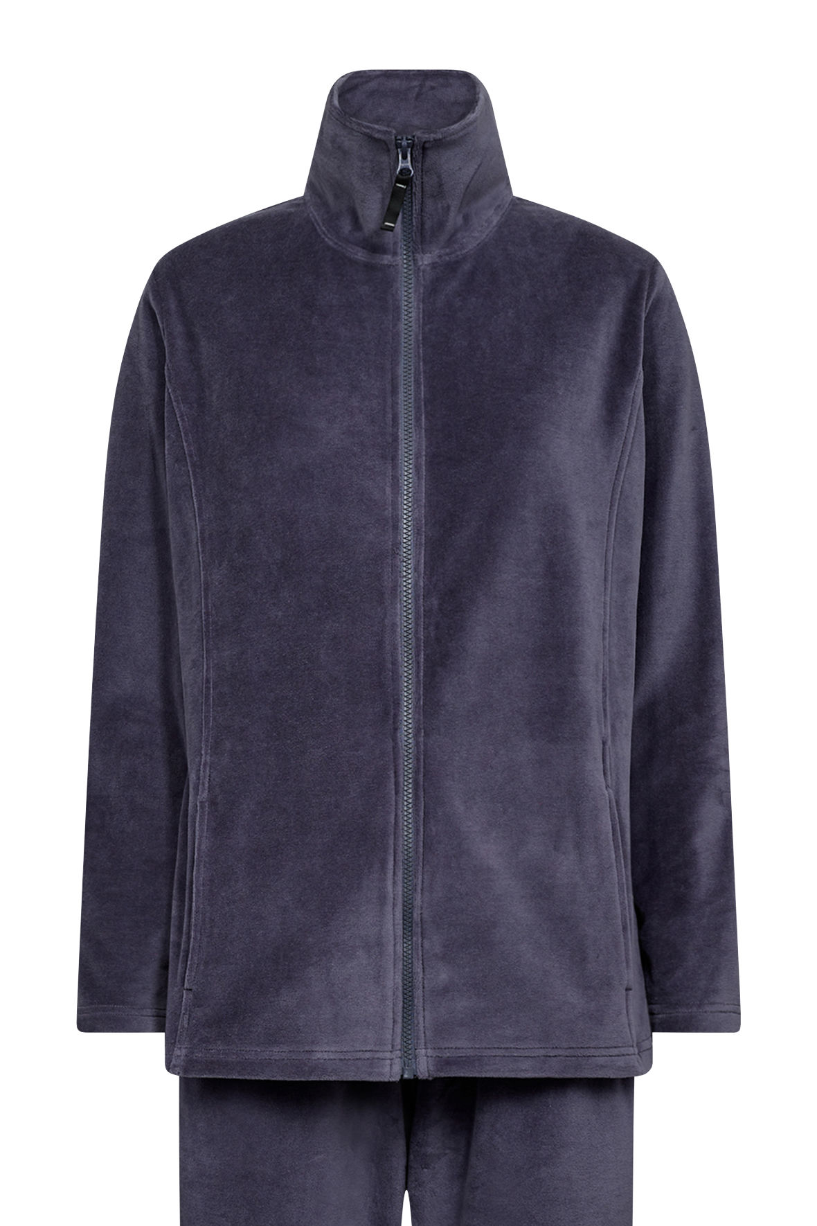 Decoy HomeWear velour dragt, hjemmesæt og hyggetøj og hvad kan det snart kaldes mere. Blød velour lavet i to dele. Overdel med lynlås og høj hals, den har syninger der virker slankende for figuren og i disse syninger er der placeret to lommer. Ærmerne er lange. Bukserne er med elastisk linning med satinbånd i skjult løbegang, de har lommer i siden. Ben med løst snit og fuld længde. Overdel og underdel er ensfarvet.