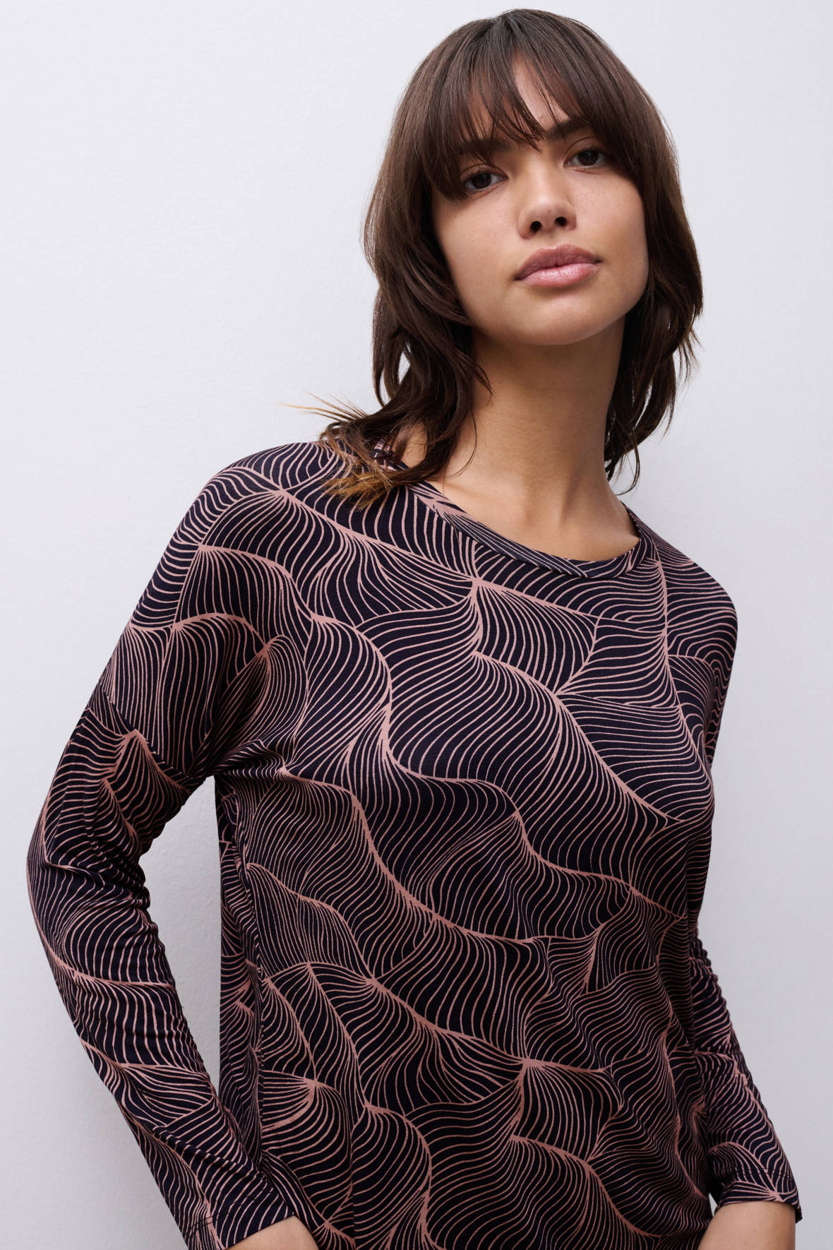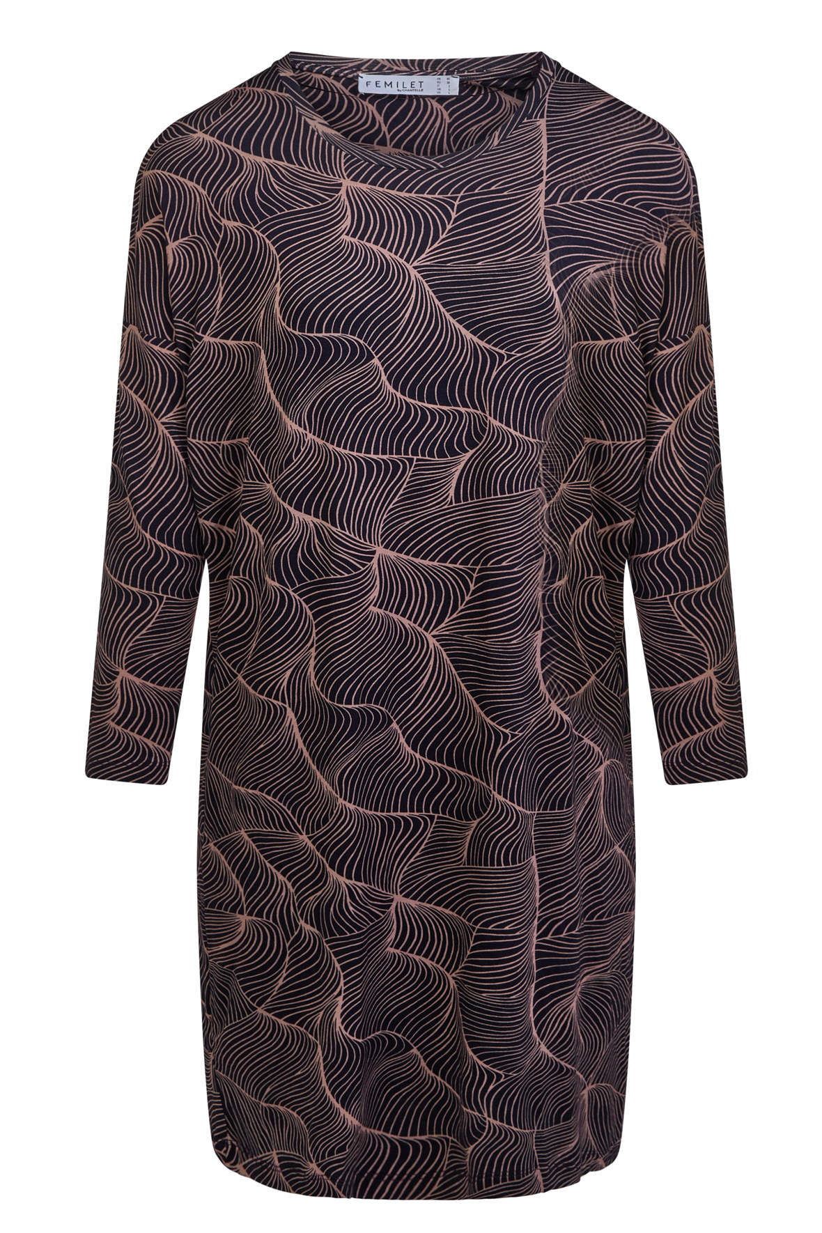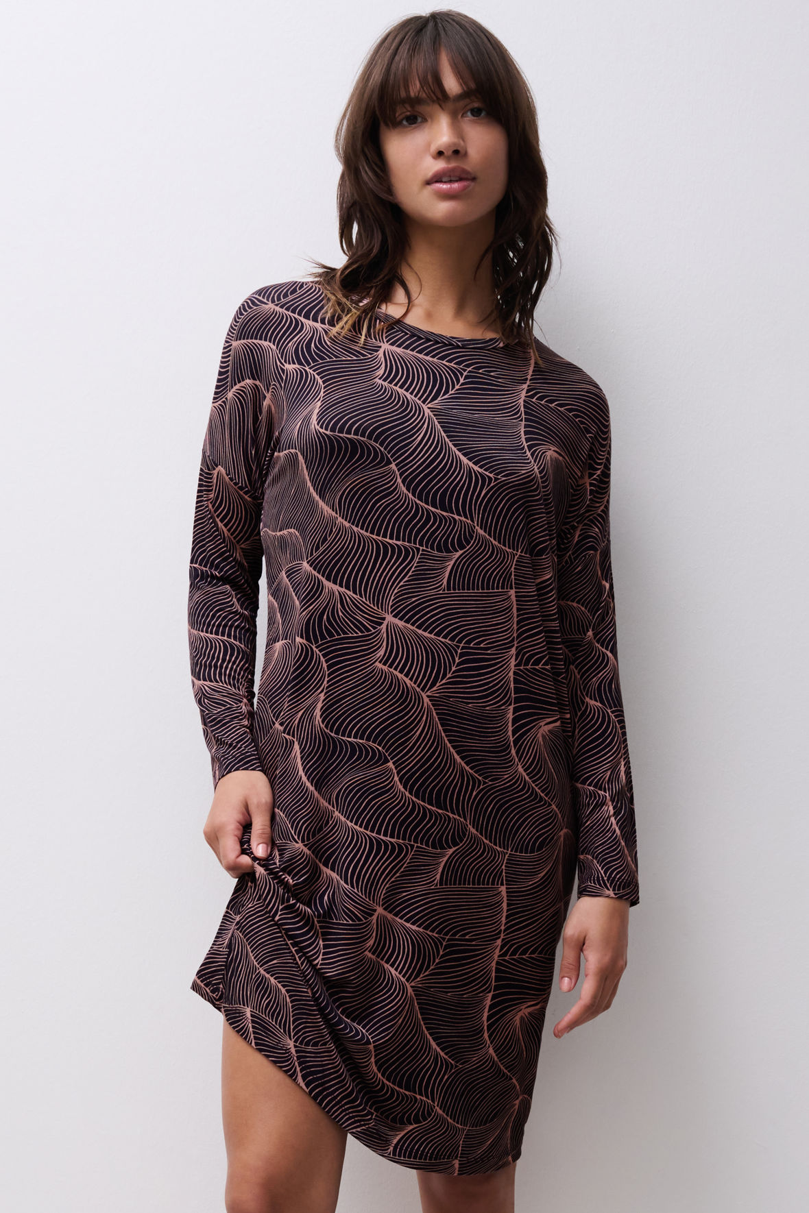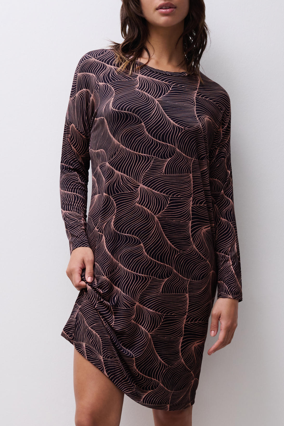 Den gode nattesøvn starter med nattøjet. Femilet by Chantelle har fat i den lange ende ved at benytte EcoVero viskose, det bliver ikke bedre. Her får du silkens egenskaber, temperaturregulering, det bløde mod huden og åndbarheden. Natkjolen er med rosa bladprint inspireret motiv på mørkeblå bund. Har rund halslinje samt lange ærmer hvor skuldersømmen er trukket ned på overarmen. Smuk løs pasform med længde til knæ.