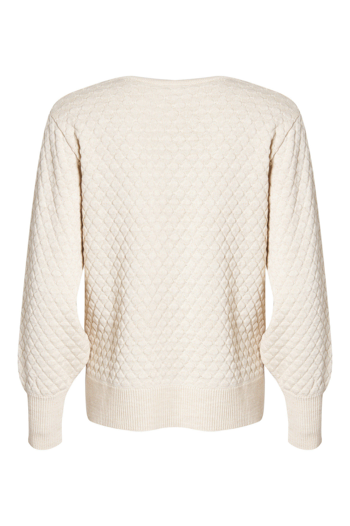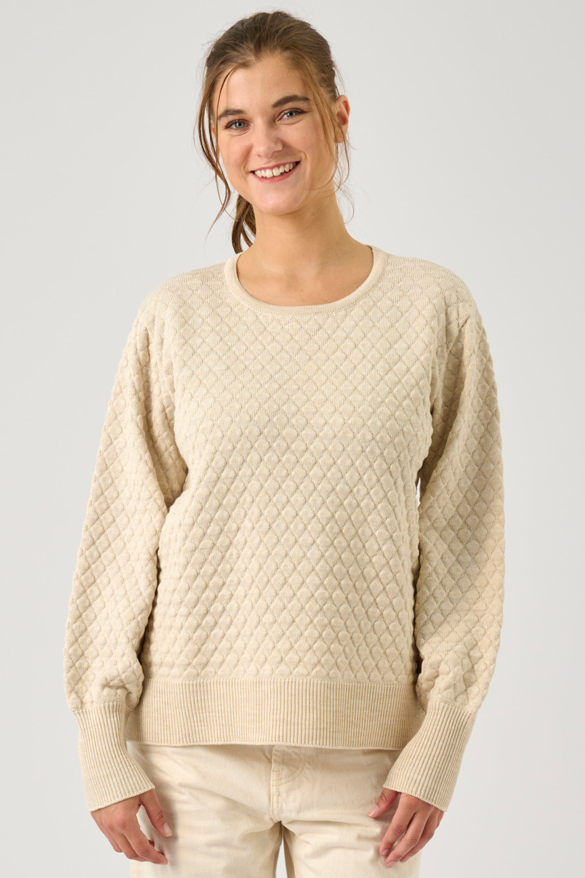 Med LiMarian er du landet på en afslappet casual strik med mønster i en flot Natur farve. Den har løs pasform og har ribstrik på kanter, rund i halsen og med en lidt bredere kant ved hofter og ved håndled. En varm kvalitet der er lavet i blandet uld og akryl som også gør den form stabil og holdbar. den beholder også farven. Den er lækker at trække i året rundt hævet over trends, ja en klassiker. Straight snit der sidder løst.