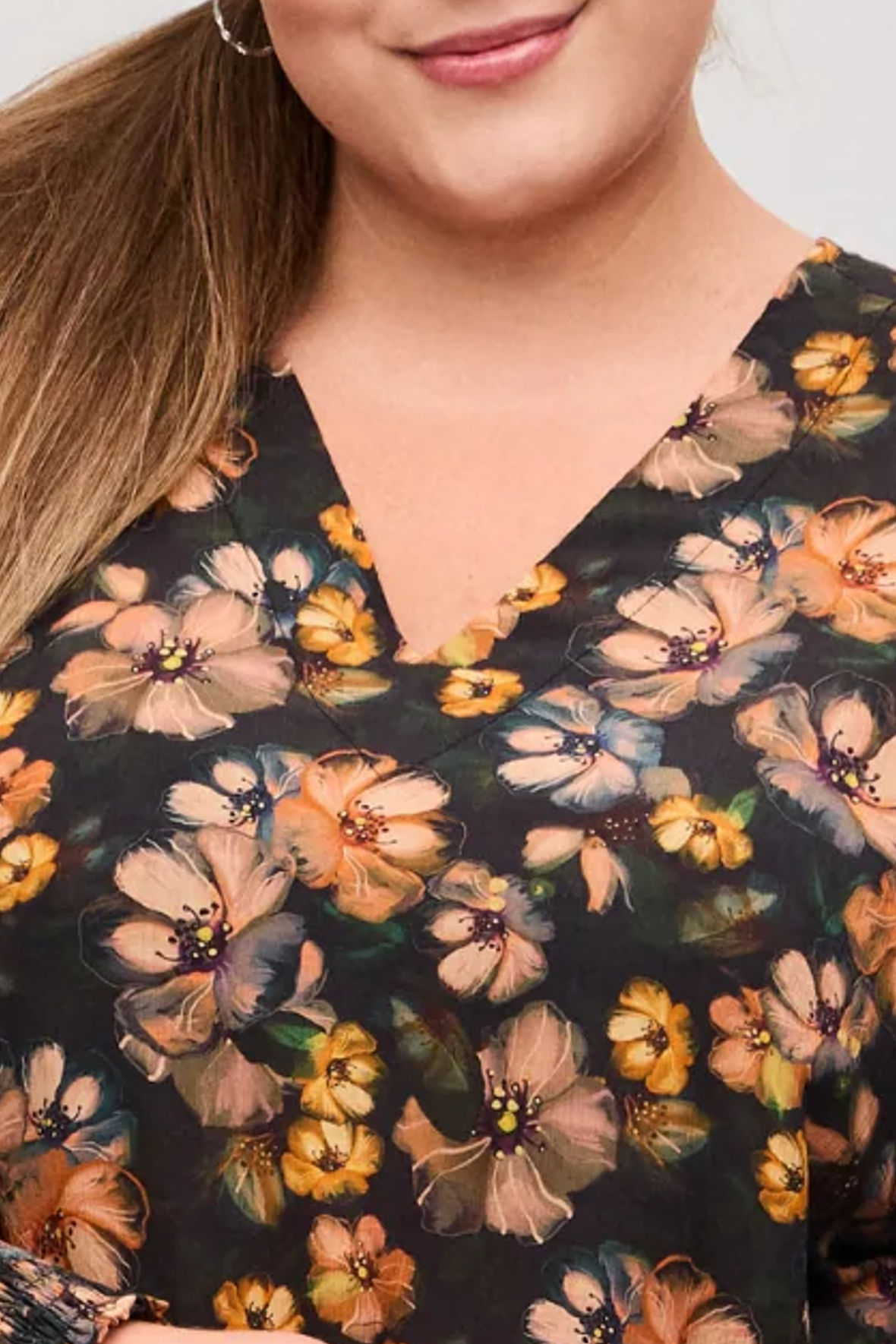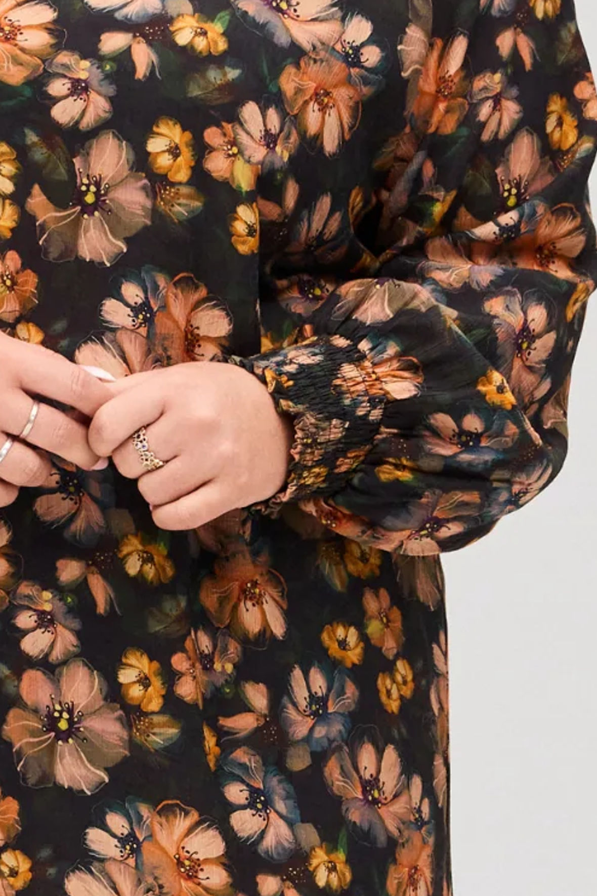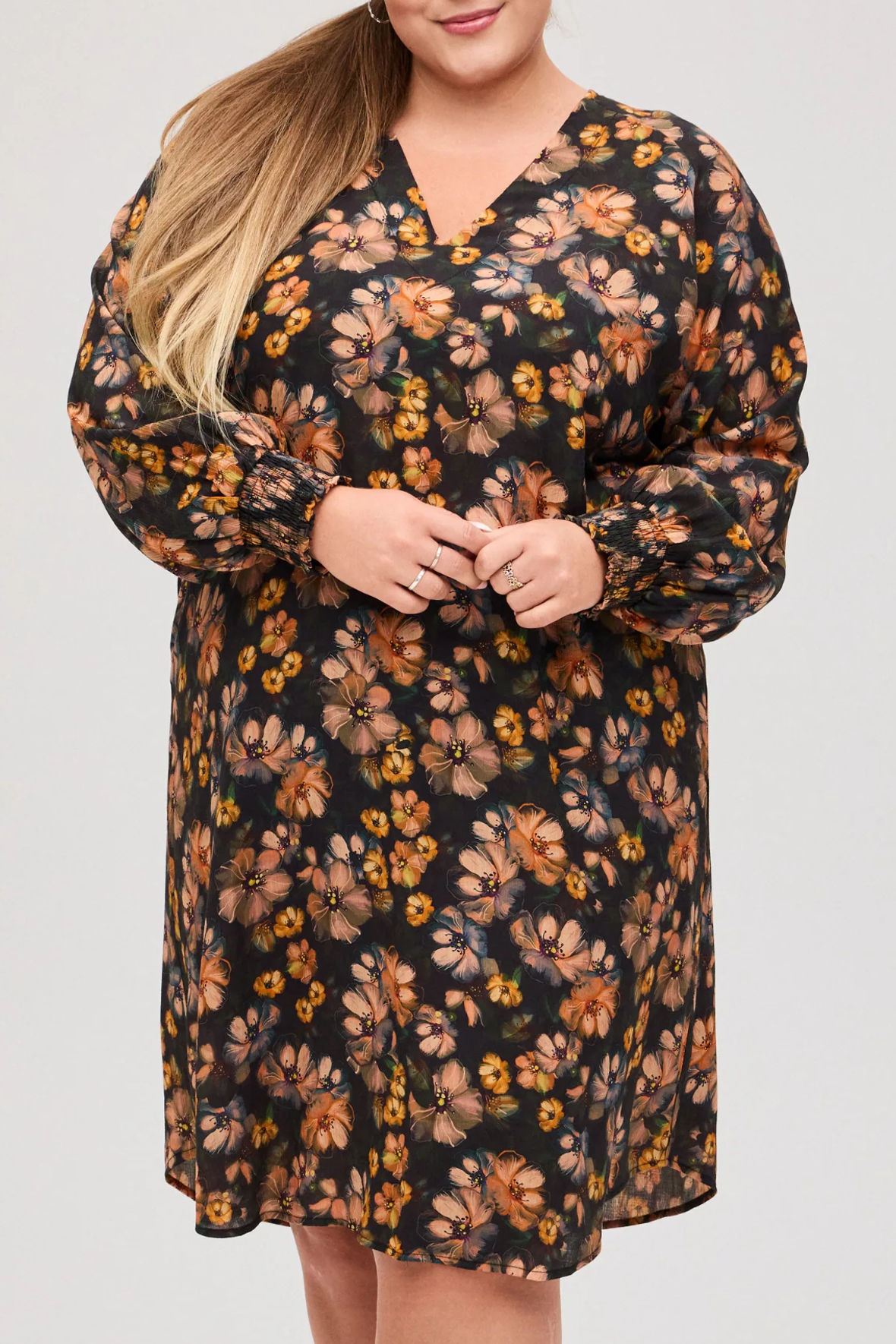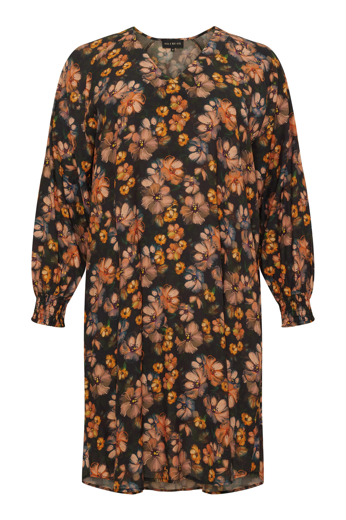 Blomstret kjole i crepe bomuld, der er lavet fin og let. Den har V-hals og raglan ærmer med smock elastik manchet. Den falder helt løst og har ingen indsnit, skillesøm eller overskæring. Med en længde der slutter lige under knæ.