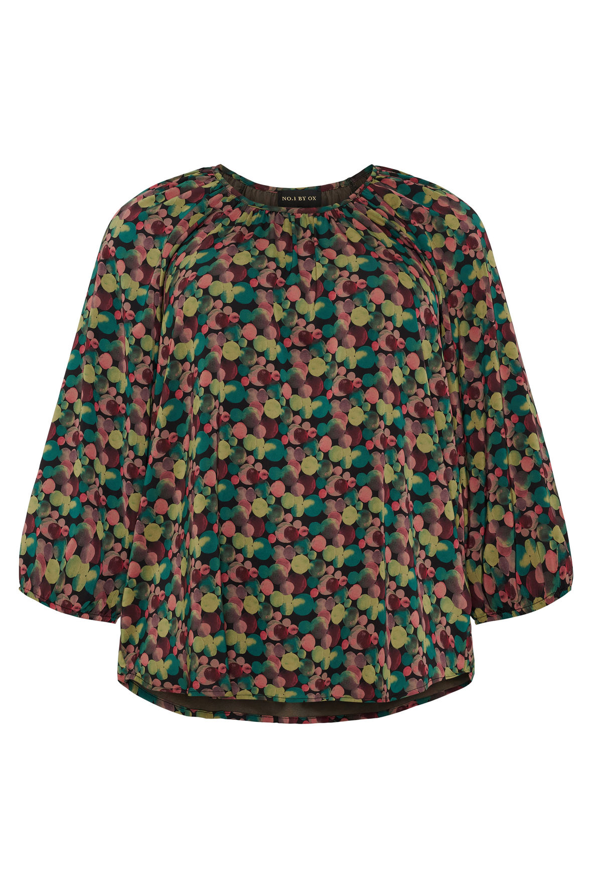 Er den ikke bare så flot den her bluse. Flot farve sammenspil med bobleprint. Den har rund udskæring i halsen med masser af små rynker der går vejen rundt. Ærmer er 3/4 lange og hæftet som raglan i halsudskæringen, de har god plads. Den ender løst ved hofter hvor den runder og går op i siden, et fif der giver visuelt længere ben. Hele snittet er løst og den opleves som let og luftig. Elegant kvalitet der ikke krøller, mister farve eller facon.
