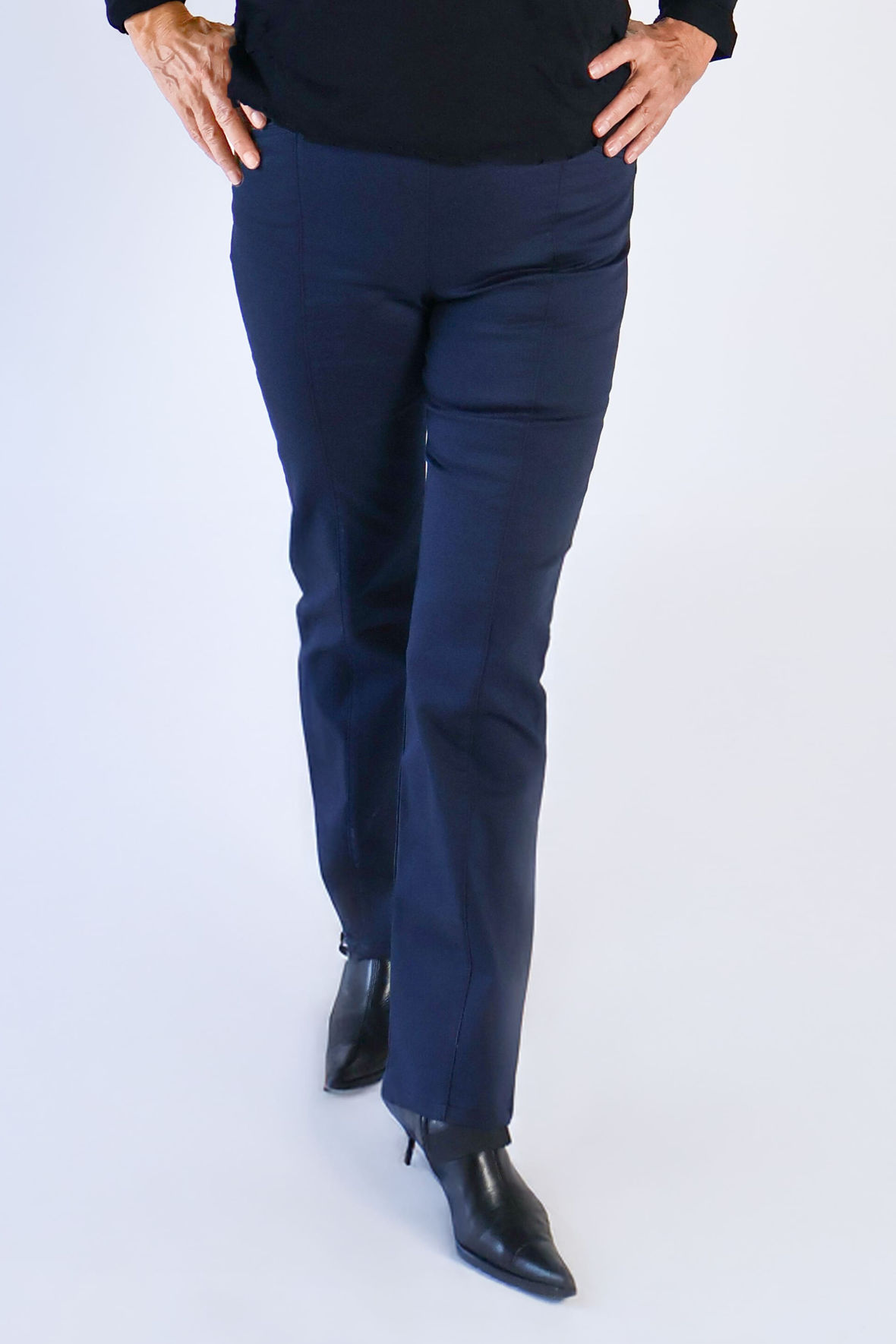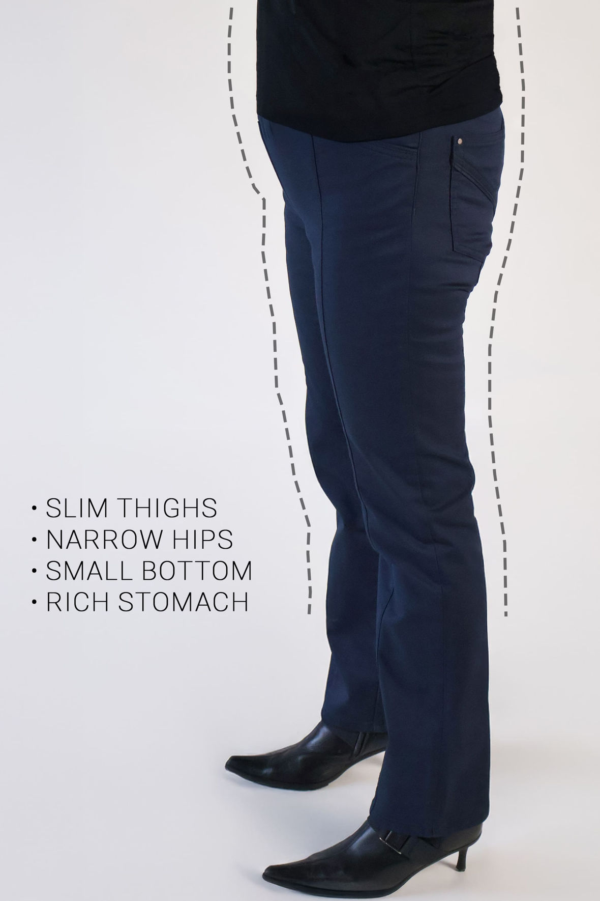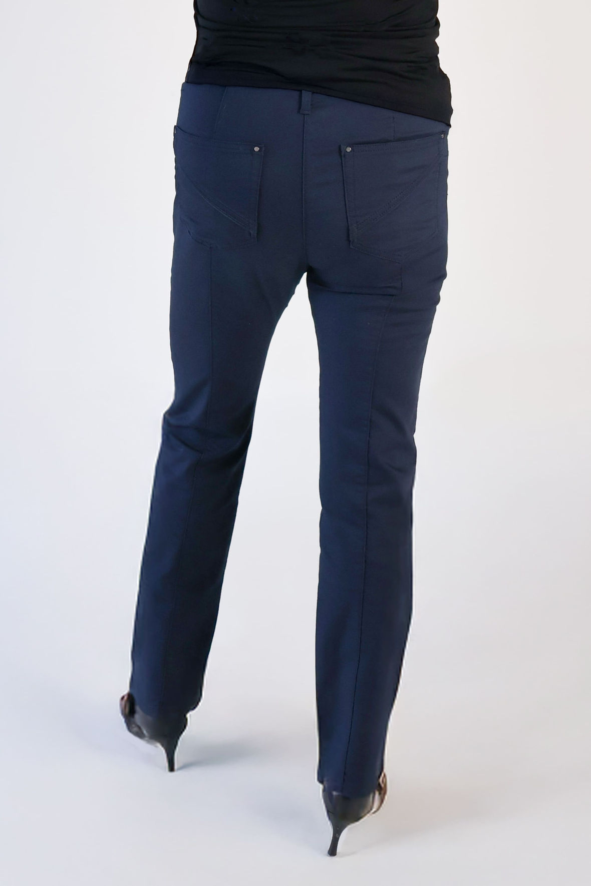 Slender modellen Rouge Regular i den så altid flotte mørkeblå er noget smallere end de øvrige modeller. Du vil gerne have smalle hofter, slanke lår, stadig med plads til lægge og knæ men med smallere snit til numsen. Og, har du lidt med maven, har den rigelig rummelighed her. Den har elastisk linning der er bred så den ikke graver sig ind. Den har for- og baglommer så der er ingen kompromiser her. Den er ikke udstyret med knap, gylp og lynlås - det vil du elske, det øger virkelig komforten. Bæltestropper skal du ikke undvære. Baglommer har skrå stikning som har en god indvirkning på numsen. Lodrette på kår giver dig en flot silhuette. Kvaliteten er let og elastisk.